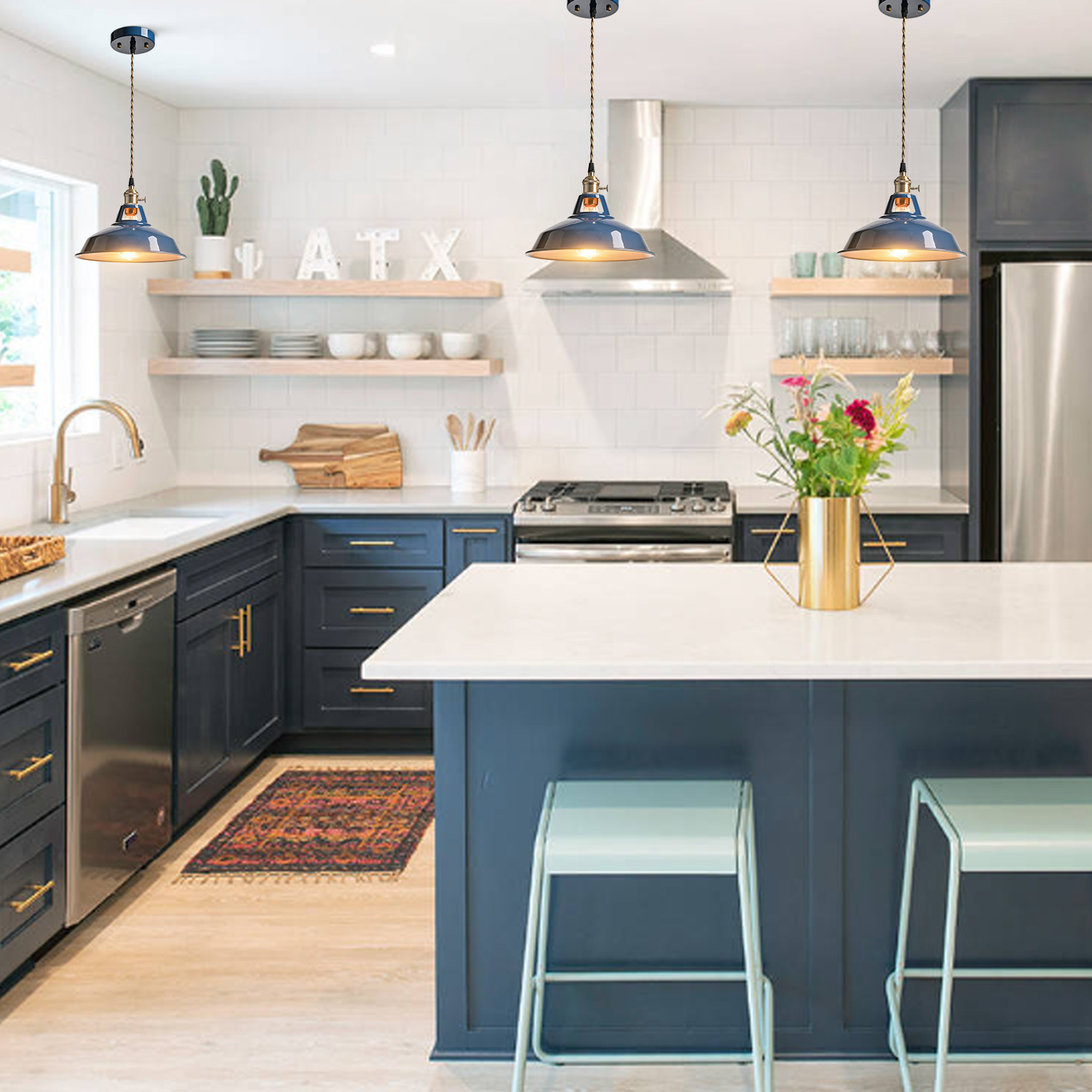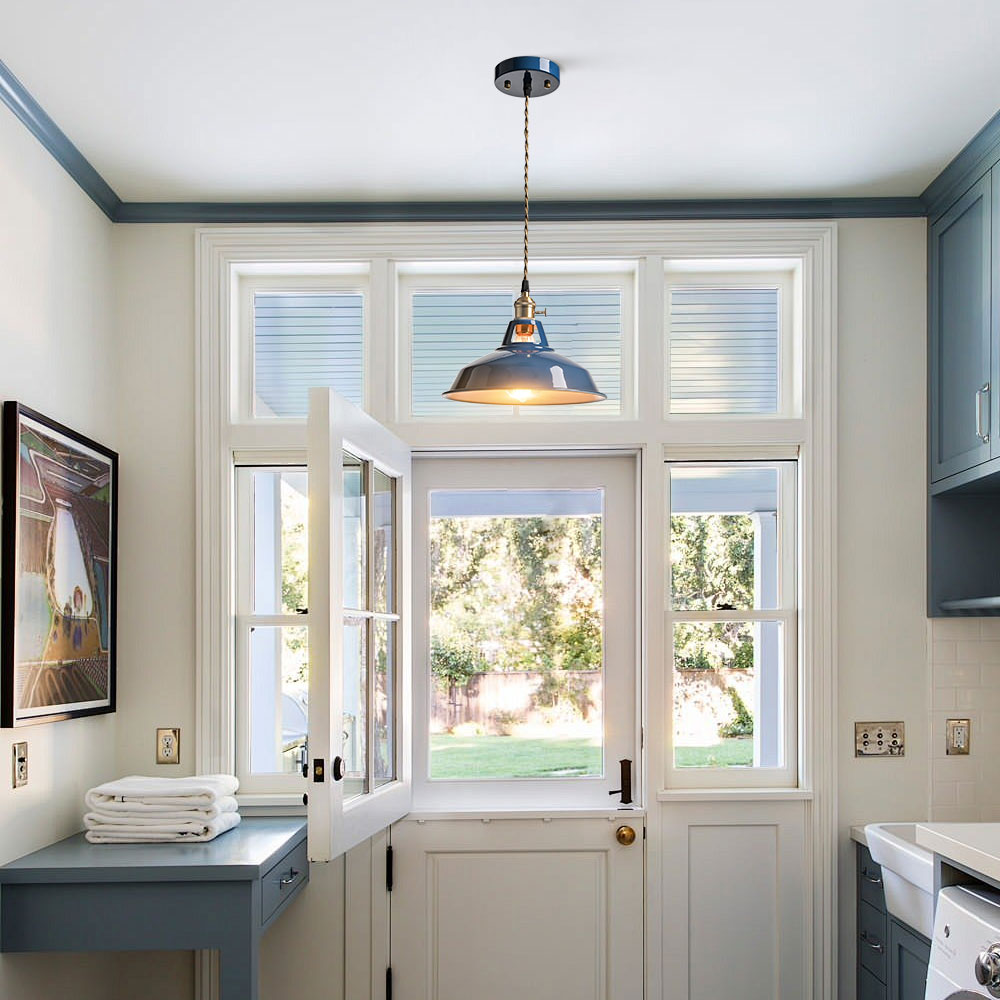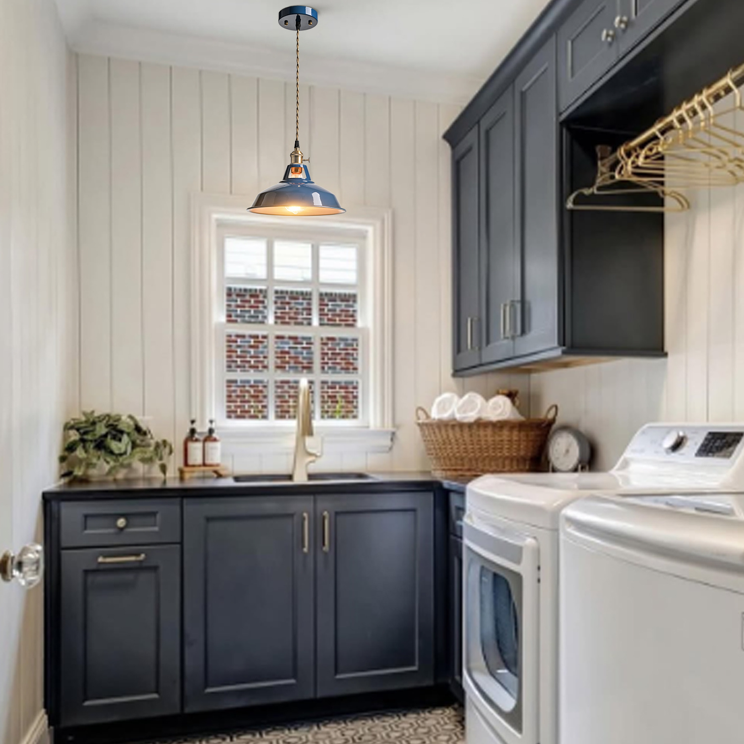 The modern pendant light’s barn shade and canopy show off a blue finish while its lamp holder, rotary switch, and hanging cord flaunt a gold finish. The white interior of the barn shade helps reflect the light. A mix of finishes encompasses both a dash of drama and a touch of shimmer, yet maintains a modern edge. Its blue finish gives your home a snappy look and a glamorous, refreshing vibe. Its shiny gold finish offers a stark contrast to the blue finish and adds alluring eye appeal to the space. Feel free to turn on/off the pendant light with the rotary switch on the lamp holder. It comes with a 59-inch adjustable cord to suit your different lighting needs.