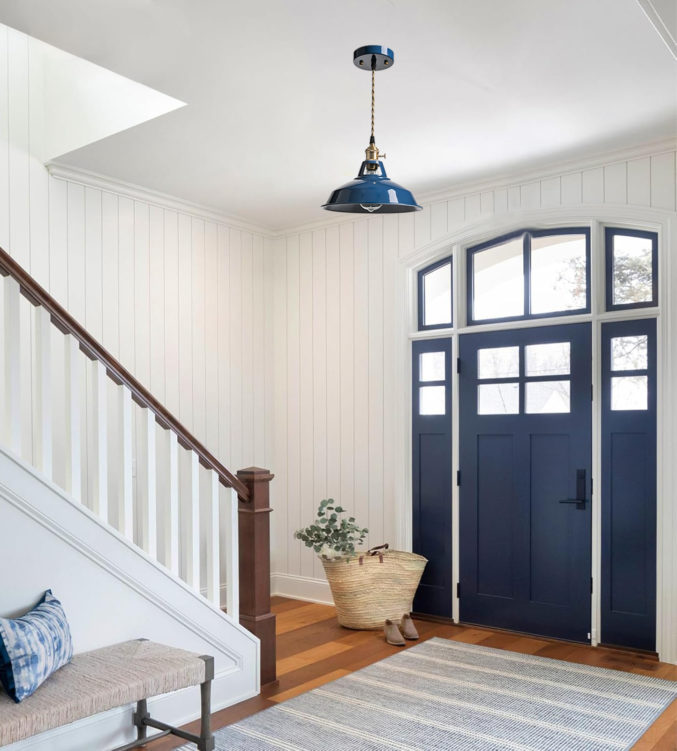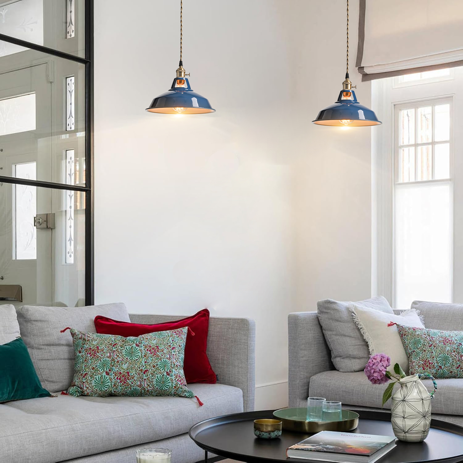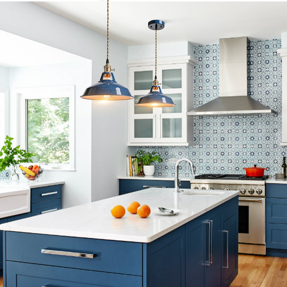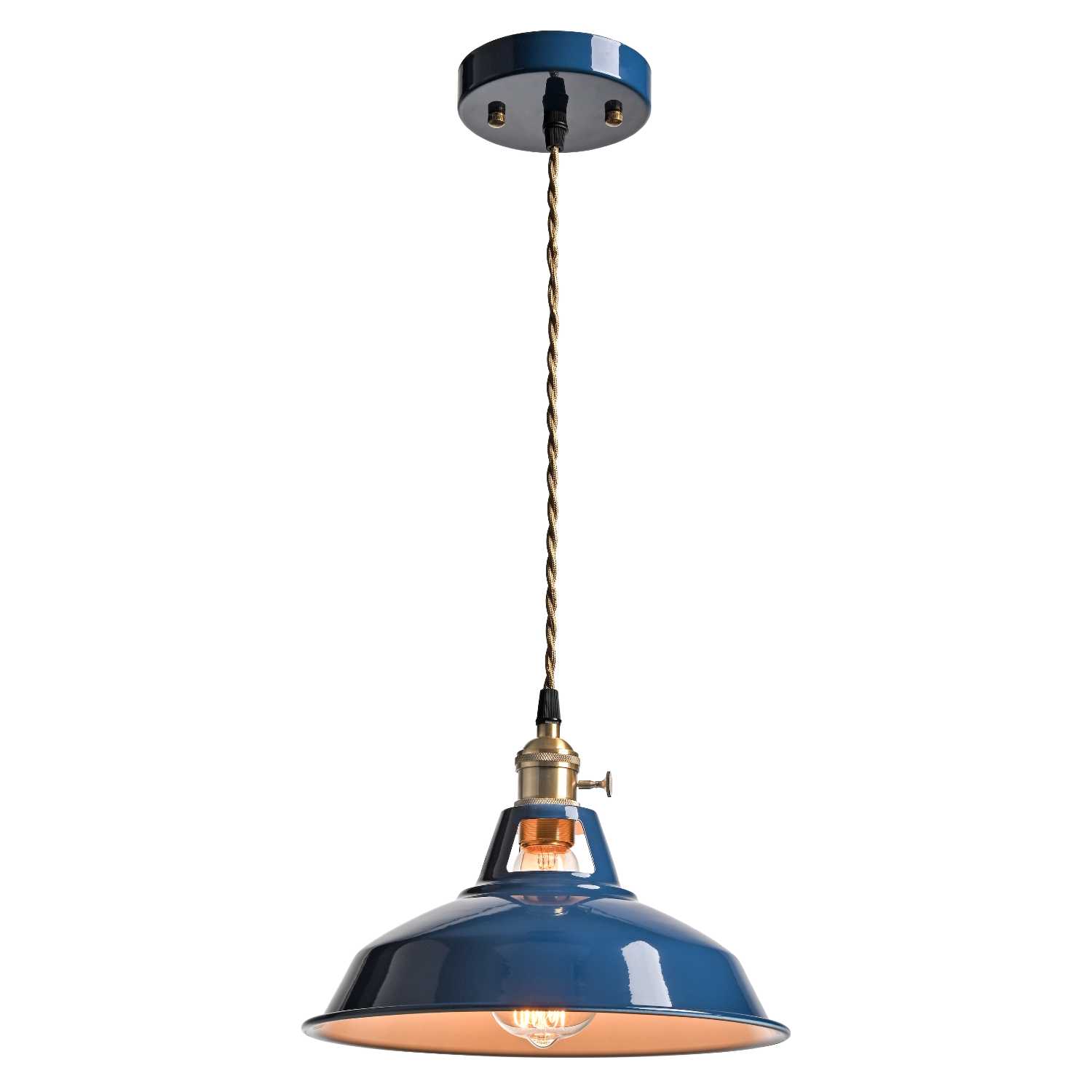 The modern pendant light’s barn shade and canopy show off a blue finish while its lamp holder, rotary switch, and hanging cord flaunt a gold finish. The white interior of the barn shade helps reflect the light. A mix of finishes encompasses both a dash of drama and a touch of shimmer, yet maintains a modern edge. Its blue finish gives your home a snappy look and a glamorous, refreshing vibe. Its shiny gold finish offers a stark contrast to the blue finish and adds alluring eye appeal to the space. Feel free to turn on/off the pendant light with the rotary switch on the lamp holder. It comes with a 59-inch adjustable cord to suit your different lighting needs.