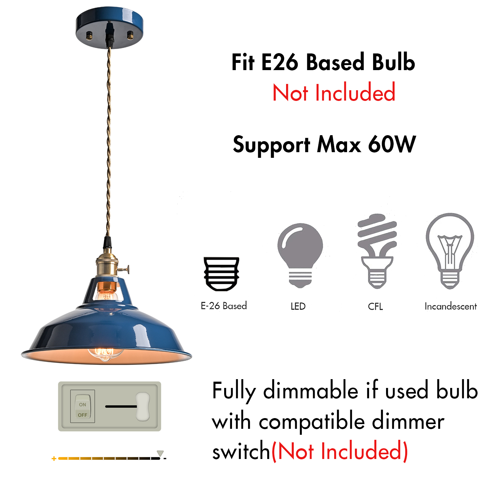 The pendant light fixture comes with one E26-base socket which is compatible with a variety of bulb types: LED, INCANDESCENT, CFL.