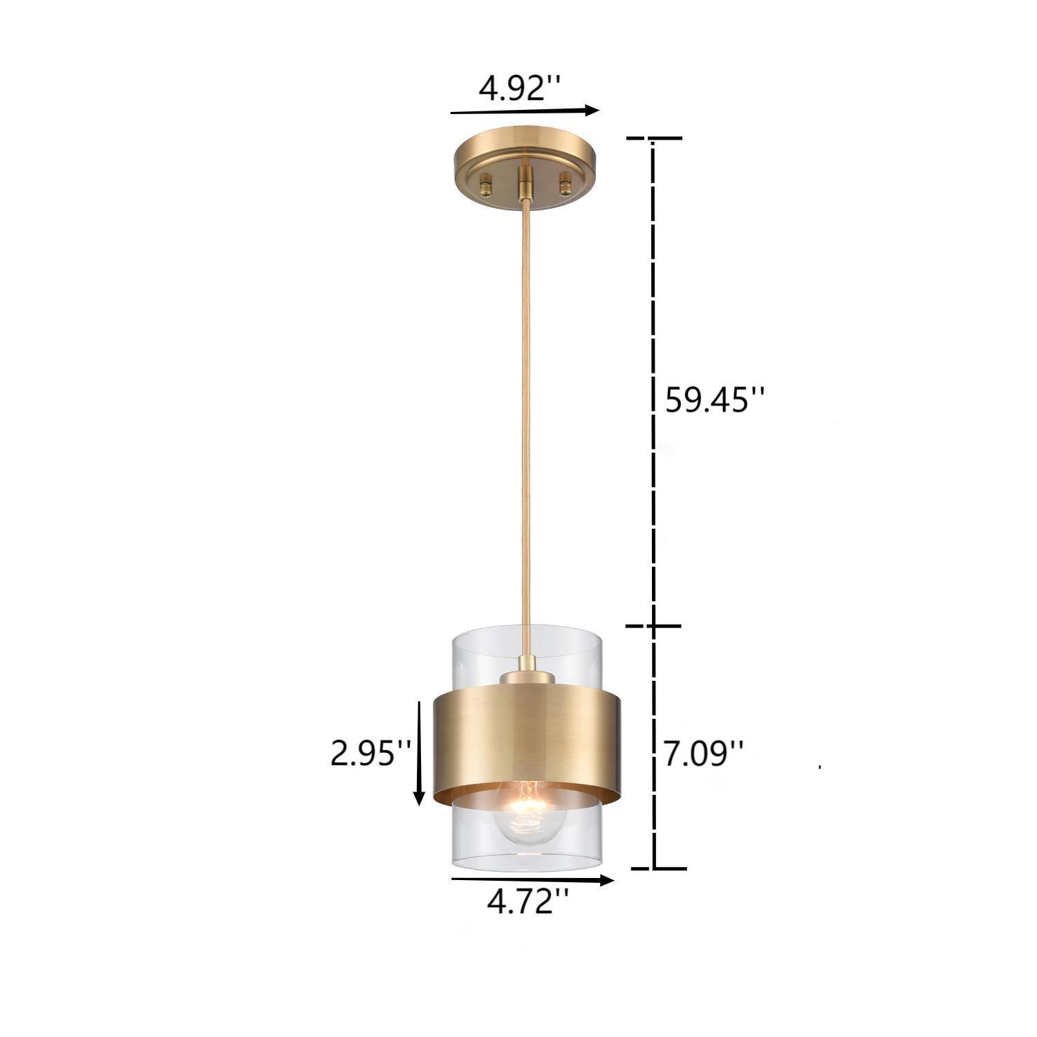 Flaunting an electrophoretic brass finish, the modern pendant light fixture over kitchen island spruces up your living space with a glint of glamour and makes your home fizz with a pop of personality. Its open clear glass cylinder shade is encircled and protected by a gleaming brass floating band, adding contrast and a ton of eye appeal to the scene. It has all the style, charisma, and drama required to make everyone stand still to stare and appreciate. Its open glass shade allows the light to shine through freely. It comes with a 59-inch adjustable cord.