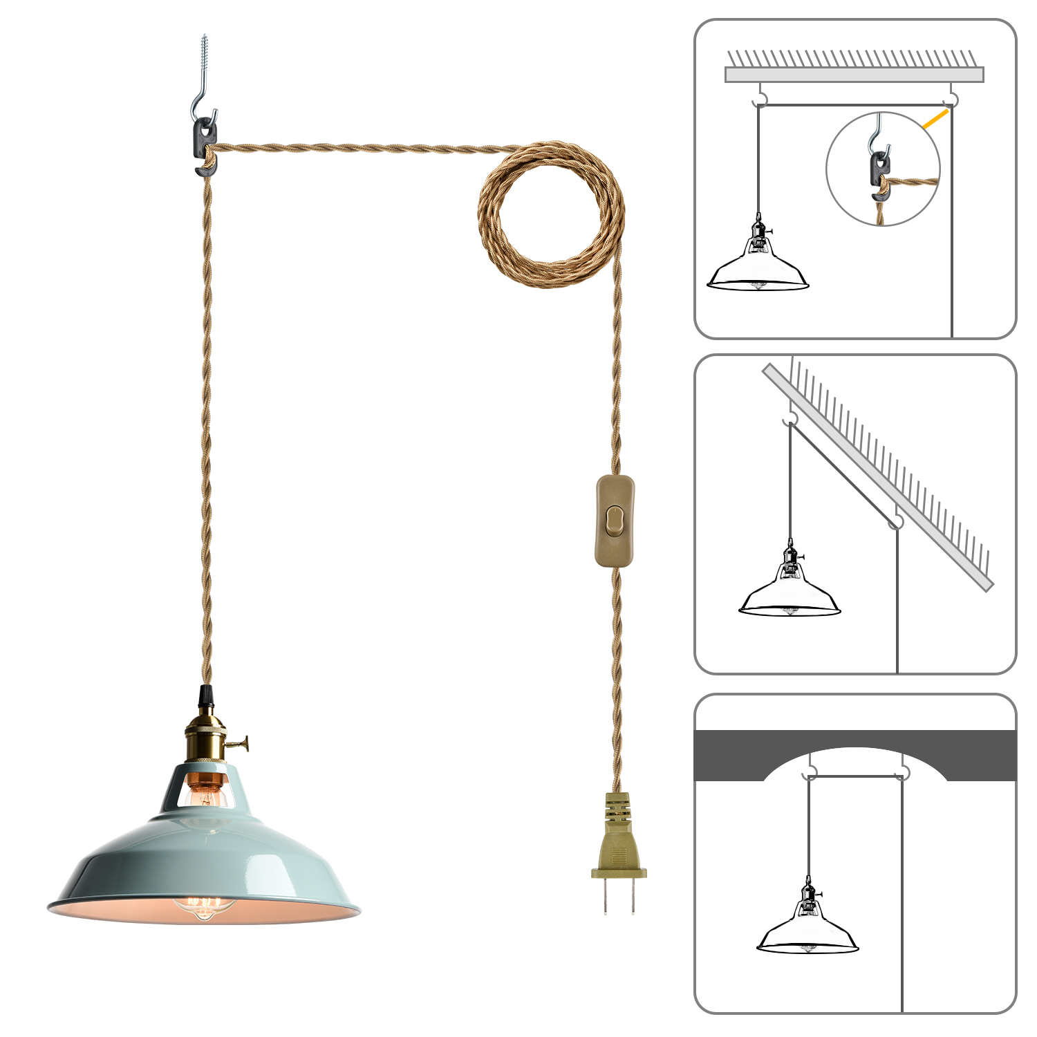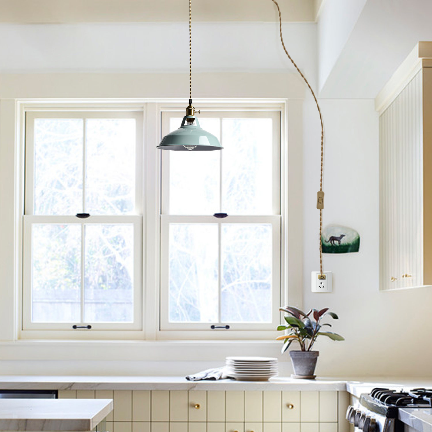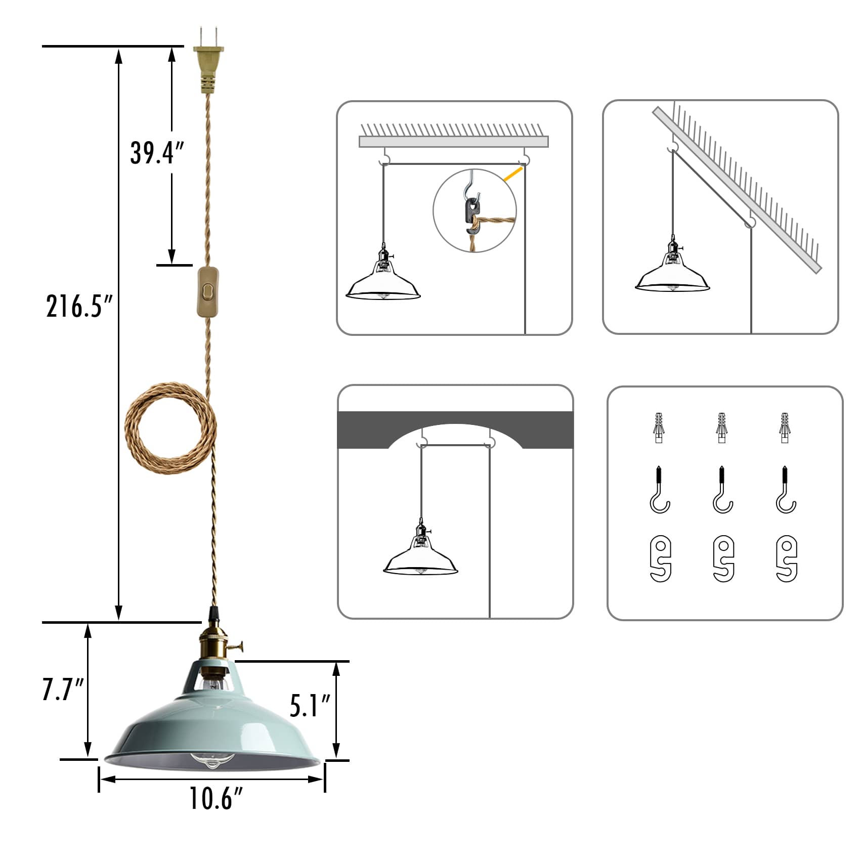The plug-in pendant light’s barn shade shows off a pale turquoise finish while its lamp holder, rotary switch, and plug-in cord flaunt a gold finish. The white interior of the barn shade helps reflect the light. A mix of finishes encompasses both a dash of drama and a touch of shimmer, yet maintains a modern edge. Its pale turquoise finish gives your home a snappy look and a glamorous, refreshing vibe. Its shiny gold finish offers a stark contrast to the pale turquoise finish and adds alluring eye appeal to the space. The switch on the plug-in cord and the rotary switch on the lamp holder are just on/off switches without a dimming function. It comes with a 216.5-inch fabric plug-in cord to suit your different lighting needs. It can accommodate sloped or vaulted ceilings.