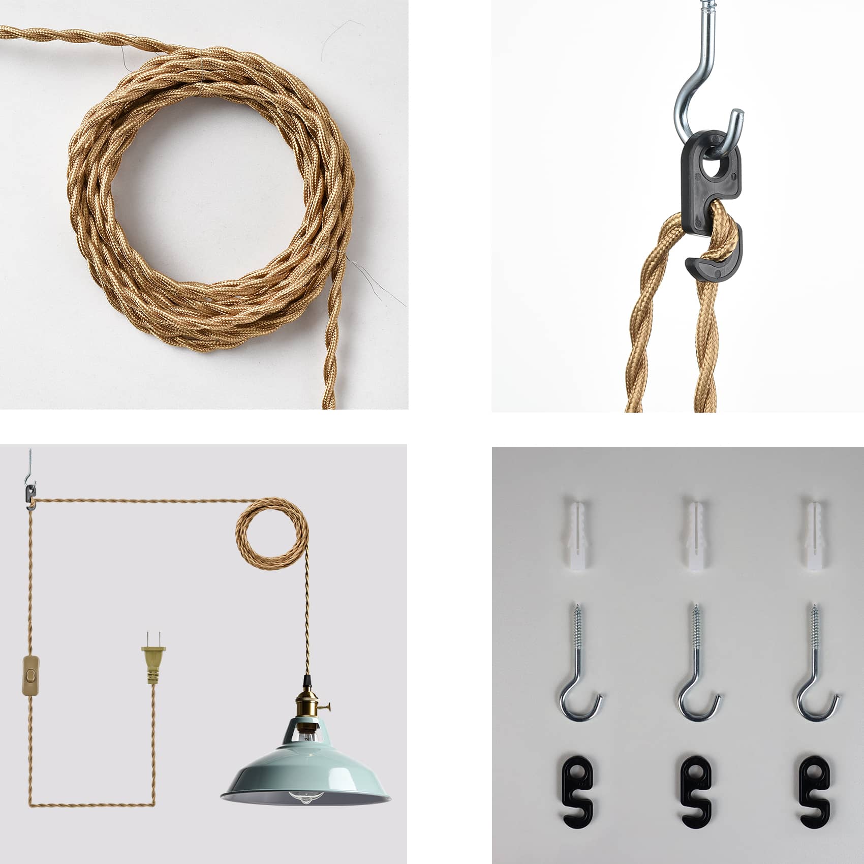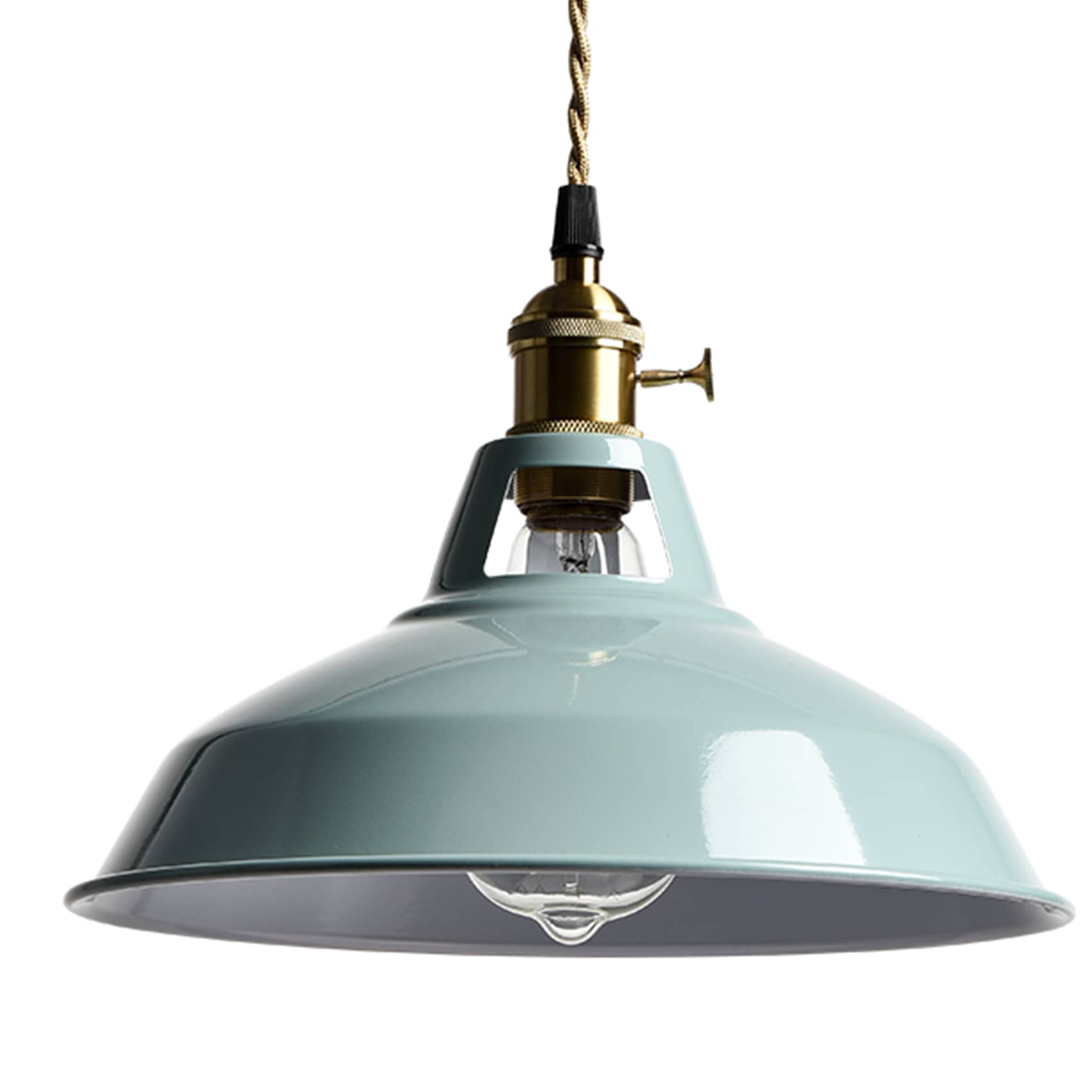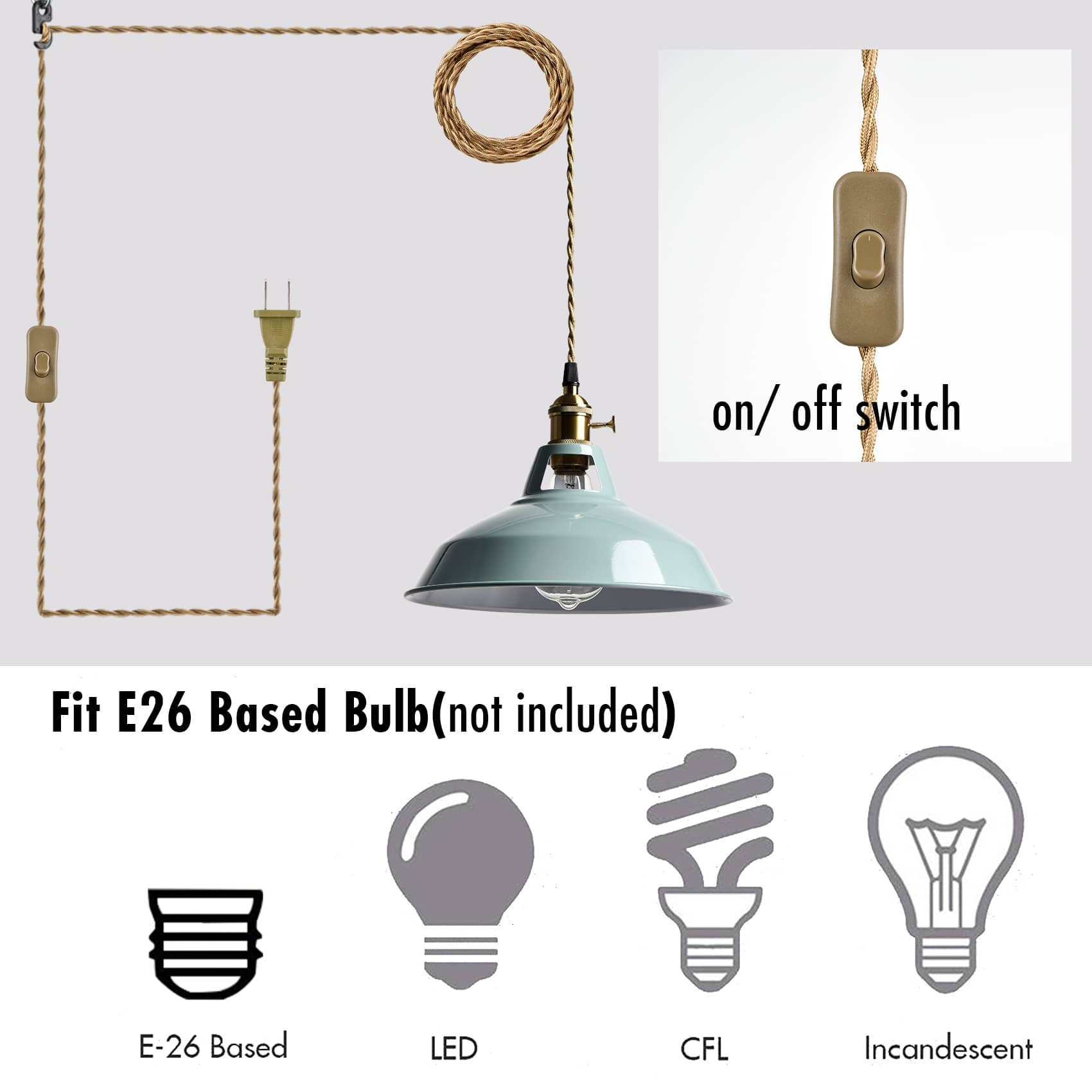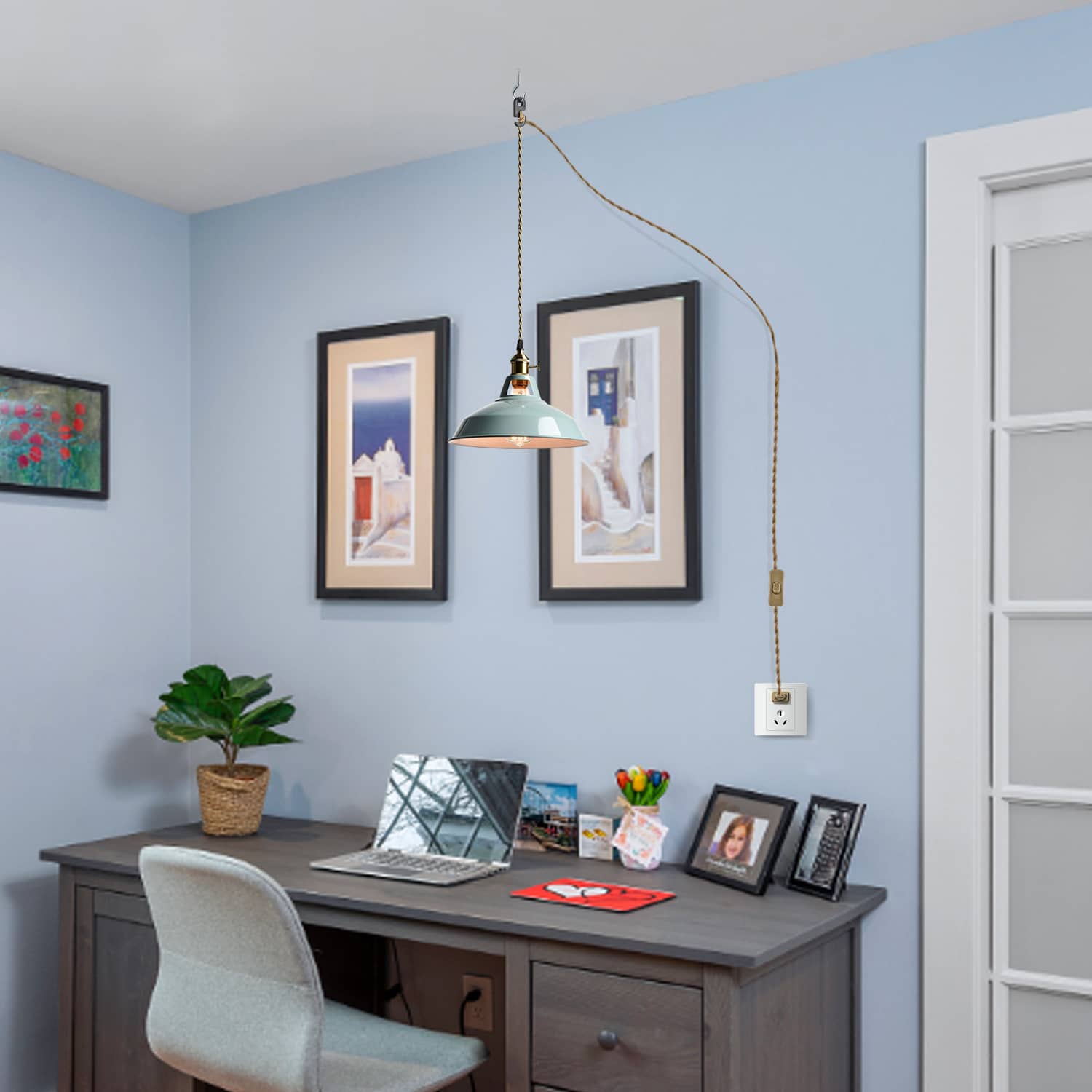 The plug-in pendant light’s barn shade shows off a pale turquoise finish while its lamp holder, rotary switch, and plug-in cord flaunt a gold finish. The white interior of the barn shade helps reflect the light. A mix of finishes encompasses both a dash of drama and a touch of shimmer, yet maintains a modern edge. Its pale turquoise finish gives your home a snappy look and a glamorous, refreshing vibe. Its shiny gold finish offers a stark contrast to the pale turquoise finish and adds alluring eye appeal to the space. The switch on the plug-in cord and the rotary switch on the lamp holder are just on/off switches without a dimming function. It comes with a 216.5-inch fabric plug-in cord to suit your different lighting needs. It can accommodate sloped or vaulted ceilings.