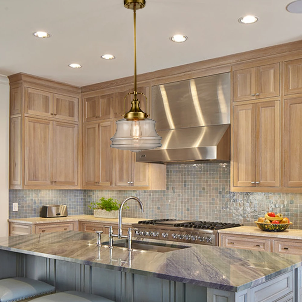 The schoolhouse brass gold pendant light fixture’s canopy, hanging rods, arms, and lamp-holder are accented with a rustproof electrophoretic brass finish, perking up your interior with a touch of shimmer. Crafted of impurity-free hand-blown clear glass, its schoolhouse-inspired lampshade looks like a special drum shade with soft curves.