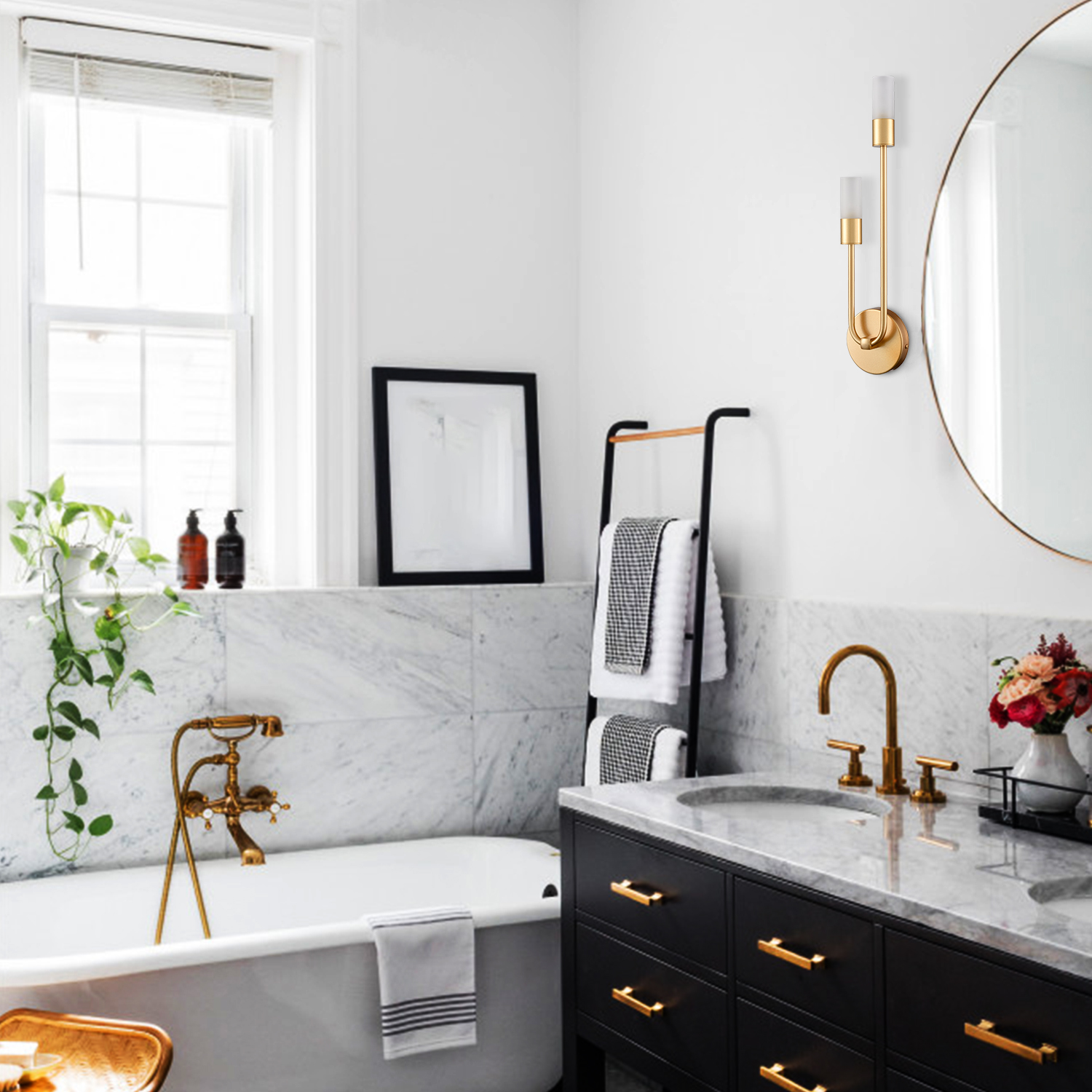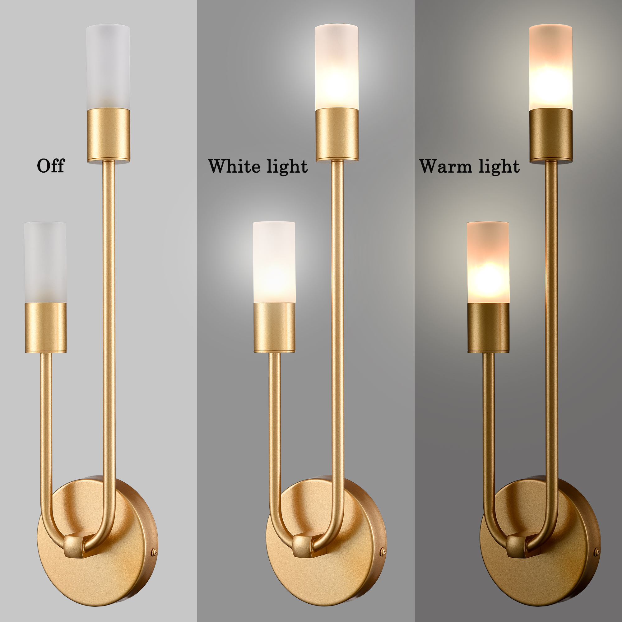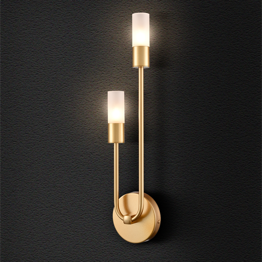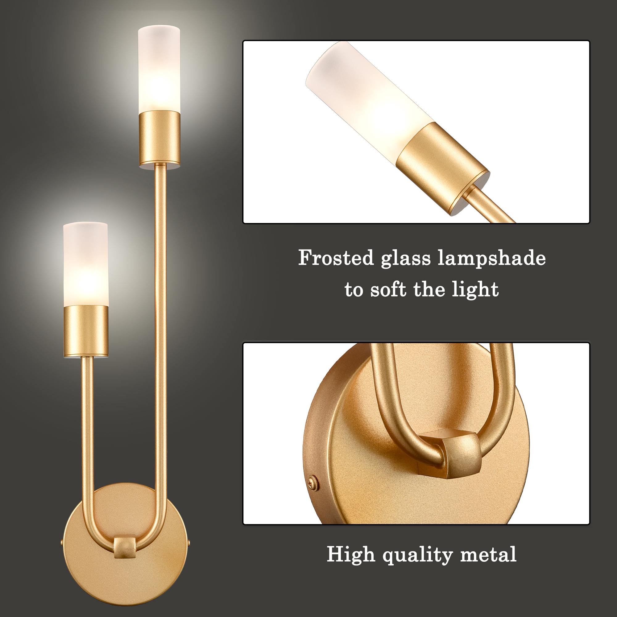 Flaunting a gold finish, the modern wall sconce livens up your living space with a touch of shimmer. It shows off two elongated cylinder frosted shades crafted from acrylic. The shades are designed to house two exposed bulbs to complete the aesthetic. Its cylinder frosted shades are supported by a U-shaped arm firmly attached to the canopy and held aloft by the U-shaped arm at different lengths. Its cylinder shades contrast the gold finish and add alluring visual interest to the interior. It encompasses both Nordic and modern styles, which makes it easy to add a pop of personality to your home decor. It can be mounted as an uplight or downlight to suit your different lighting needs.