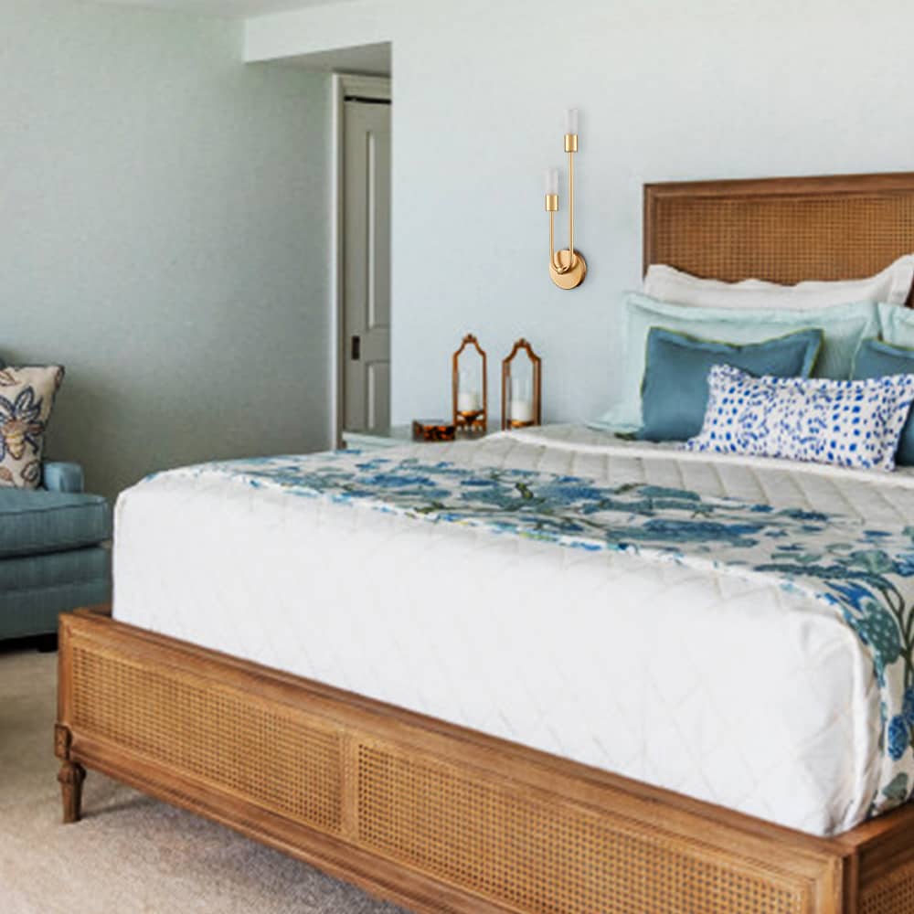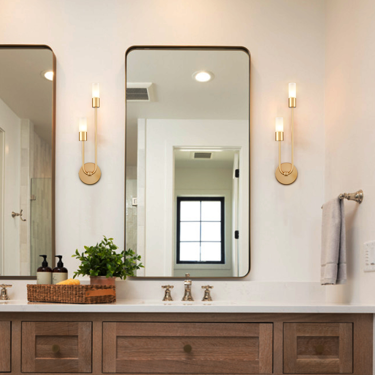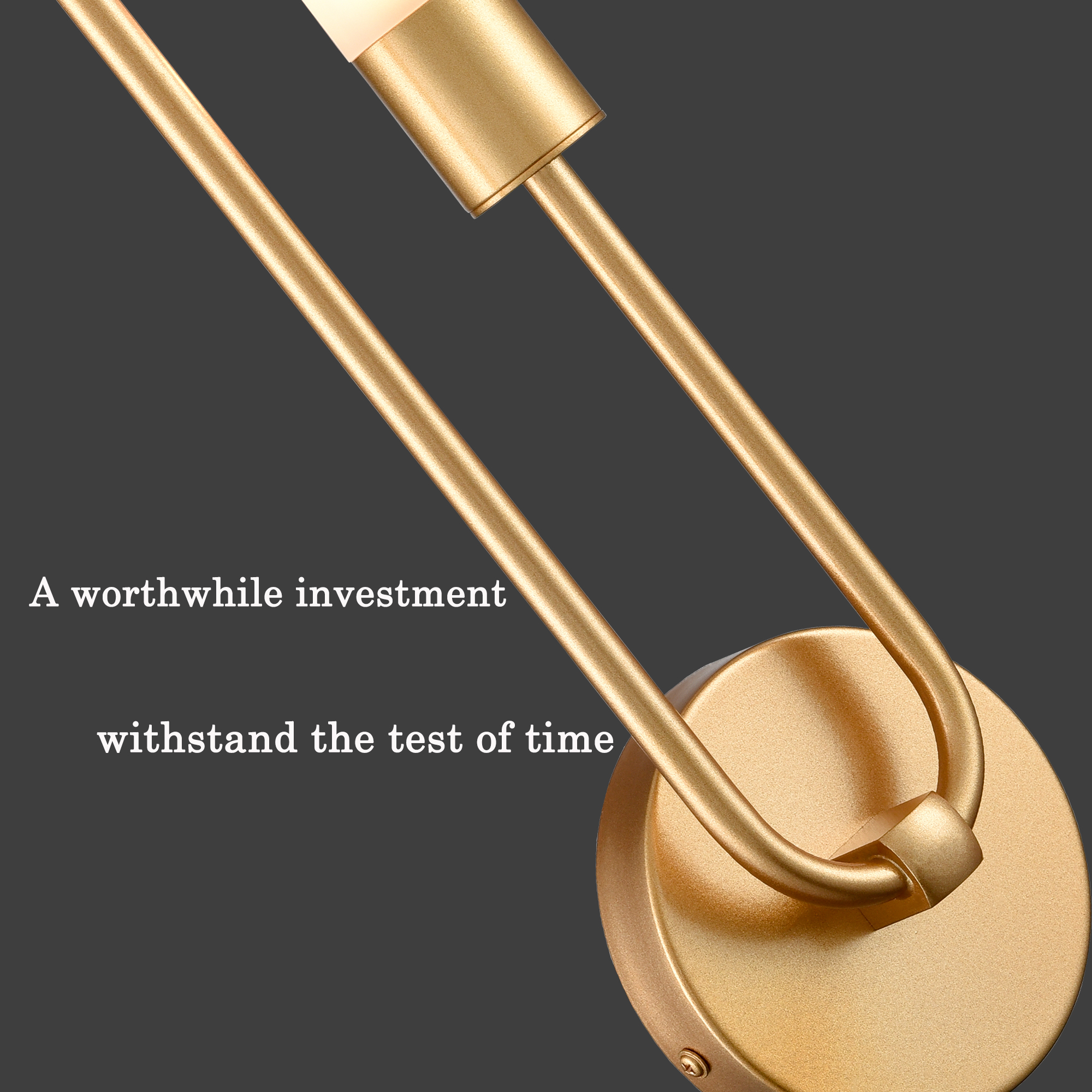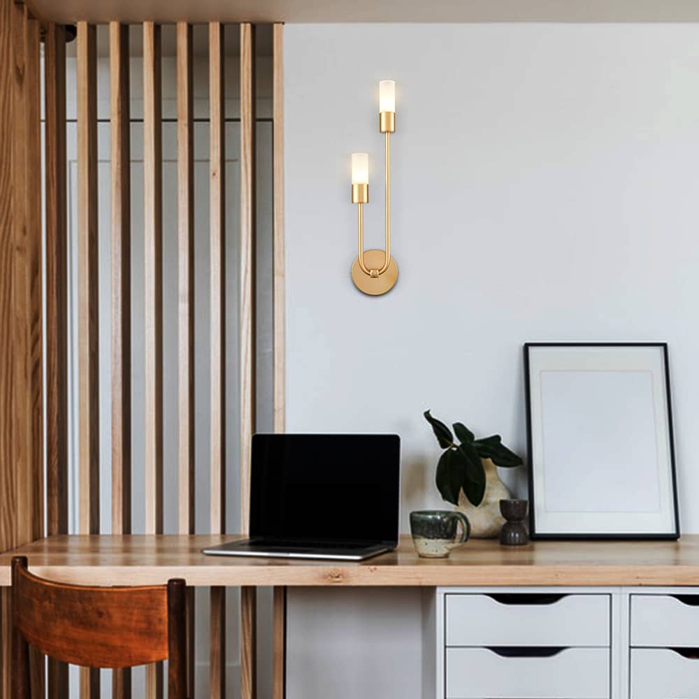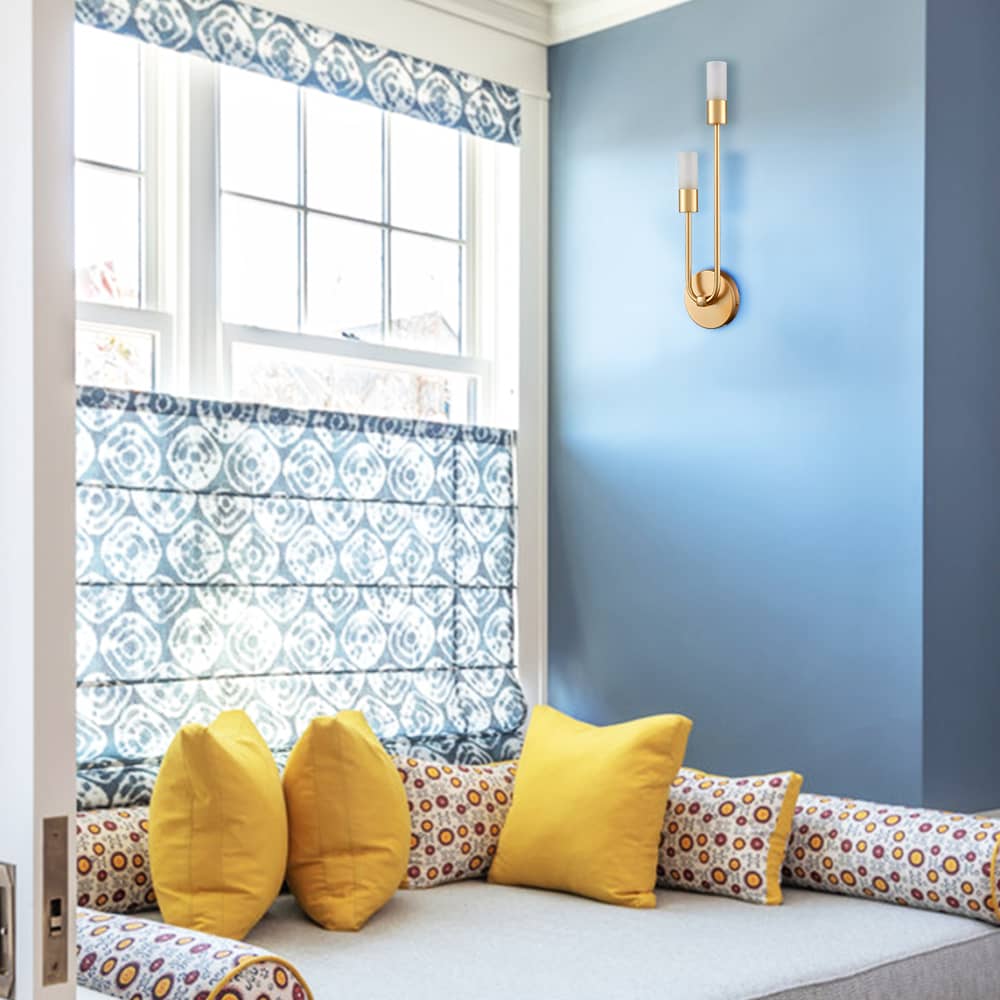 Flaunting a gold finish, the modern wall sconce livens up your living space with a touch of shimmer. It shows off two elongated cylinder frosted shades crafted from acrylic. The shades are designed to house two exposed bulbs to complete the aesthetic. Its cylinder frosted shades are supported by a U-shaped arm firmly attached to the canopy and held aloft by the U-shaped arm at different lengths. Its cylinder shades contrast the gold finish and add alluring visual interest to the interior. It encompasses both Nordic and modern styles, which makes it easy to add a pop of personality to your home decor. It can be mounted as an uplight or downlight to suit your different lighting needs.