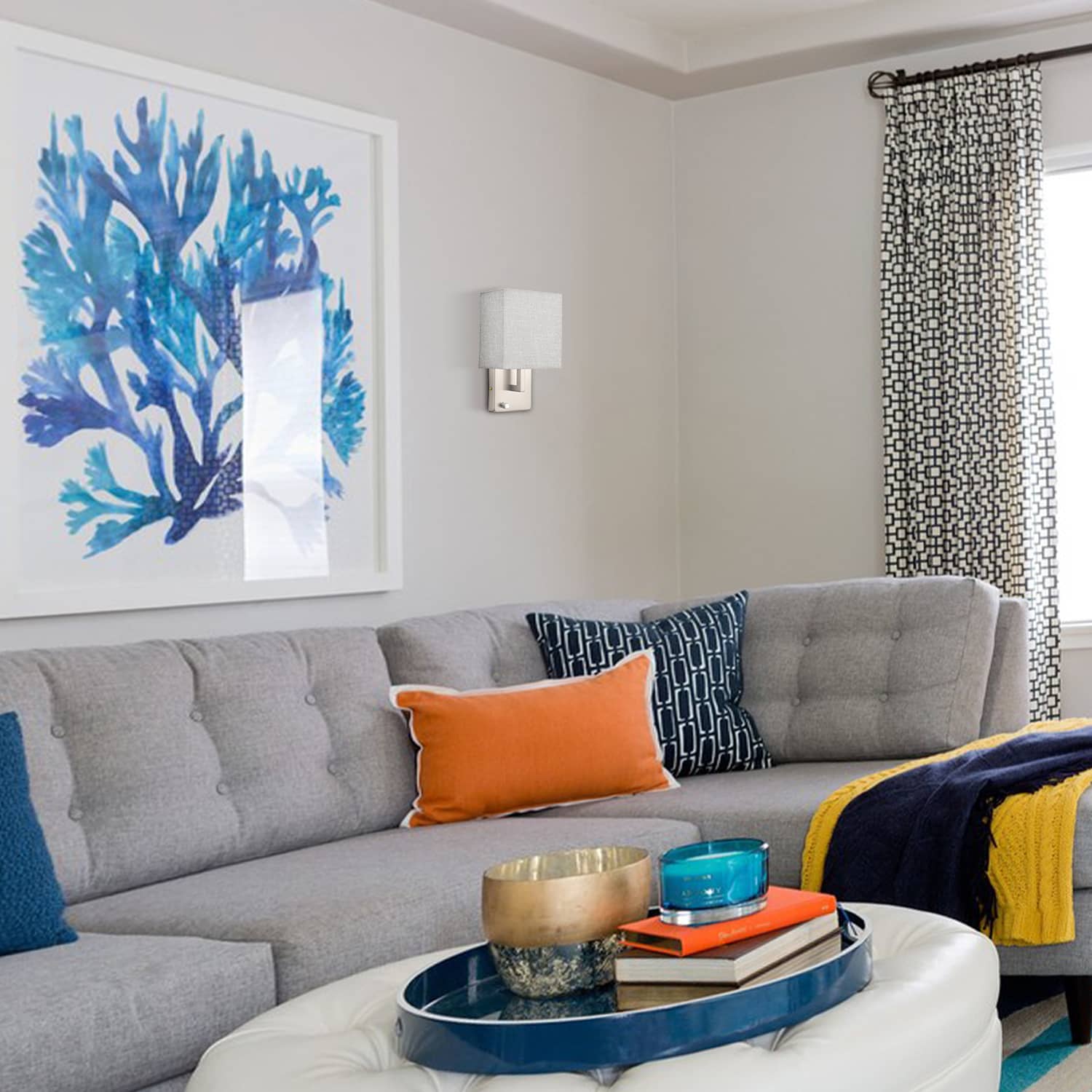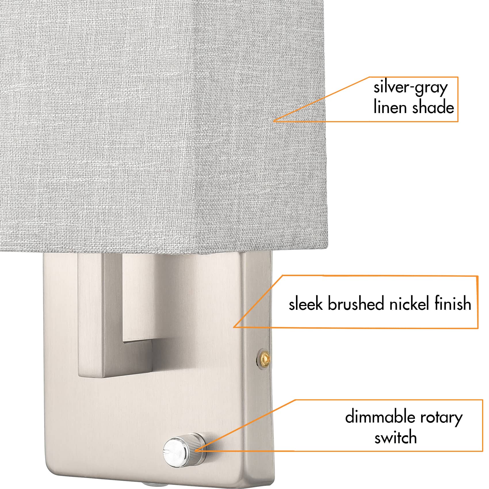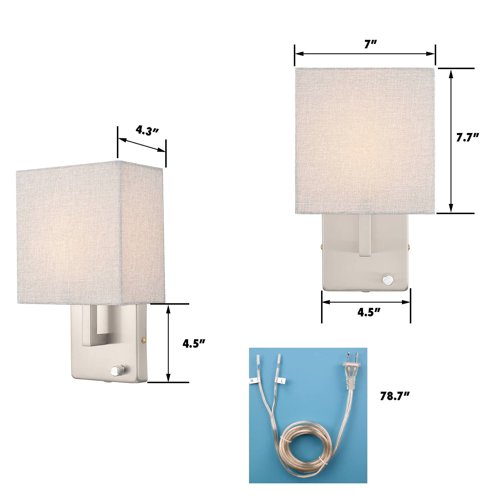 The modern plug-in wall sconces' canopies, arms, and lamp holders boast a rustproof brushed nickel finish, perking up your interior with a glint of glamour. Sporting the covered edge workmanship, their gray linen rectangular lampshades complete the aesthetic with a large dose of texture. The square canopies and rectangular lampshades showcase the beauty of geometry and convey a refined touch. The light pouring through the fabric lampshades is gently muted and fills the room without any glare. Their gray linen lampshades contrast the brushed nickel finish and add alluring visual interest to the space. Each wall sconce comes with a 78.7-inch plug-in cord. The switch on their canopies is both an on/off switch and a dimmer switch.