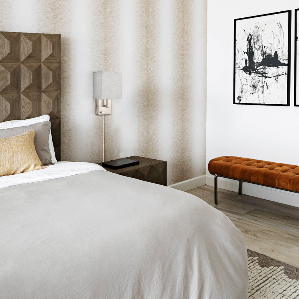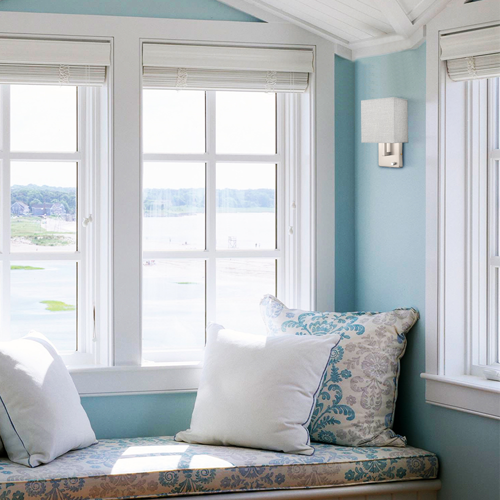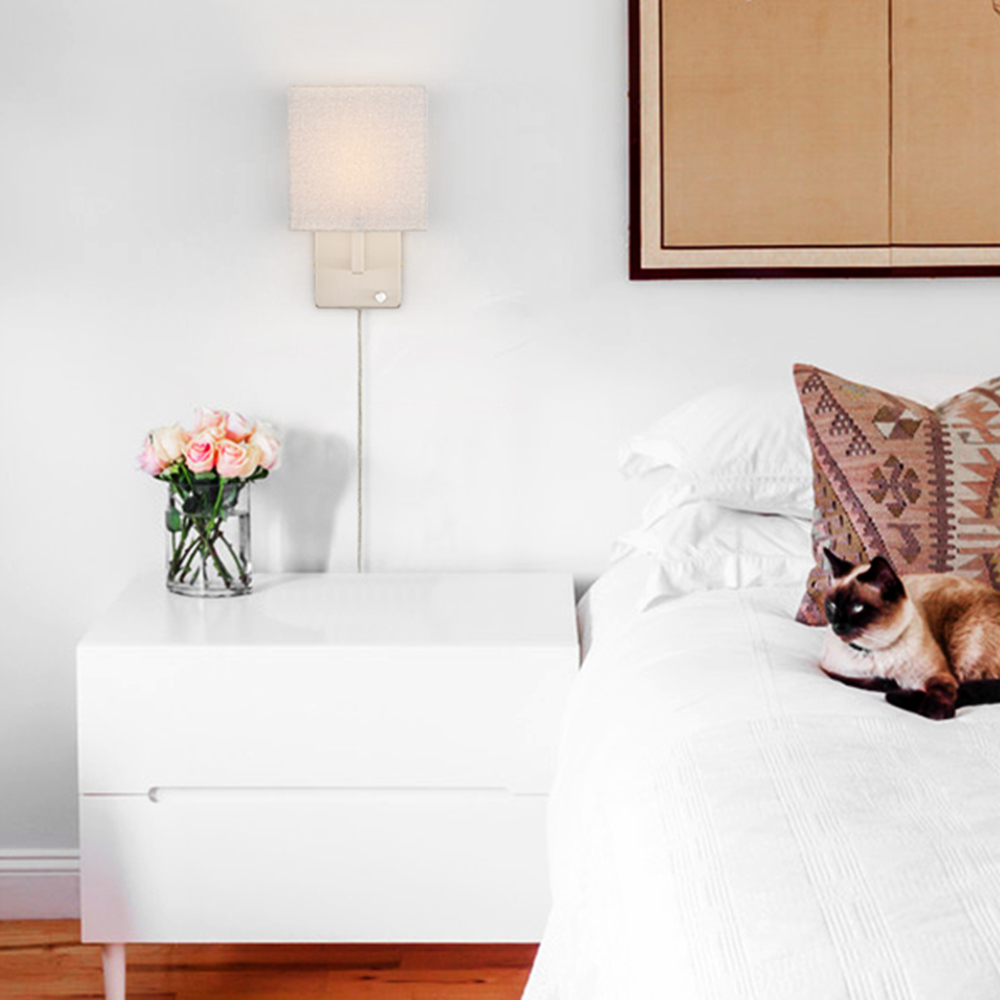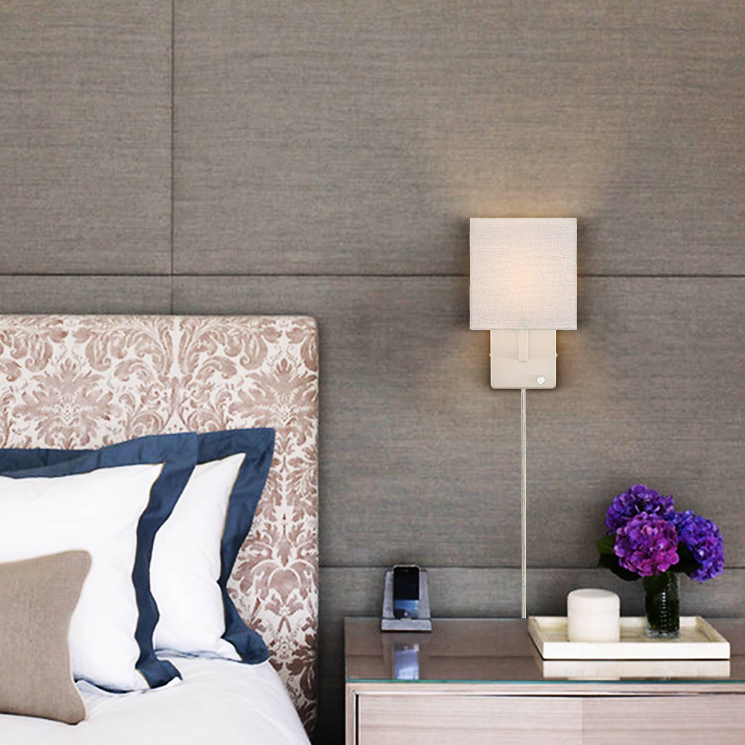 The modern plug-in wall sconces' canopies, arms, and lamp holders boast a rustproof brushed nickel finish, perking up your interior with a glint of glamour. Sporting the covered edge workmanship, their gray linen rectangular lampshades complete the aesthetic with a large dose of texture. The square canopies and rectangular lampshades showcase the beauty of geometry and convey a refined touch. The light pouring through the fabric lampshades is gently muted and fills the room without any glare. Their gray linen lampshades contrast the brushed nickel finish and add alluring visual interest to the space. Each wall sconce comes with a 78.7-inch plug-in cord. The switch on their canopies is both an on/off switch and a dimmer switch.
