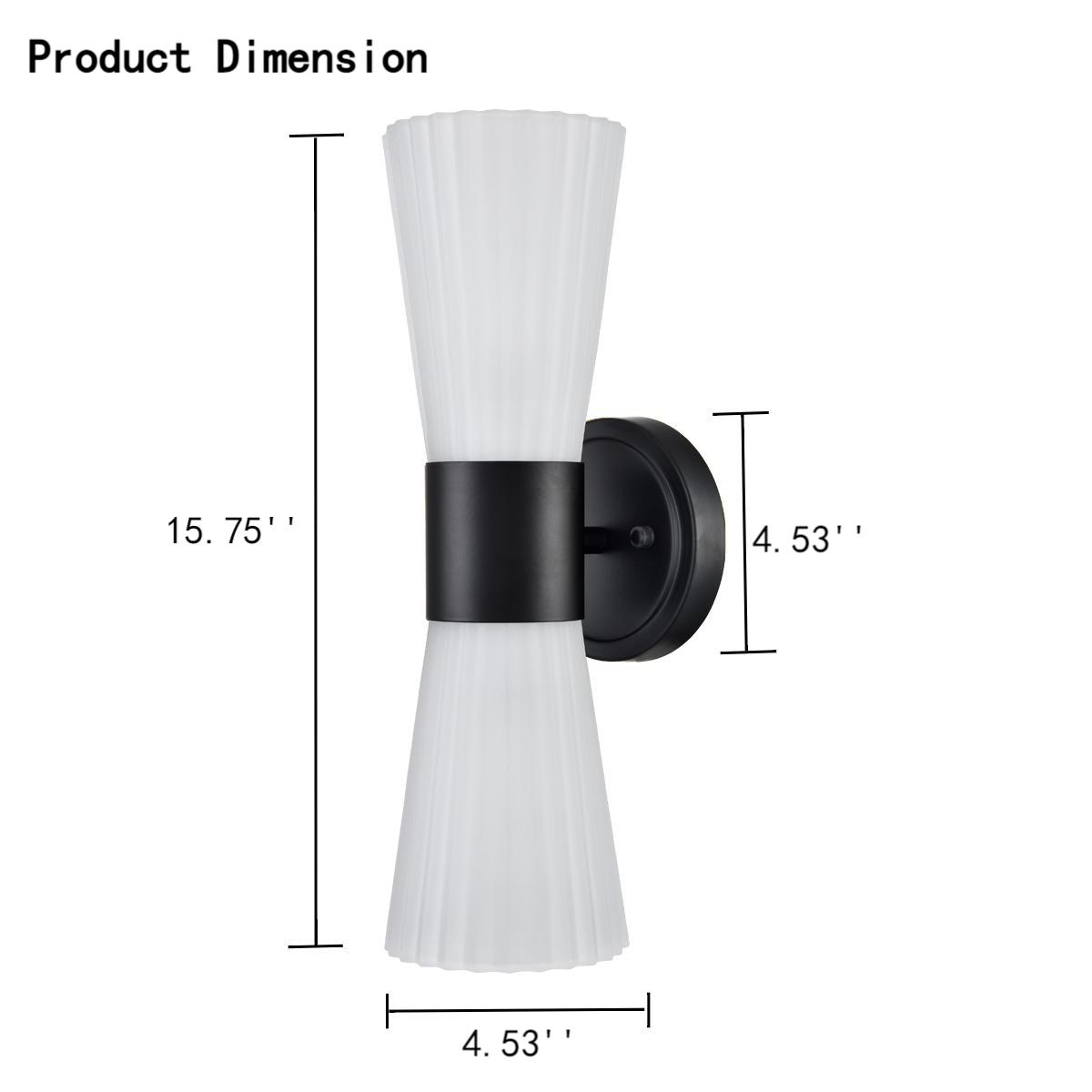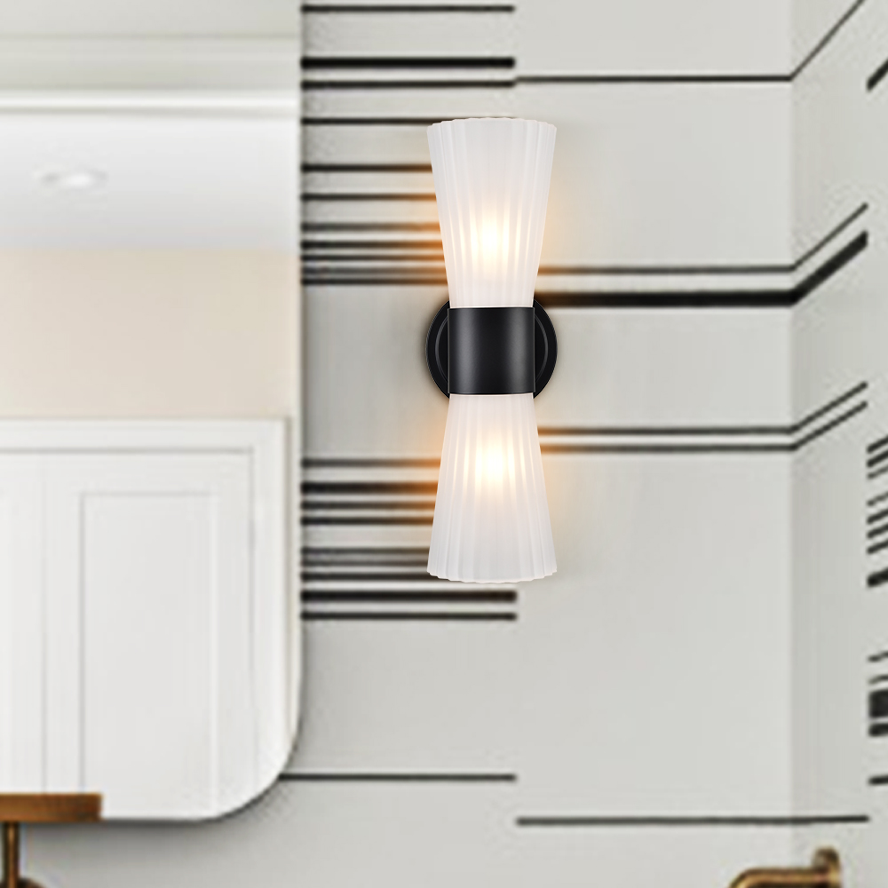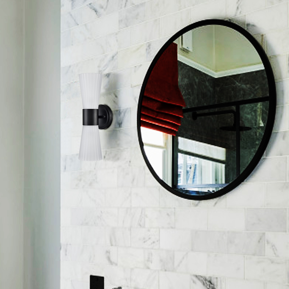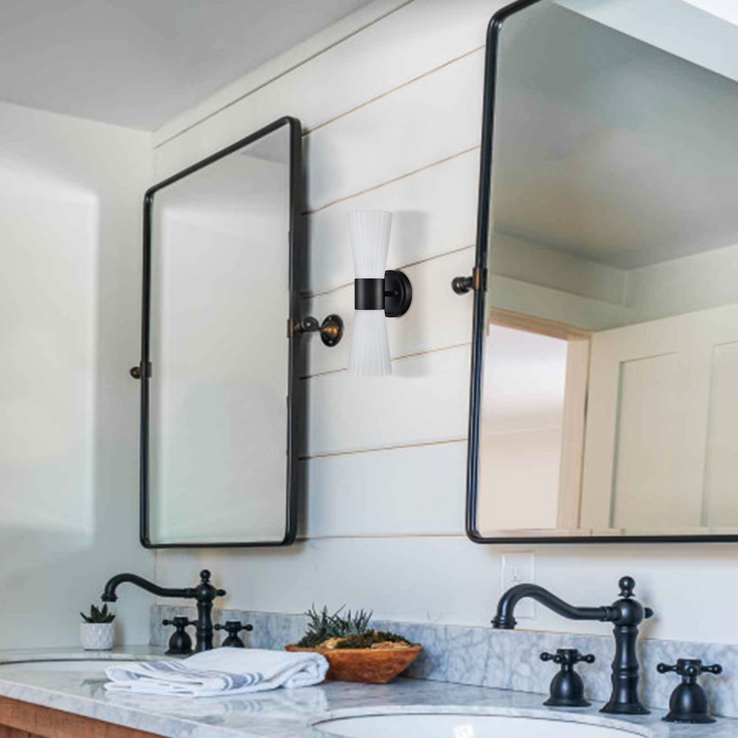 The black wall sconce flaunts a rustproof semigloss black finish, adding a dash of drama and dramatic decorative impact to your home. It shows off an hourglass-inspired glass shade crafted from impurity-free frosted glass. It is held aloft by a black metal ring in the middle of the glass shade, bringing an unrivaled level of sophistication. Its glass shade contrasts the black finish and adds alluring visual interest to the living area. The stripes on the frosted glass shade give the light fixture an instant texture boost. A charming glow shines through its opaque frosted glass shade, creating intriguing light effects and shades. It can be installed horizontally or vertically.