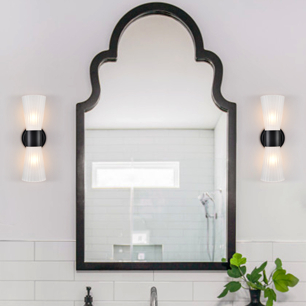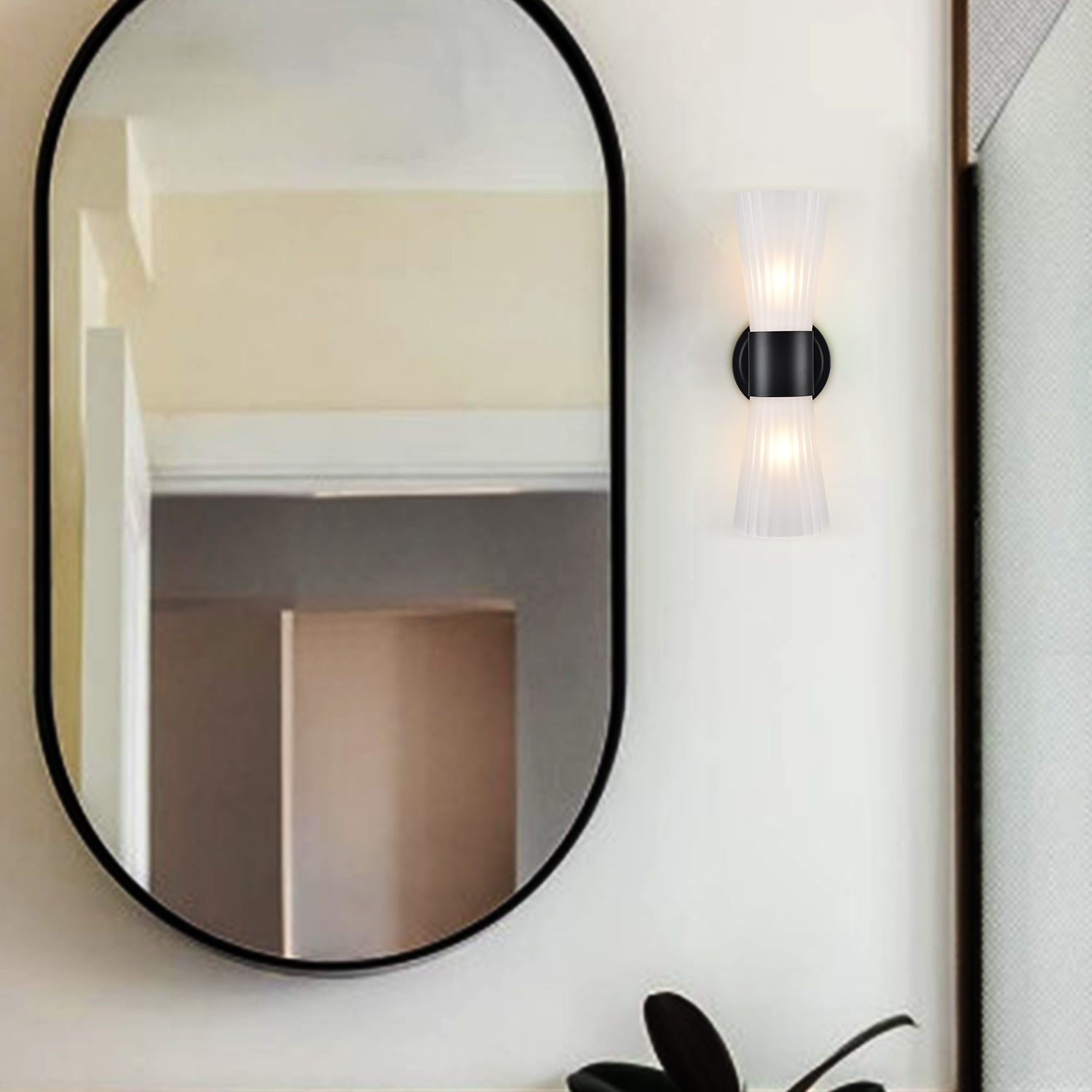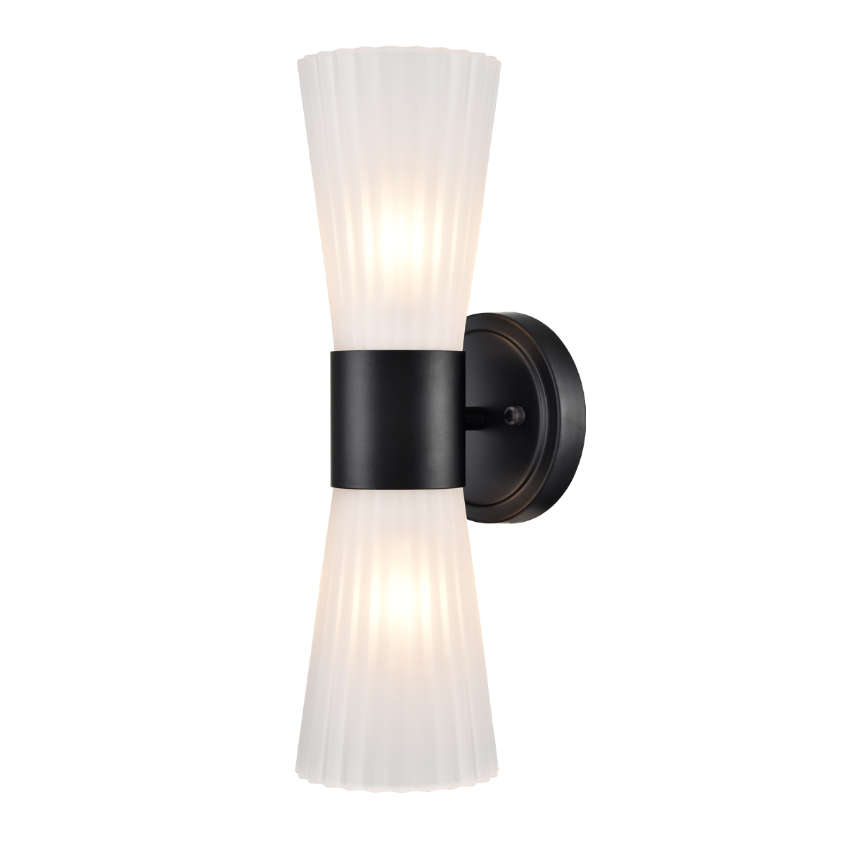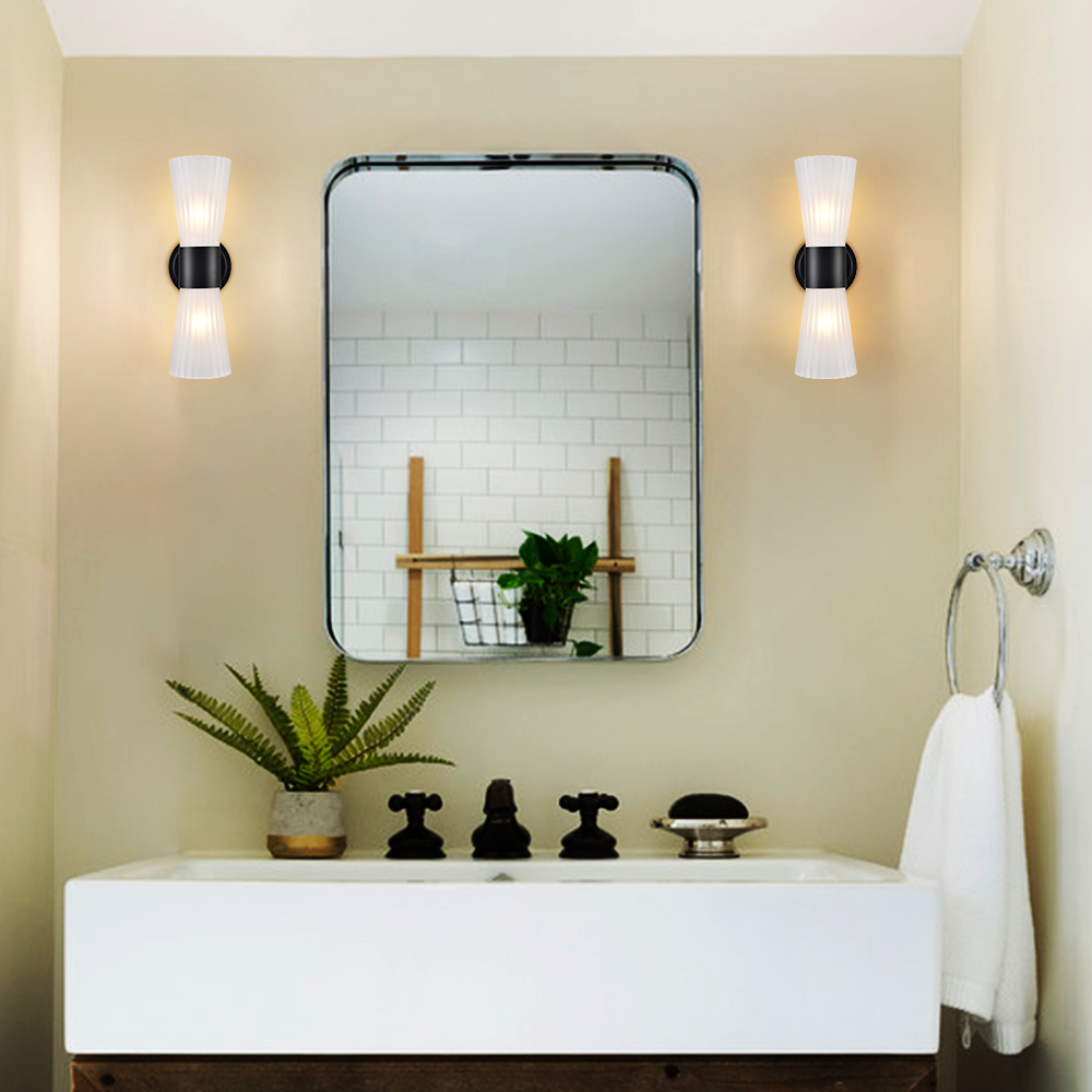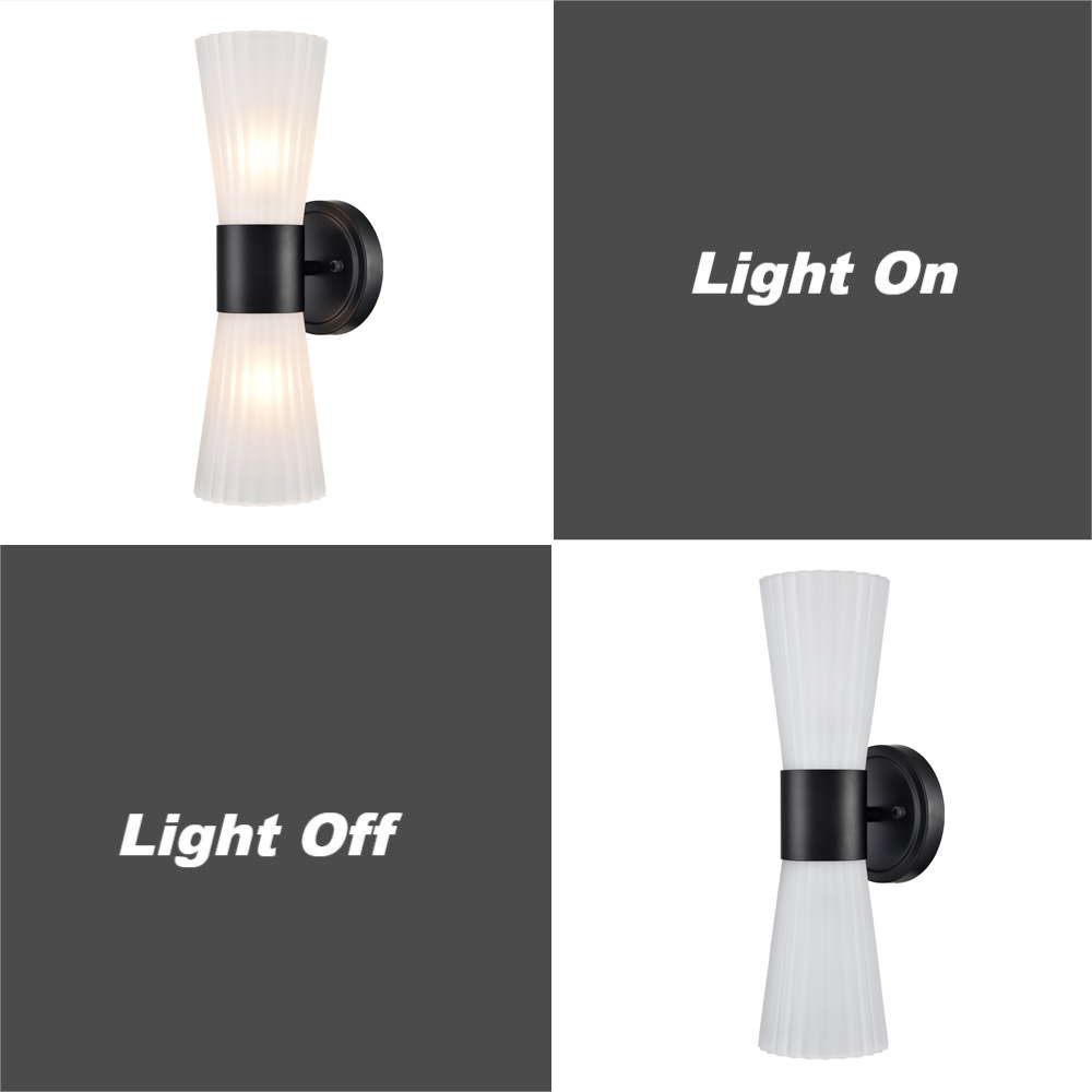 The black wall sconce flaunts a rustproof semigloss black finish, adding a dash of drama and dramatic decorative impact to your home. It shows off an hourglass-inspired glass shade crafted from impurity-free frosted glass. It is held aloft by a black metal ring in the middle of the glass shade, bringing an unrivaled level of sophistication. Its glass shade contrasts the black finish and adds alluring visual interest to the living area. The stripes on the frosted glass shade give the light fixture an instant texture boost. A charming glow shines through its opaque frosted glass shade, creating intriguing light effects and shades. It can be installed horizontally or vertically.