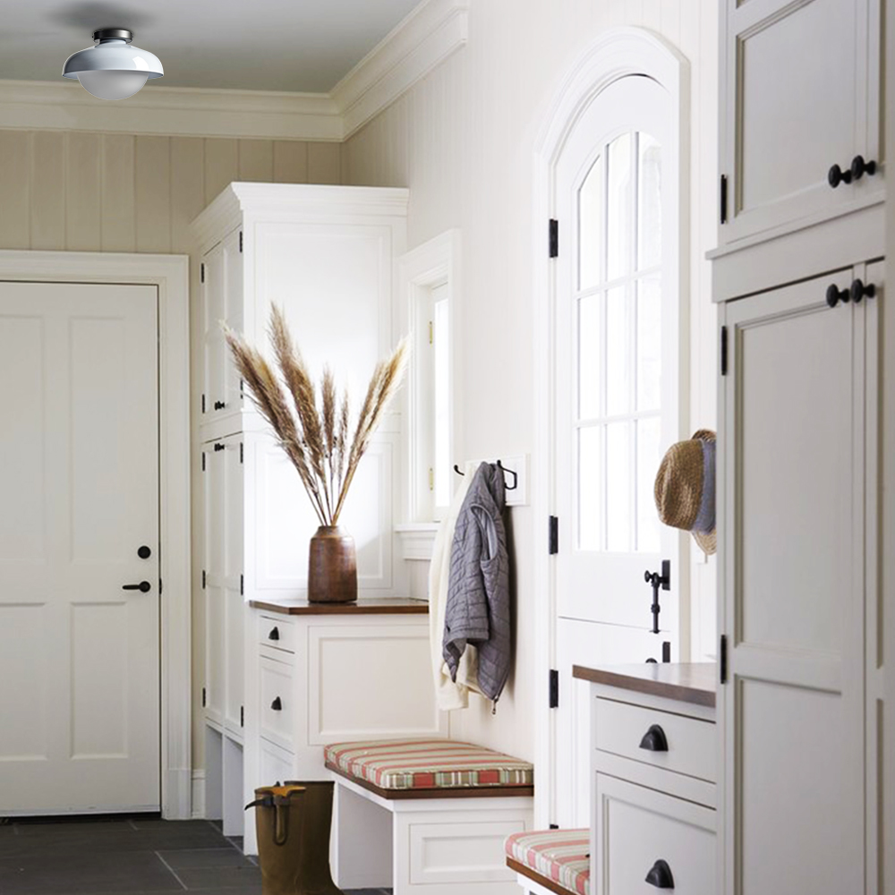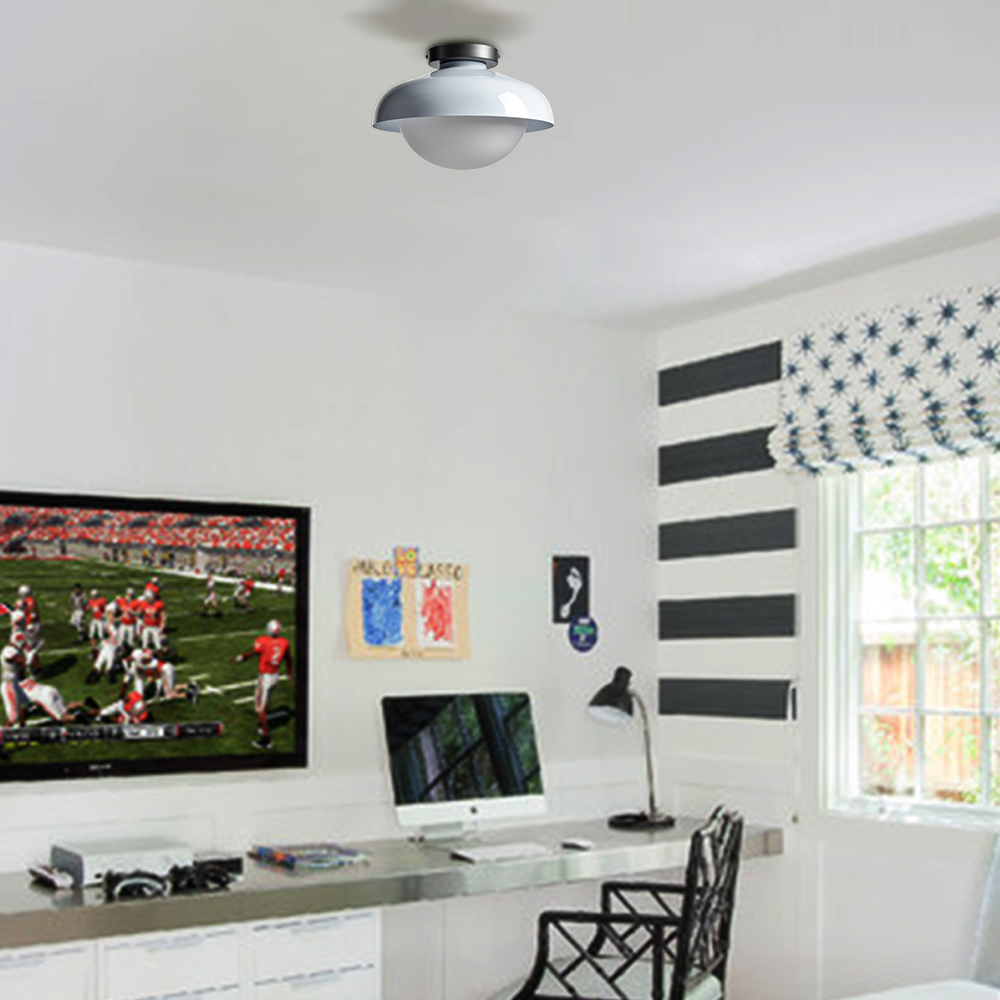 The white barn ceiling light’s canopy sports a dark gray finish, lending an understated elegance. Its metal barn shade protecting the opal glass globe boasts a rustproof matte white finish. Its mix of finishes encompasses both a dash of drama and a touch of modernity, yet maintains an industrial edge. Crafted from impurity-free hand-blown glass, its opal glass shade distributes light evenly to avoid shadows. The globe shade rounds out the design and elevates your interior with a touch of geometry. Its dark gray finish offers a stark contrast to the white finish and adds alluring eye appeal to the space.