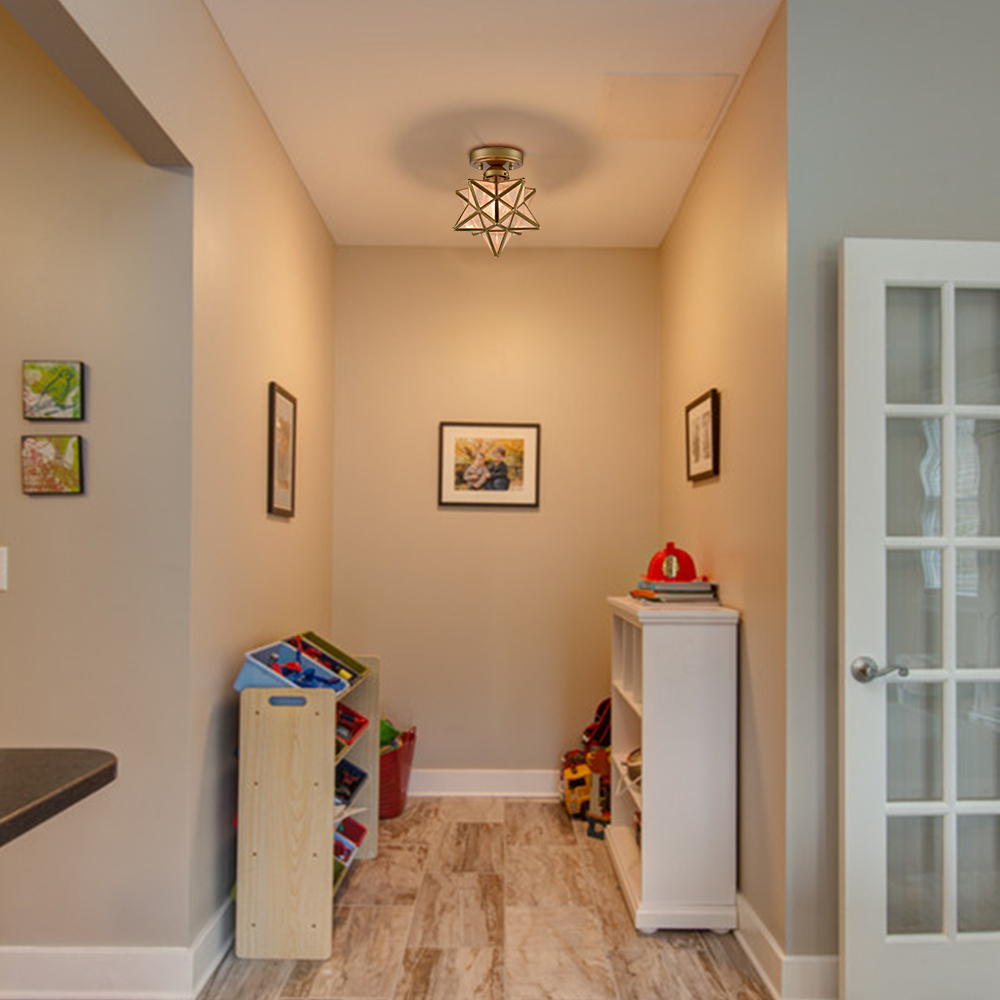 Crafted of impurity-free seeded glass, the Moravian star glass shade of the semi flush mount ceiling light is exquisitely hand-welded. Dressed in a rustproof brass finish, the ceiling light reinvigorates your interior with a touch of glitz.