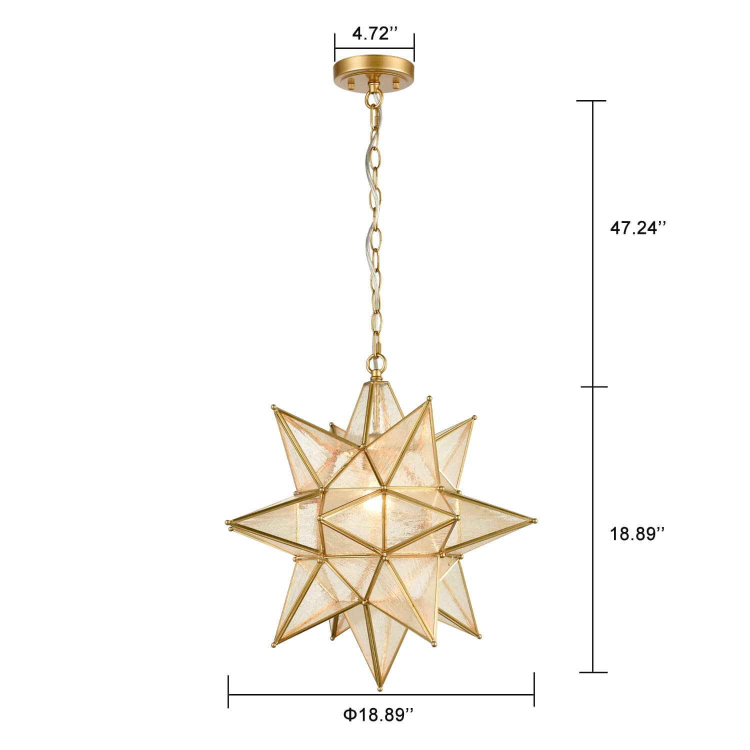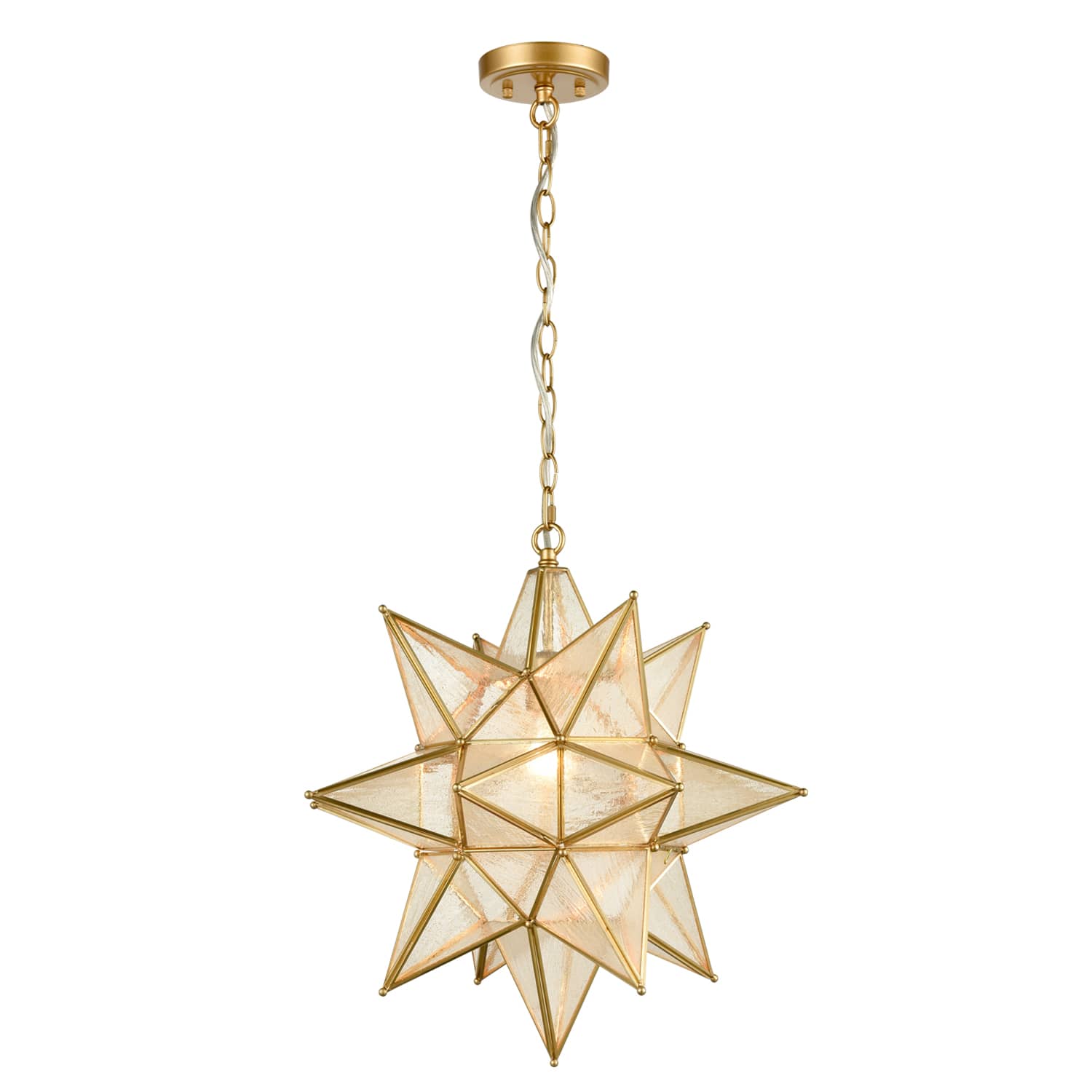 Crafted of impurity-free seeded glass, the Moravian star glass shade of the pendant light is exquisitely hand-welded. It is dressed in a rustproof gold finish, imparting a dash of metallic glitz to your living space. It incorporates both exotic and luxurious elements and injects a dash of industrial vibe and boho chic into your aesthetic. A hinged access door can be opened for bulb replacement. With opaque and dreamy seeded glass, the pendant light emits a warm and lovely glow to create a pleasant ambiance.