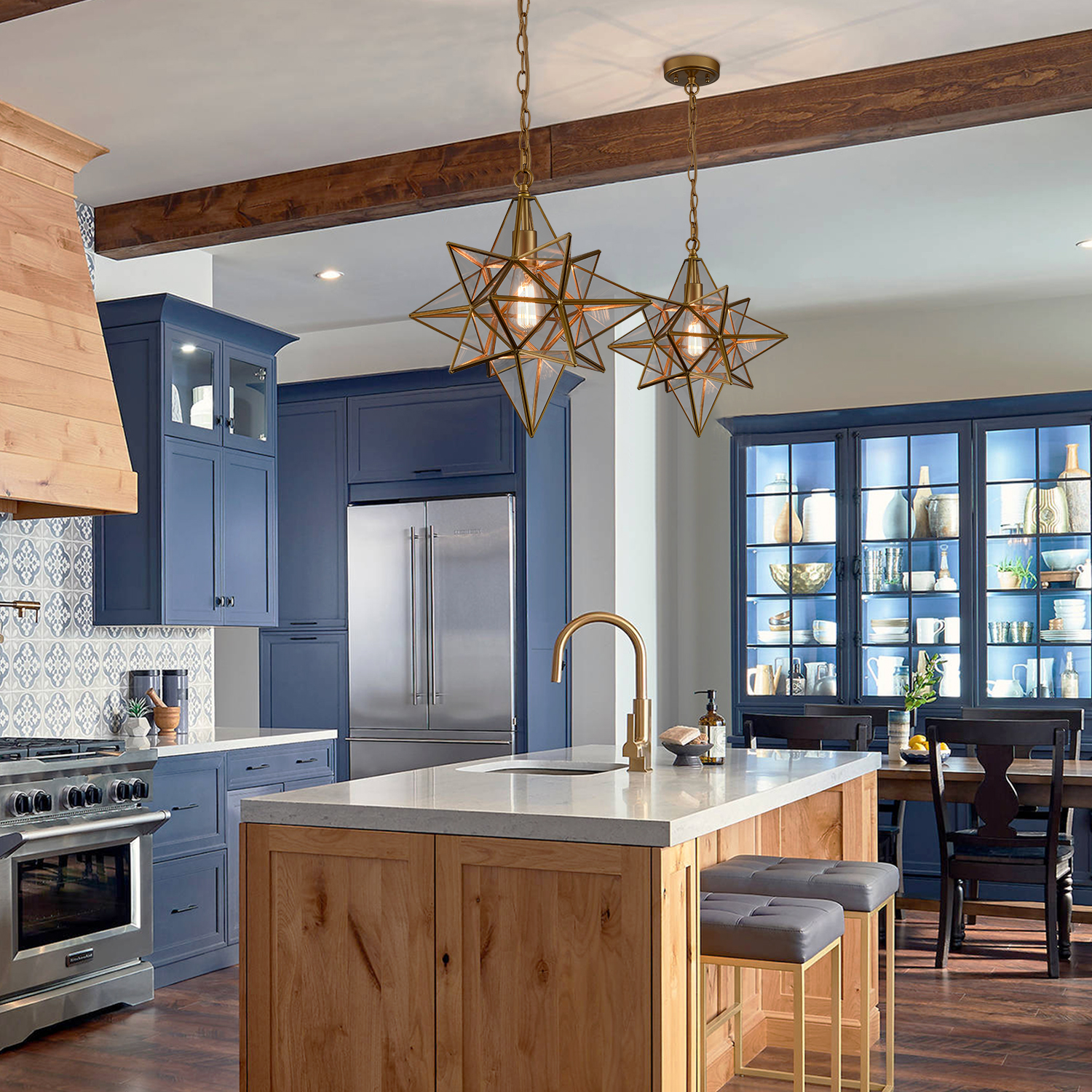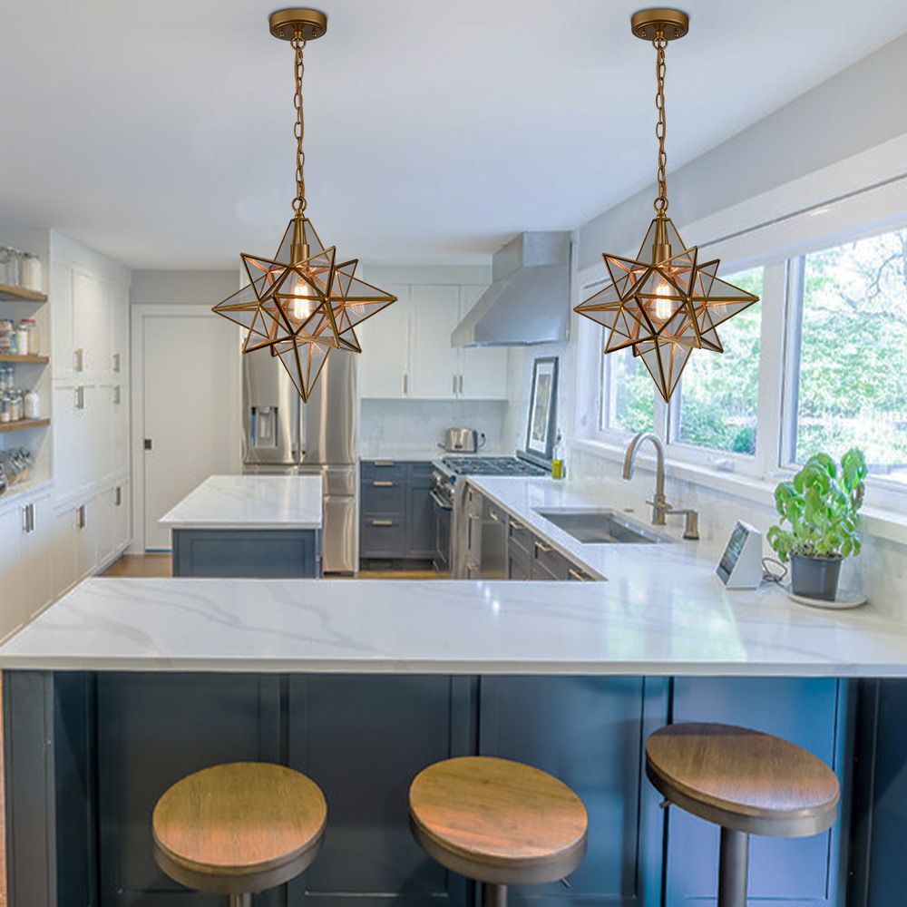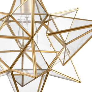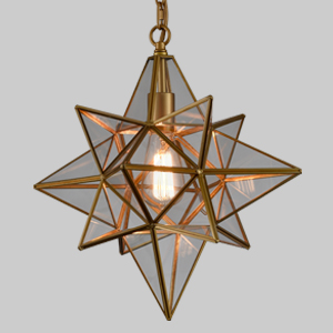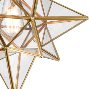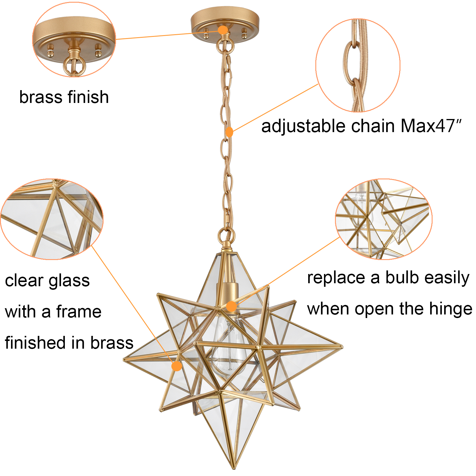 Crafted of impurity-free clear glass, the 16-inch Moravian star pendant light is exquisitely hand-welded. Its canopy, chain, edges of glass shade, and lamp-holder flaunt a gold finish for a touch of shimmer. Its stellated multi-point design adds an element of surprise and whimsy to your living space. Its clear glass shade with excellent light transmittance allows the light to pass right through and pairs nicely with the gold edges featuring copper alloy covering. A hinged access door can be opened for bulb replacement. It is an eye-catching addition to your home with its shiny finish. It can be a new showpiece for your bar, foyer, hallway, kids room and stairwell.