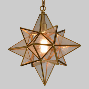 Crafted of impurity-free seeded glass, the Moravian star pendant light with gold finish is exquisitely hand-welded. Its canopy, chain, edges of glass shade, and lamp-holder flaunt a gold finish for a touch of glitz. Its stellated multi-point design adds an element of surprise and whimsy to your living space. It is made translucent with seeded glass, giving a subtly mysterious and dreamy vibe to the bold shape. The seeded glass shade pairs nicely with the gold edges featuring copper alloy covering. A hinged access door can be opened for bulb replacement. It is an eye-catching addition to your home with its shiny finish. It can be a new showpiece for your bar, foyer, hallway, kids room and stairwell.