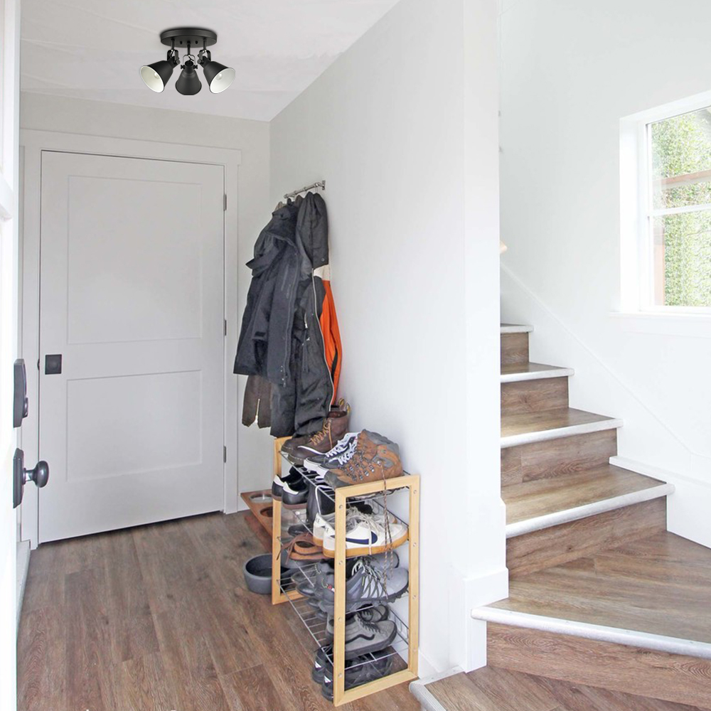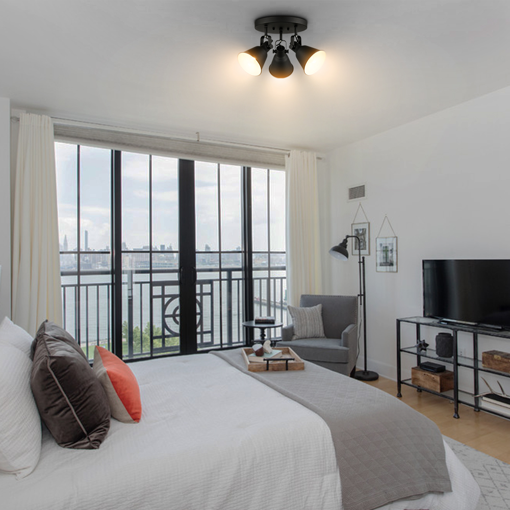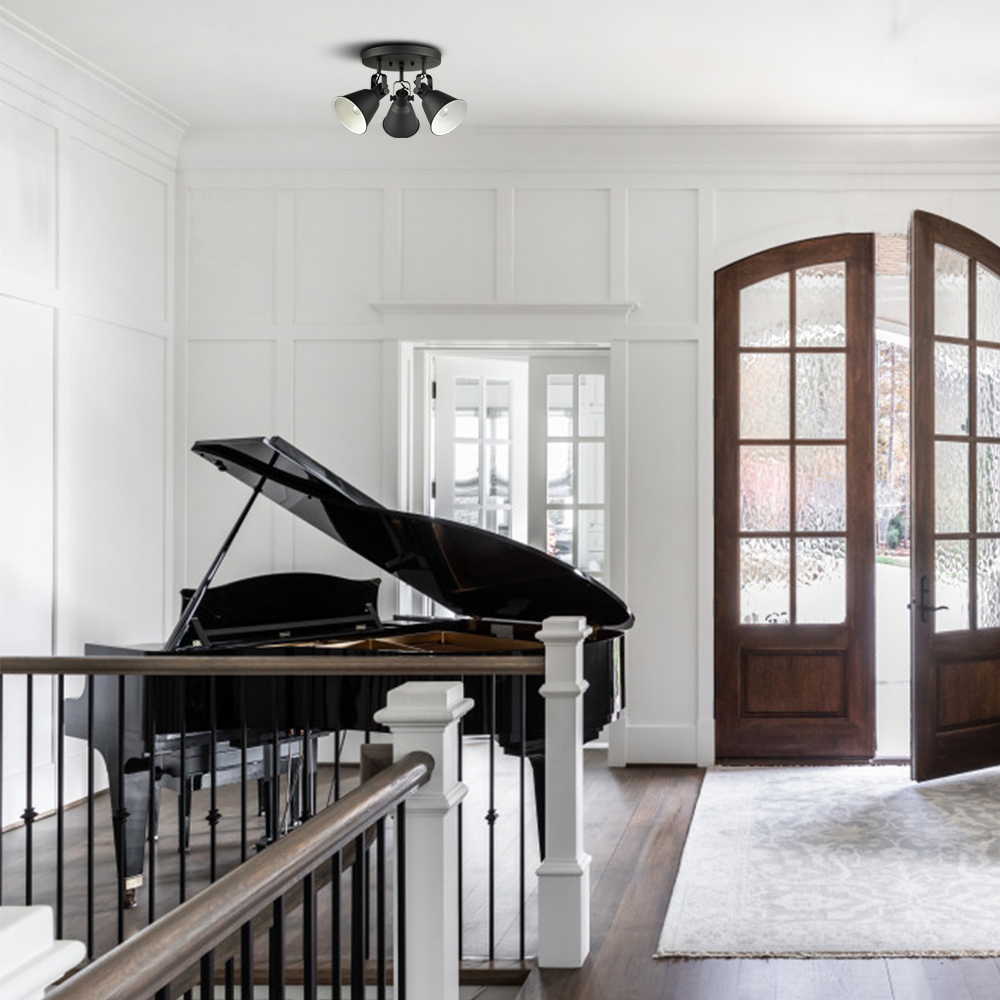 Flaunting a matte black finish, the multi-directional ceiling lights bring a dash of vintage flair to your living space. A trio of cone shades are hung from a matching round canopy for a modern touch and a clean, cohesive look.