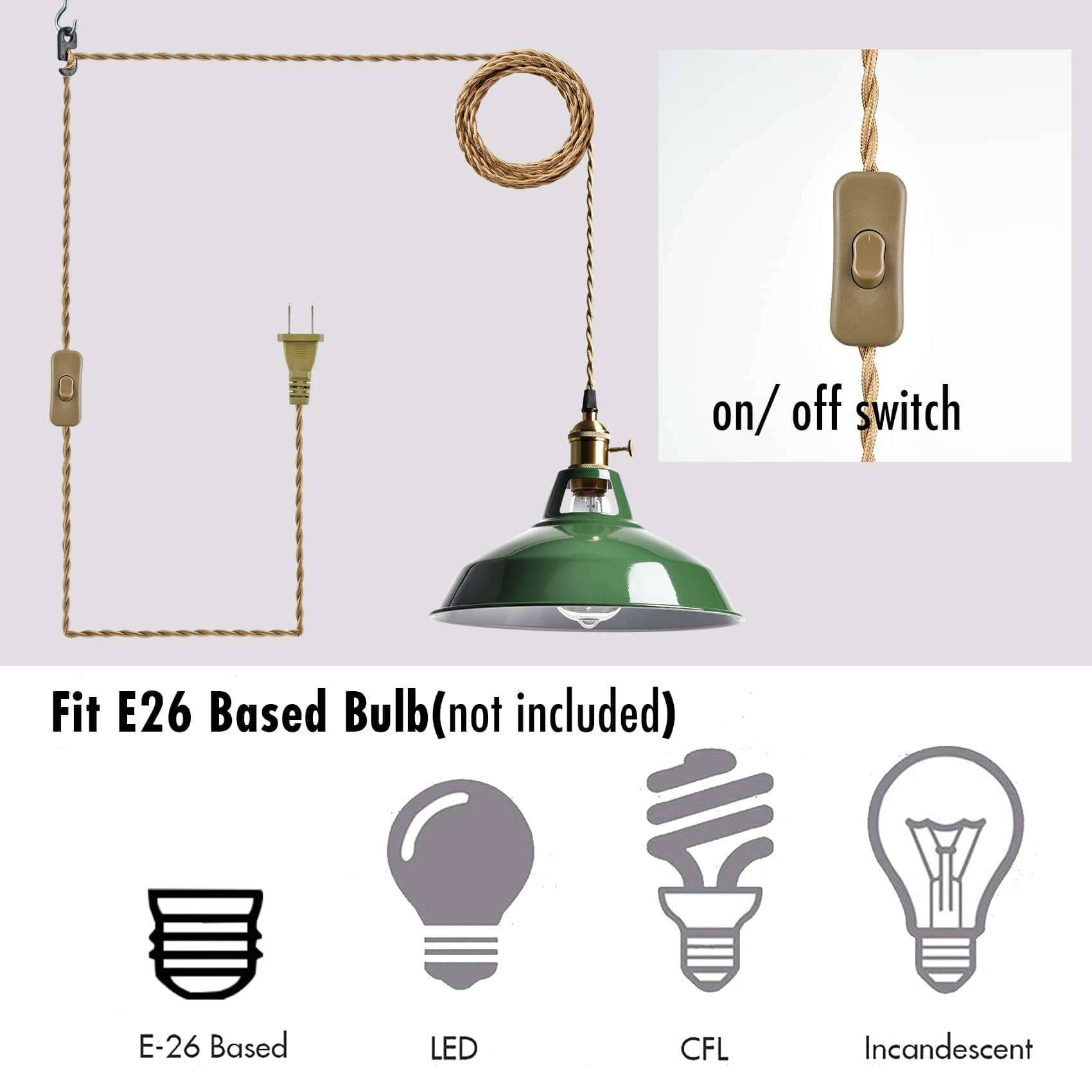 A perfect light to hang a grow bulb over my indoor plants. The metal shade is ideal since it has openings to release heat from the bulb. The cord is long twisted nylon & it has an inline rocker switch, though the light can also be turned on & off at the socket. Hooks & hangers were included. The light is lightweight overall & was easy to assemble & install. Very pretty & it's working out great.