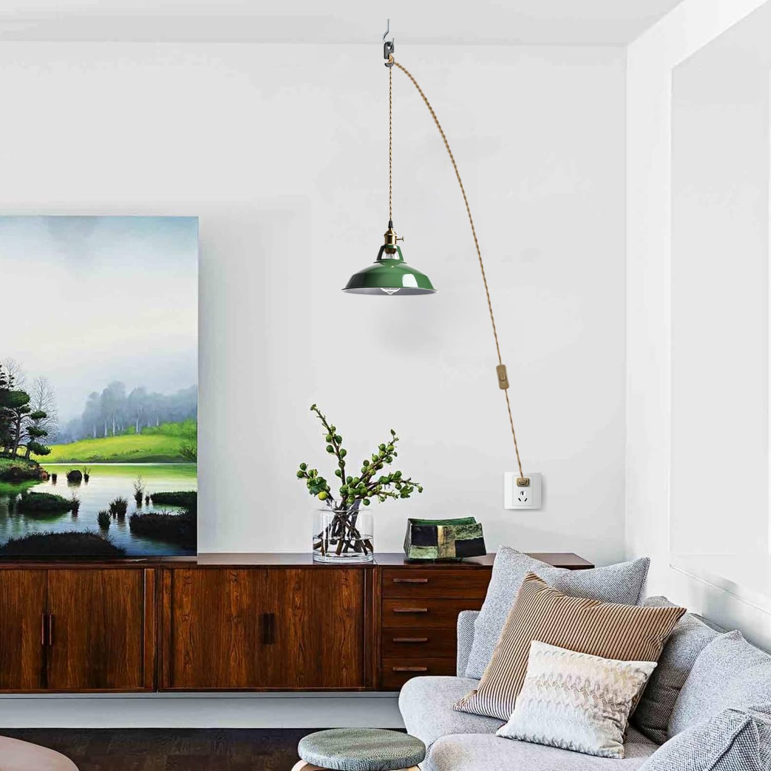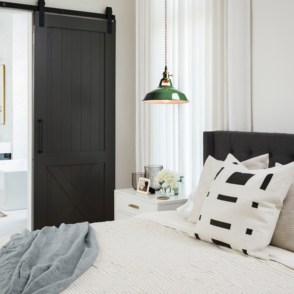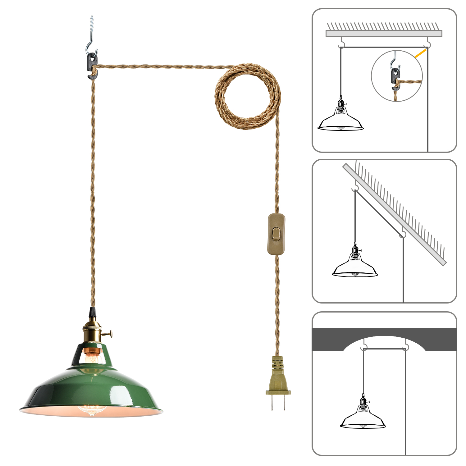 The plug-in pendant light’s barn shade shows off a green finish while its lamp holder, rotary switch, and plug-in cord flaunt a gold finish. The white interior of the barn shade helps reflect the light. A mix of finishes encompasses both a dash of drama and a touch of shimmer, yet maintains a modern edge. Its green finish gives your home a snappy look and a glamorous, refreshing vibe. Its shiny gold finish offers a stark contrast to the green finish and adds alluring eye appeal to the space. The switch on the plug-in cord and the rotary switch on the lamp holder are just on/off switches without a dimming function. It comes with a 216.5-inch fabric plug-in cord to suit your different lighting needs. It can accommodate sloped or vaulted ceilings.
