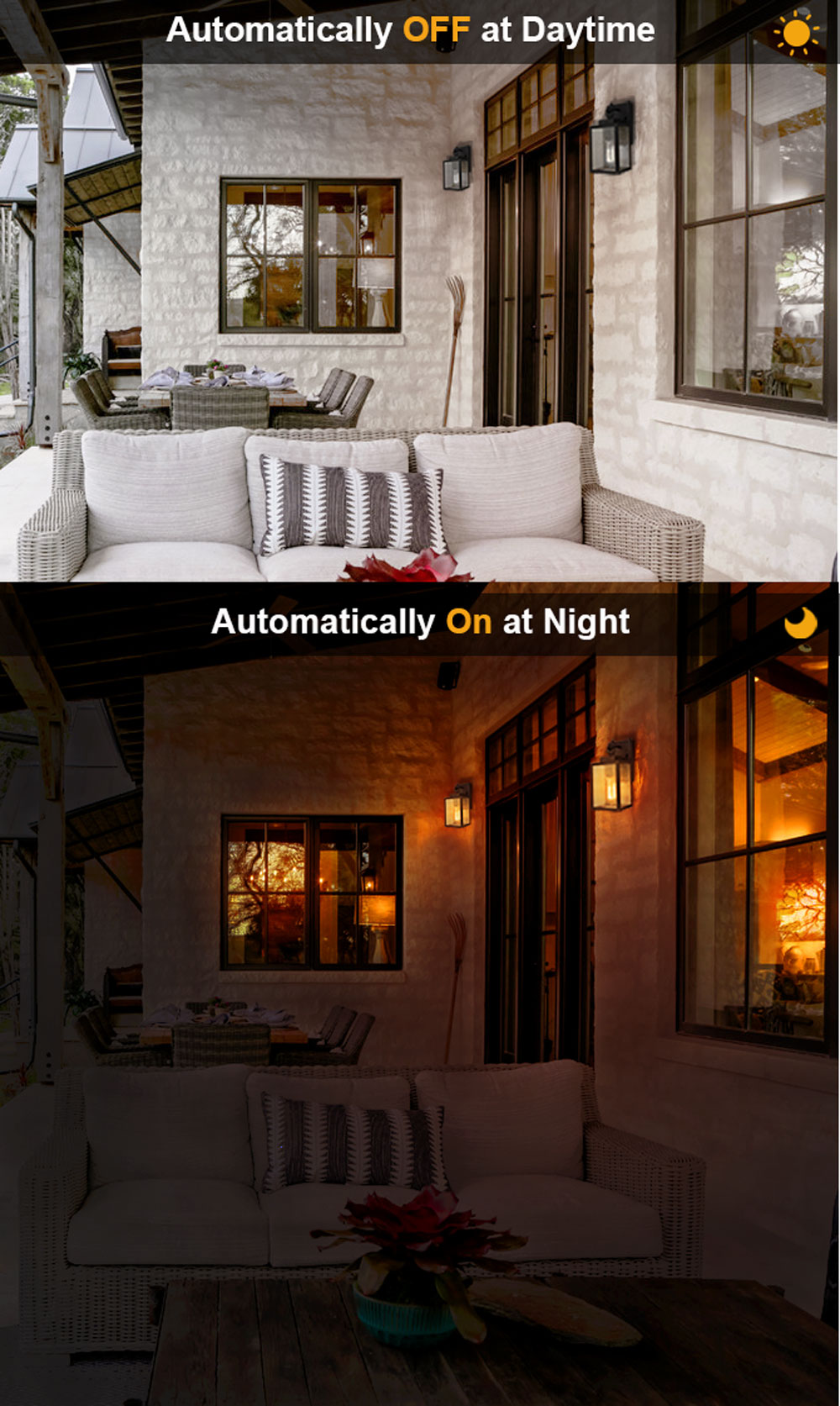 The outdoor porch light wall lights are stunning additions to your outdoor space with their geometric accent. The lampshades are hung on the hook, which adds the right amount of splendor to any space with their intricate design. A built-in sensor in the wall lights’ canopies can detect the daylight level and determine when to light up timely.