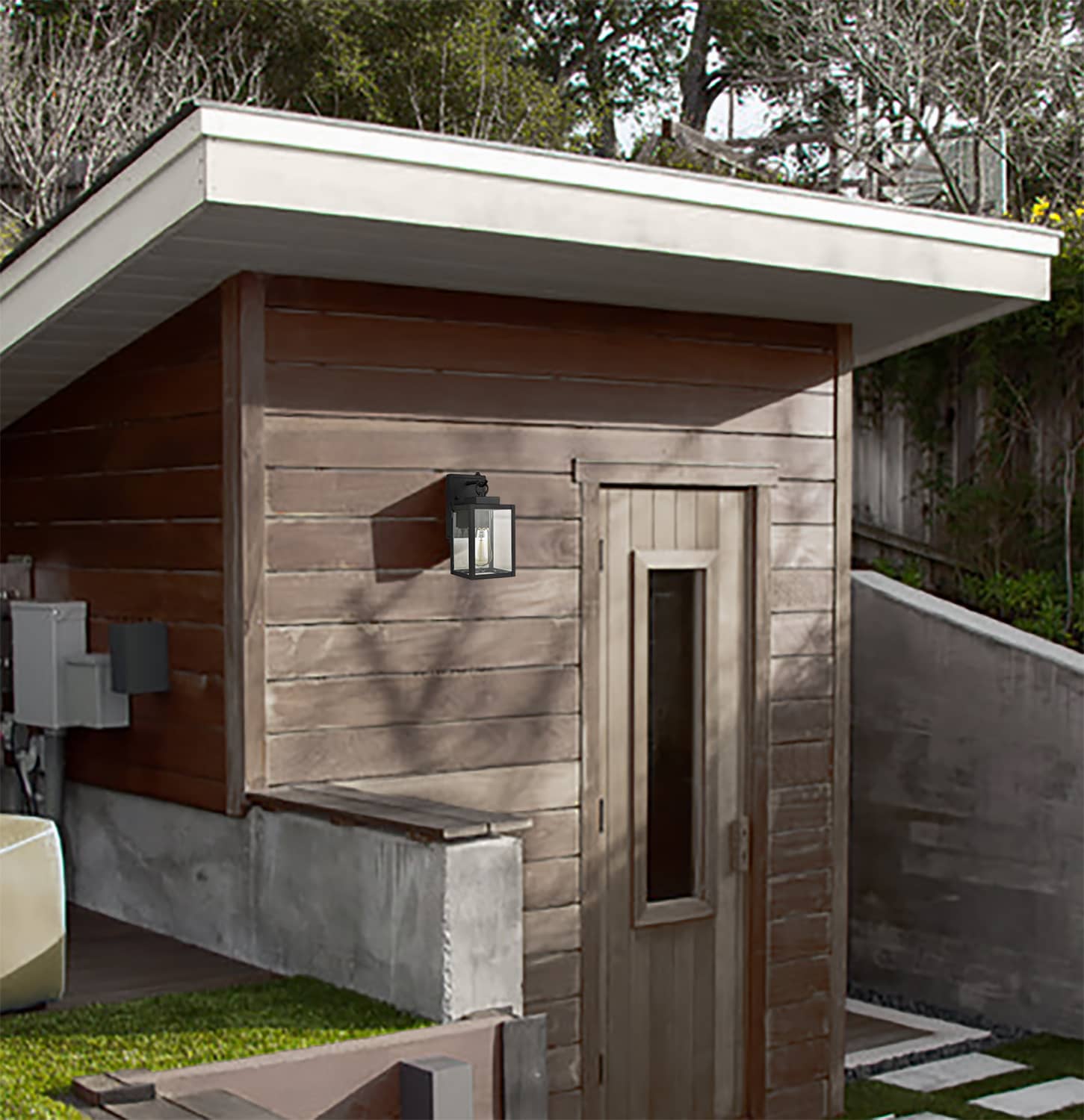 Finished in matte black, the outdoor porch light wall lights lend a dash of farmhouse touch to your outdoor space. Their durable die-cast metal rectangular lampshades show off the beauty of geometry. The tempered clear glass panes with excellent light transmittance allow the light to pass right through.