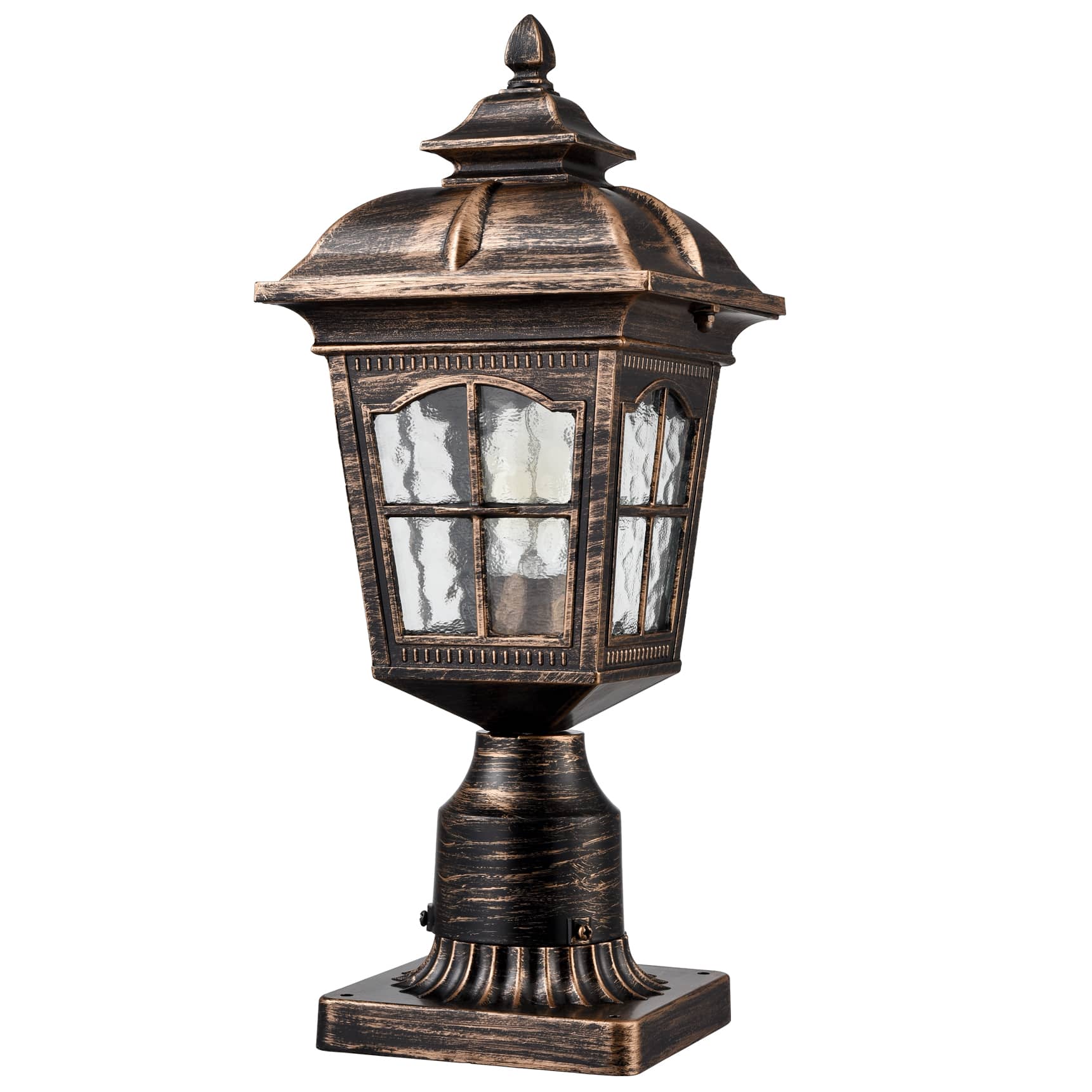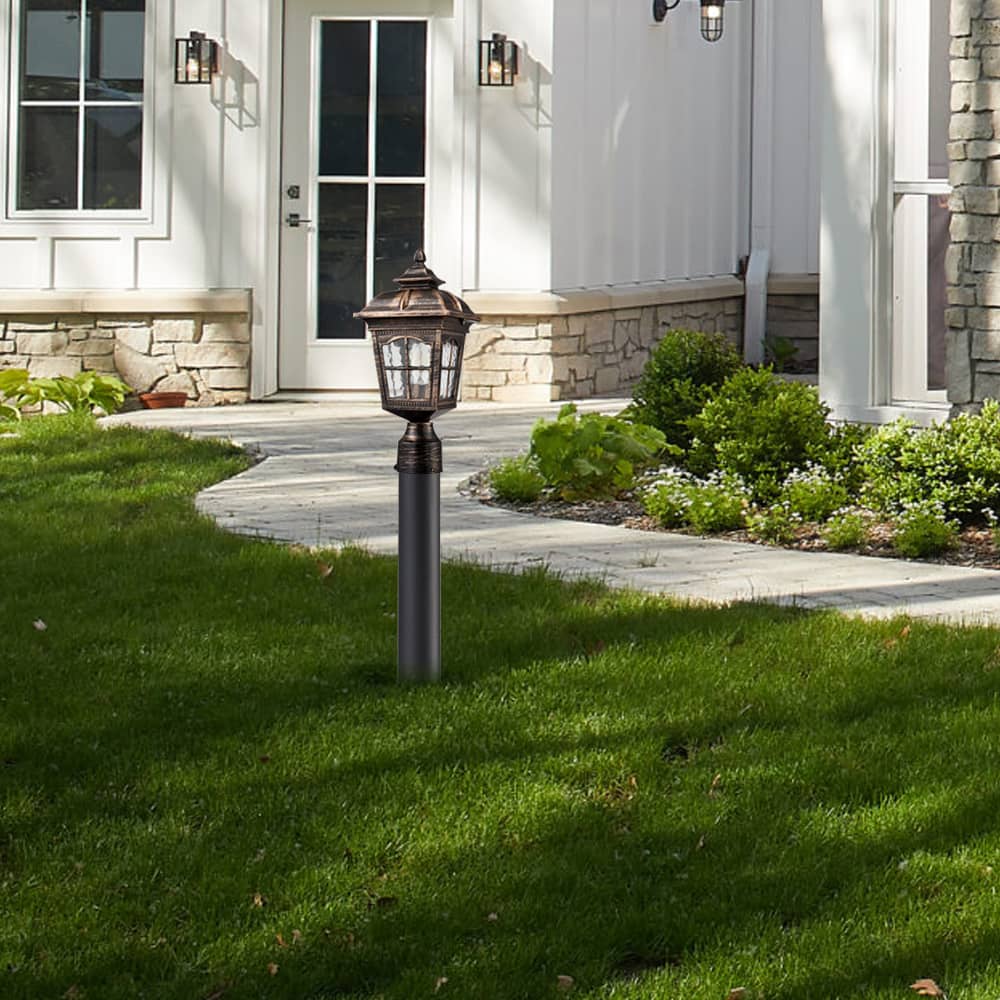 Finished in antique brass with a black tinge, the outdoor post light perks up your alfresco space with a boost of sparkle. Its trapezoid stone-patterned tempered clear glass panels show off the beauty of geometry and convey a refined touch to the space. The light fixture’s framing crisscross accents gracefully embrace its impurity-free hand-blown glass panels, adding the right amount of splendor to any outdoor space. The antique brass finish contrasts the glass panels and adds an alluring eye appeal to the space. It can be both pier mount and post mount with a solid metal base. Being weather-resistant, it is perfect for outdoor use.