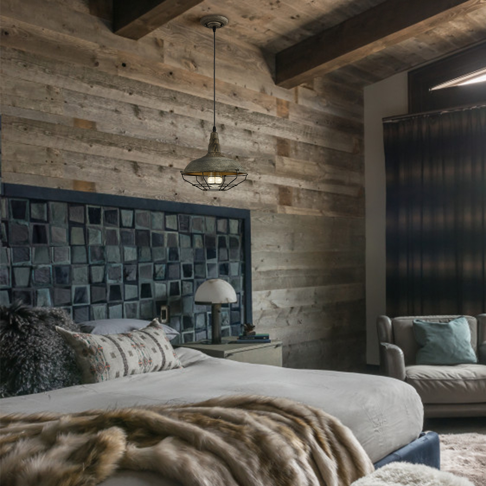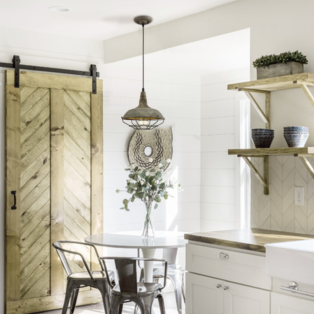 Crafted of solid wrought iron, the pendant light’s dark charcoal gray finish lends a farmhouse-inspired feel to your living space. Its exquisitely welded metal cage dome shade introduces a large dose of industrial vibe to your home decor.