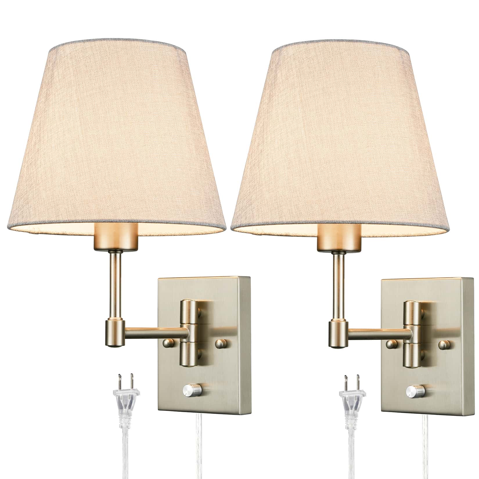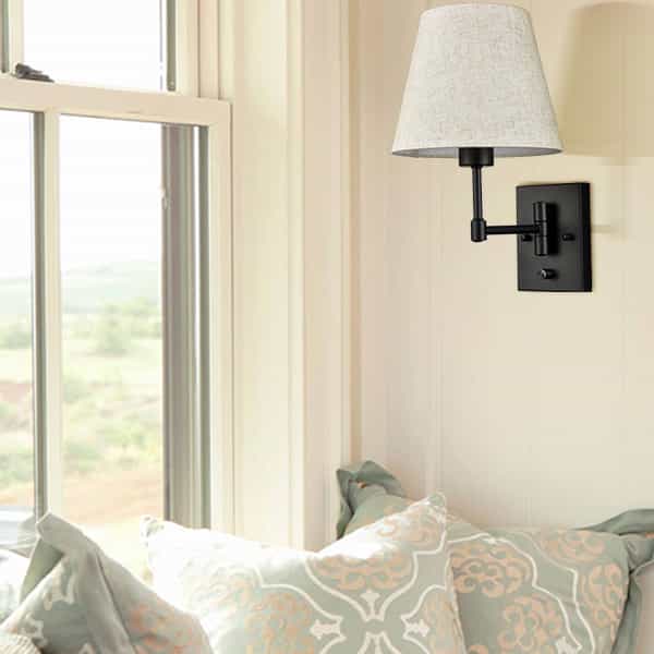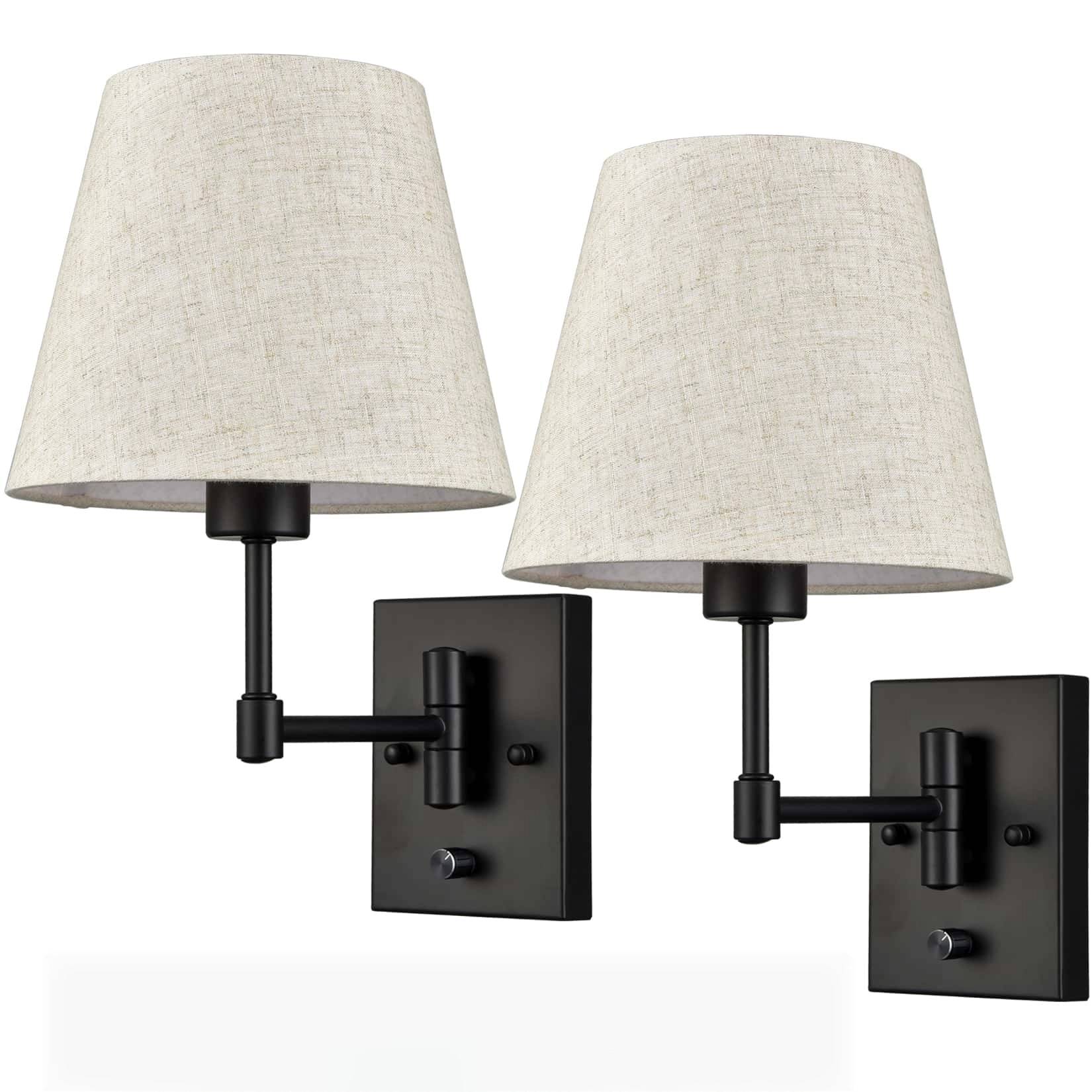The black swing arm wall sconces’ backplates, swing arms, and lamp holders are showing off a semigloss black finish, conveying understated glamour to your home. Their beige trapezoid slub linen shades complete the aesthetic with a large dose of texture. Their trapezoid linen shades contrast the black finish and add alluring visual interest to the living area. Their trapezoid drum shades give your living space a touch of geometry. The switch on the wall sconces is just an on/off switch without a dimming function. They come with 71-inch power cords.