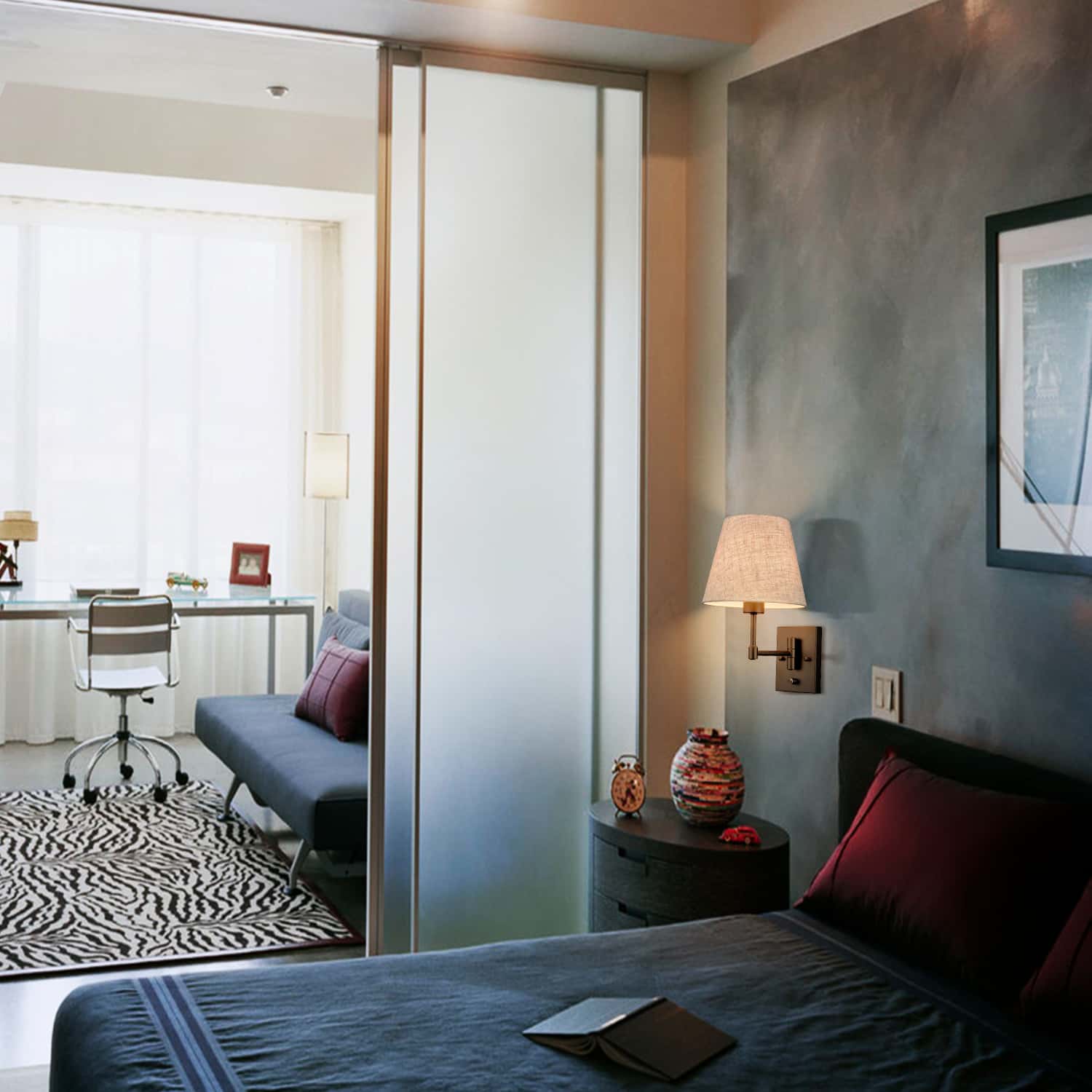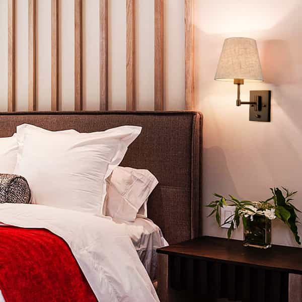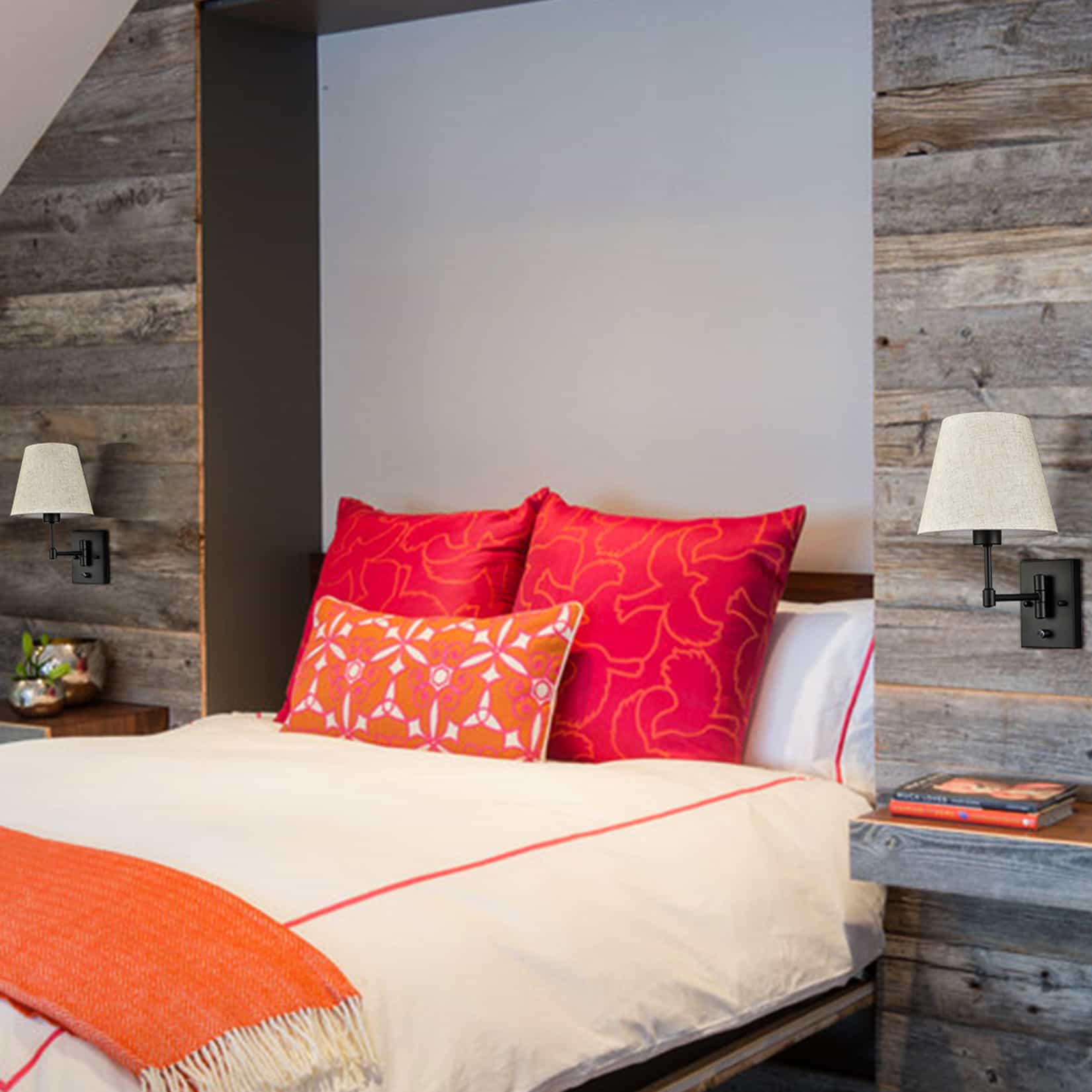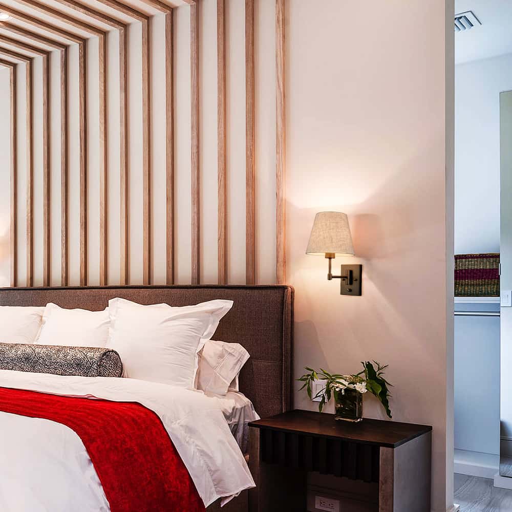 The black swing arm wall sconces’ backplates, swing arms, and lamp holders are showing off a semigloss black finish, conveying understated glamour to your home. Their beige trapezoid slub linen shades complete the aesthetic with a large dose of texture. Their trapezoid linen shades contrast the black finish and add alluring visual interest to the living area. Their trapezoid drum shades give your living space a touch of geometry. The switch on the wall sconces is just an on/off switch without a dimming function. They come with 71-inch power cords.
