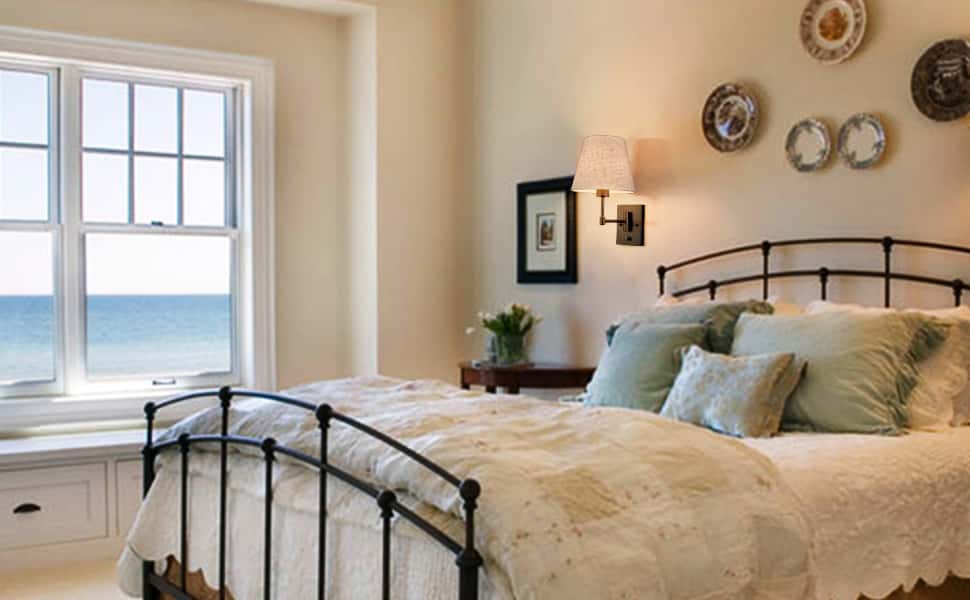 The black swing arm wall sconces’ backplates, swing arms, and lamp holders are showing off a semigloss black finish, conveying understated glamour to your home. Their beige trapezoid slub linen shades complete the aesthetic with a large dose of texture. Their trapezoid linen shades contrast the black finish and add alluring visual interest to the living area. Their trapezoid drum shades give your living space a touch of geometry. The switch on the wall sconces is just an on/off switch without a dimming function. They come with 71-inch power cords.