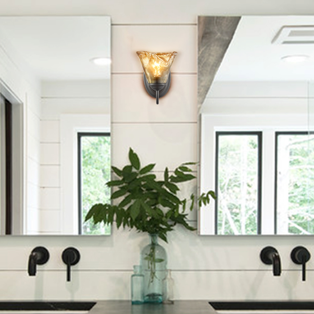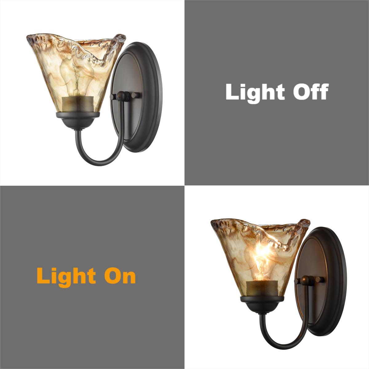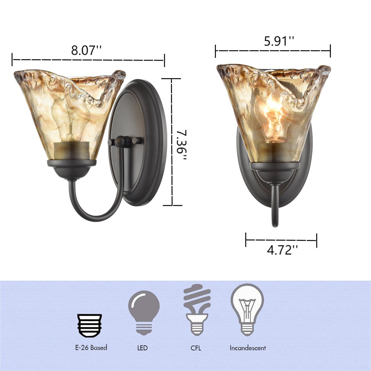 The wall sconces flaunt an oil rubbed bronze finish, conveying a vintage flair to your living space. Their amber art glass shades bring a luxurious appeal and artistic charm to your aesthetic. The glass cone shades that are held aloft by the elegantly curved goosenecks add the right amount of splendor to any space. The goosenecks largely resemble the twigs while the glass shades look like the flowers on the twigs. The oil rubbed bronze finish contrasts the glass shades and adds alluring eye appeal to the space. The glass shades are perched on the oval backplate to supply a dash of drama and a touch of geometry. They can be mounted as uplights or downlights to suit your different lighting needs.