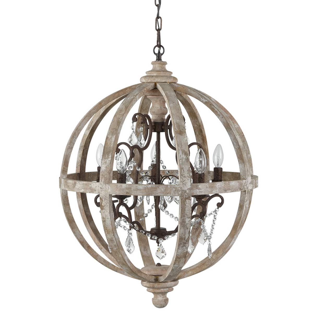 A mini metal chandelier accented with crystal is nestled in a large wooden spherical frame. Crafted of weathered wood, the large wooden frame lends a farmhouse charm to your home decor. Finished with rusty dark brown, the mini chandelier inside the wooden frame encompasses scrolling arms and five candelabra-inspired lights.