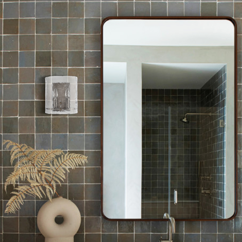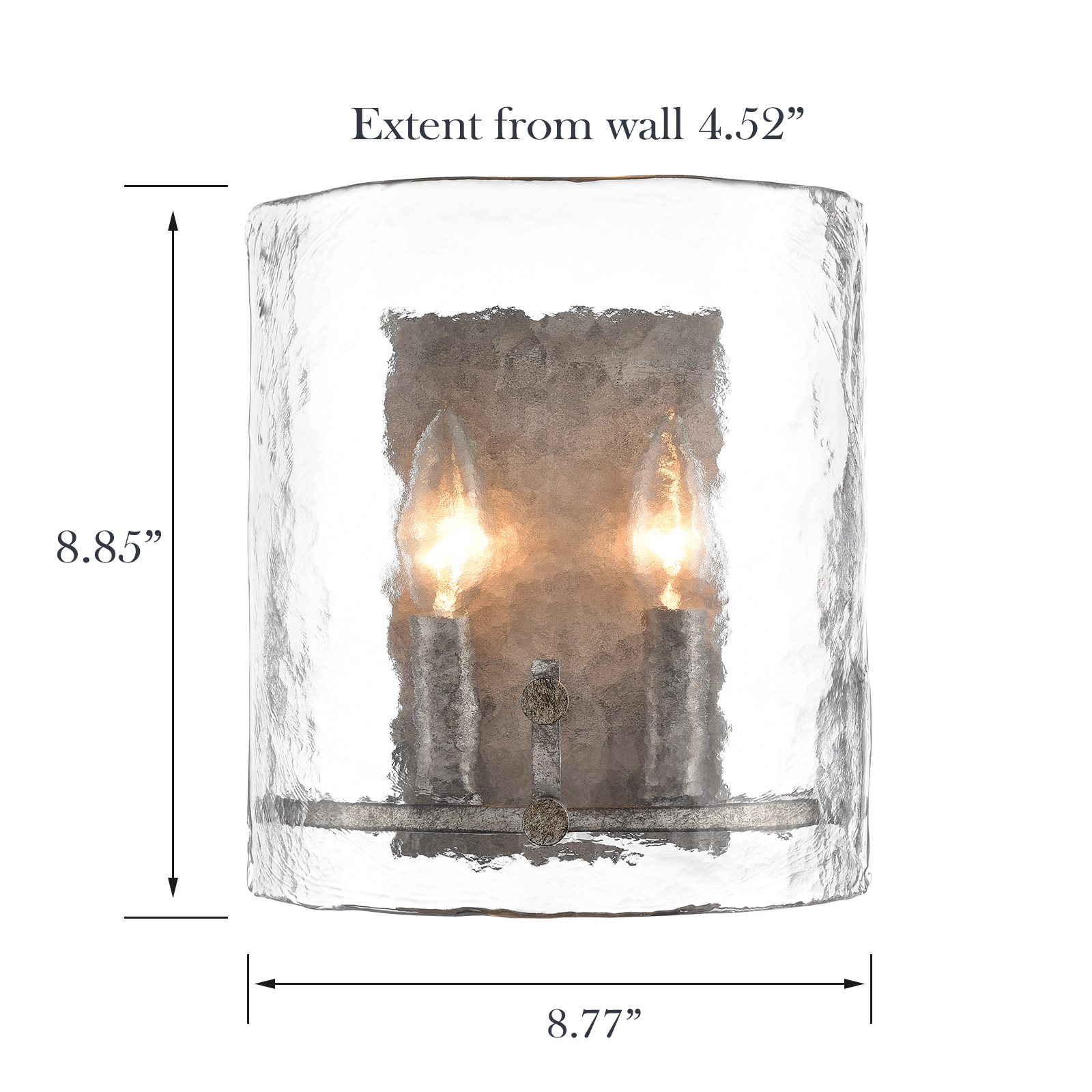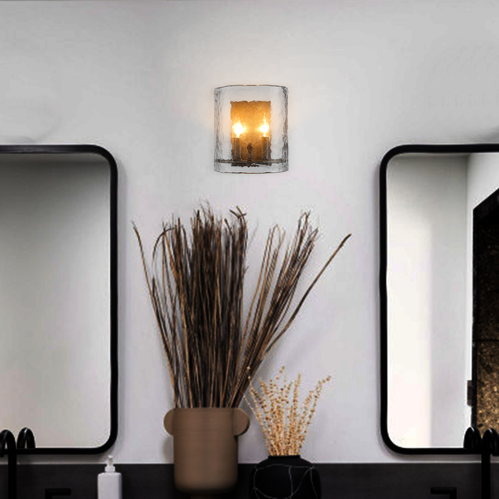 The wall sconce shows off a rustproof rusty gray finish, introducing a touch of rustic charm to your living space. Its opaque semicircular contour-baked glass shade is held aloft by a metal frame, bringing rich visual interest to your interior. Its glass shade is designed to house two candelabra-inspired sockets pointing upward to complete the aesthetic. Its rectangular canopy and the semicircular glass add both stunning decorative detail and a touch of geometry to the living space. Its lampshade contrasts the rusty gray finish and adds charisma and drama to the living area. A charming glow shines through the opaque glass shade, creating intriguing light effects and shades.