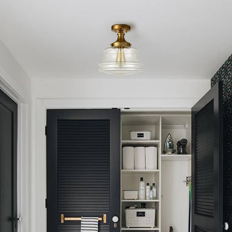 The semi flush ceiling light's canopy, stem, and lamp holder are accented with a rustproof electrophoretic brass finish, perking up your interior with a touch of shimmer. Crafted of impurity-free hand-blown clear glass, its schoolhouse-inspired lampshade looks like a special drum shade with soft curves. Being a beautifully-detailed glasswork, it generates an understated look that will impress.