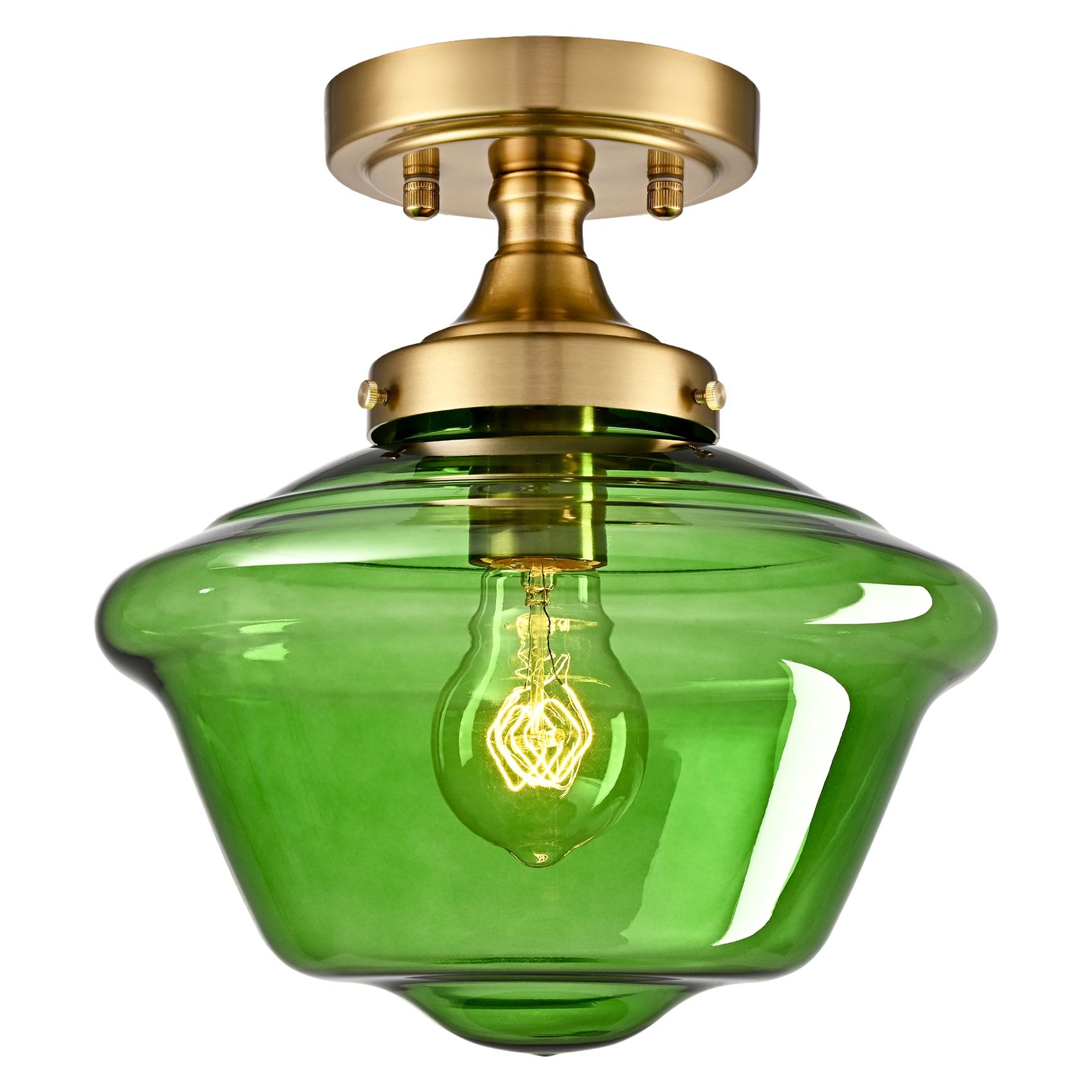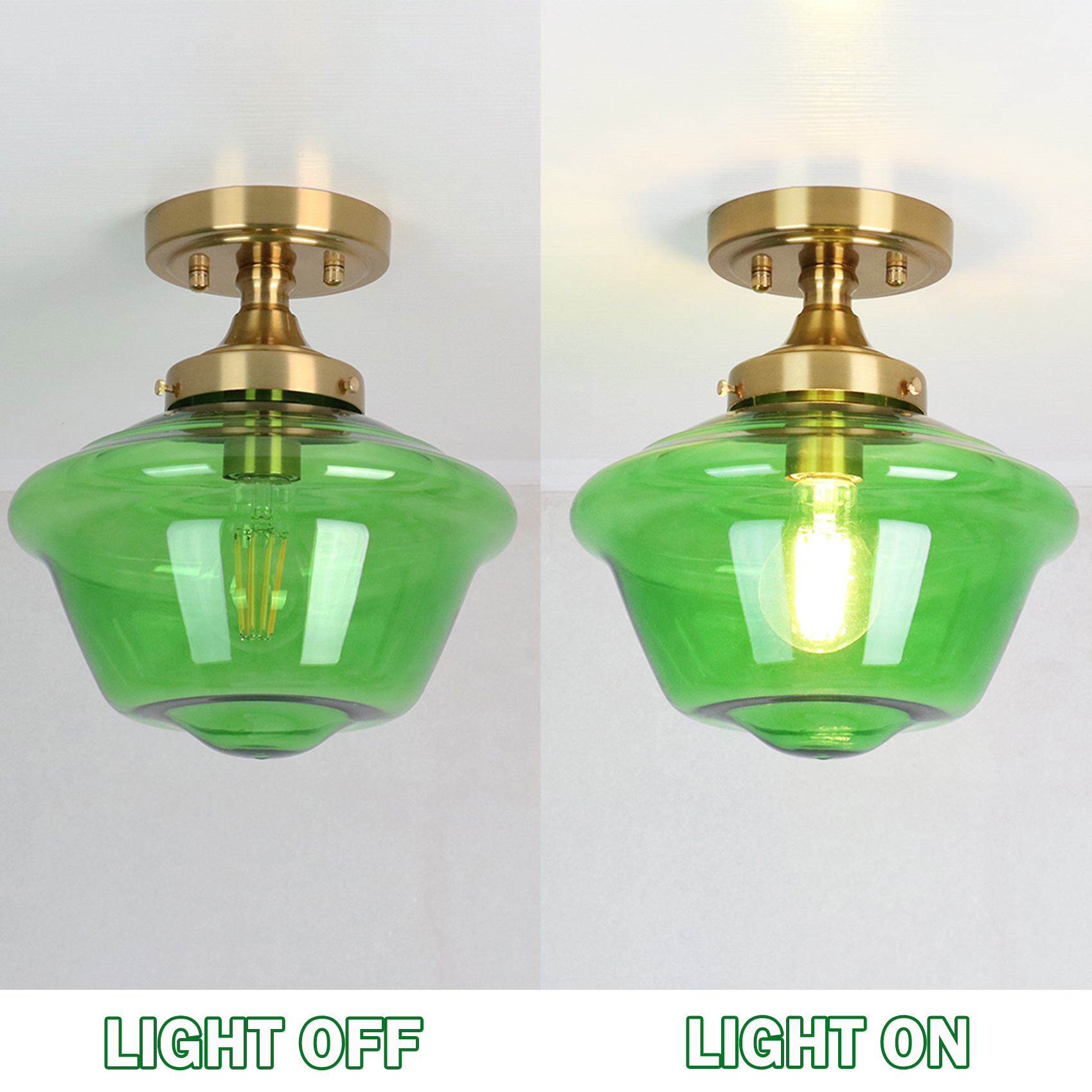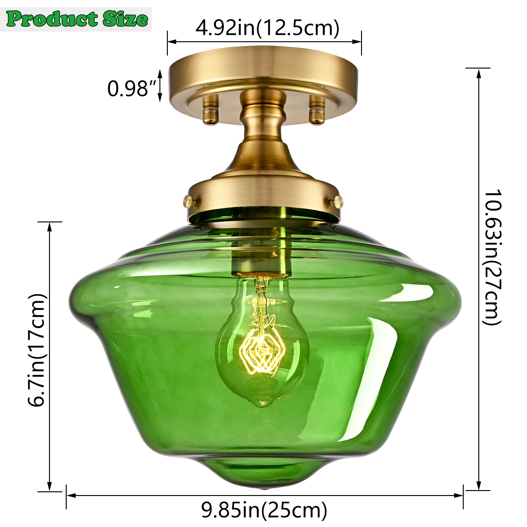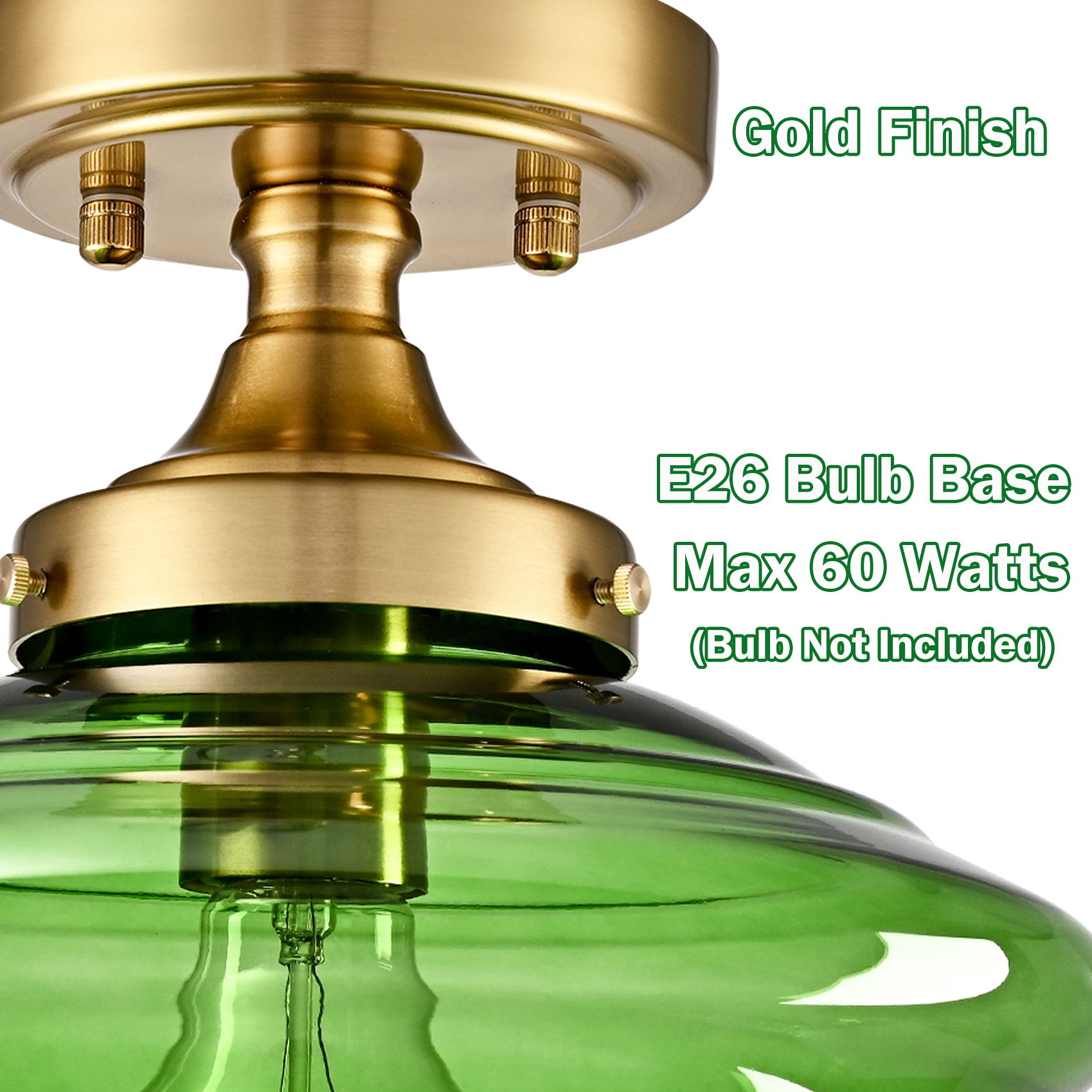 The semi flush mount ceiling light’s canopy and lamp holder showcase an electrophoretic gold finish, livening up your space with glitzy sparkle. Crafted of impurity-free hand-blown glass, its schoolhouse-inspired lampshade flaunts a green finish. Its mix of finishes encompasses both a dash of drama and a ton of eye appeal, yet maintains a touch of modernity. Its green lampshade gives your home a snappy look and a glamorous, refreshing vibe. Being a beautifully-detailed glasswork, it looks like a special bell shade with soft curves. It generates an elegant look that will impress. Its gold finish contrasts with the green glass shade and adds alluring visual interest to the living area.