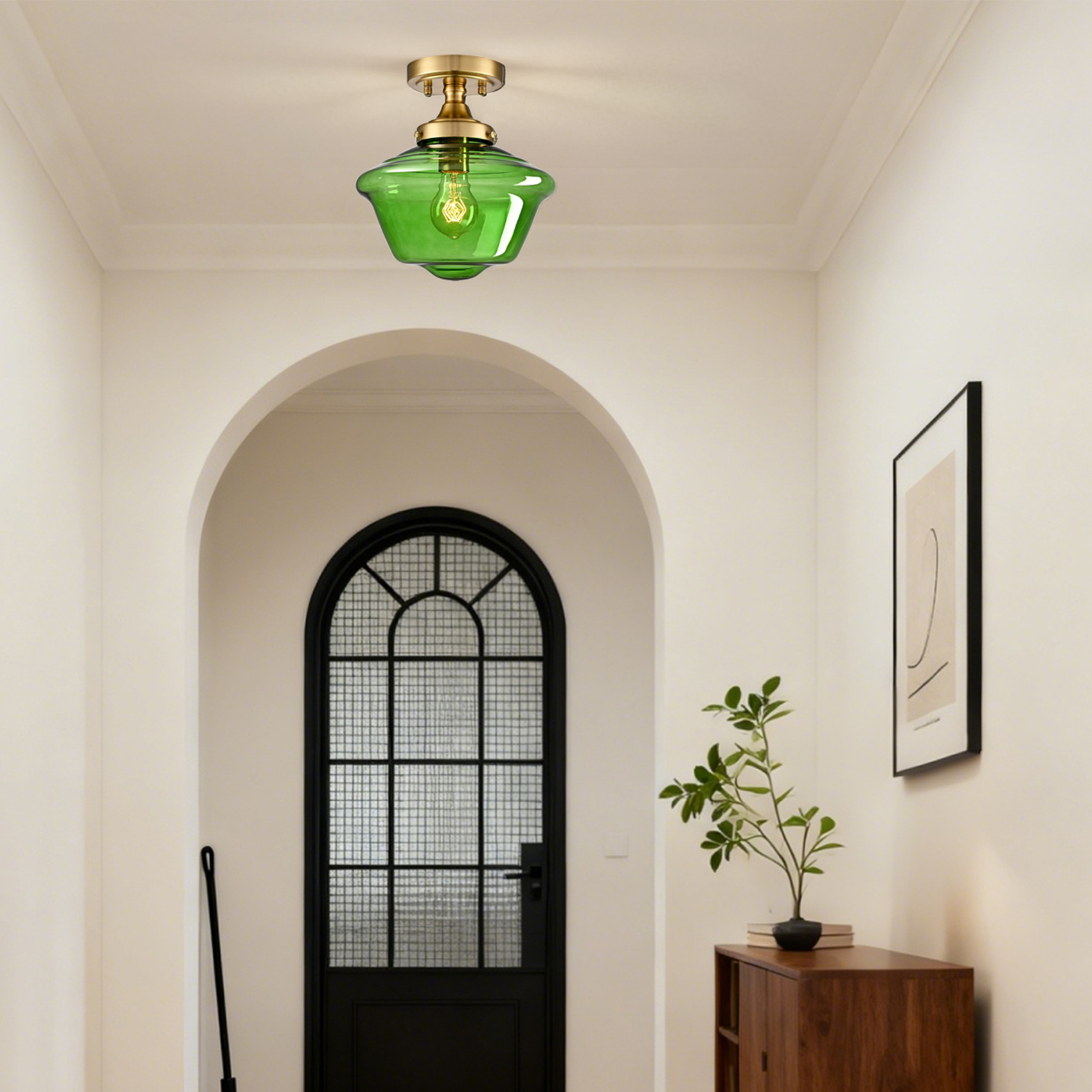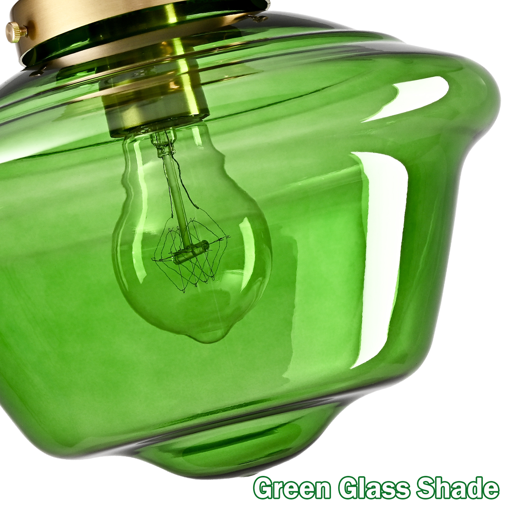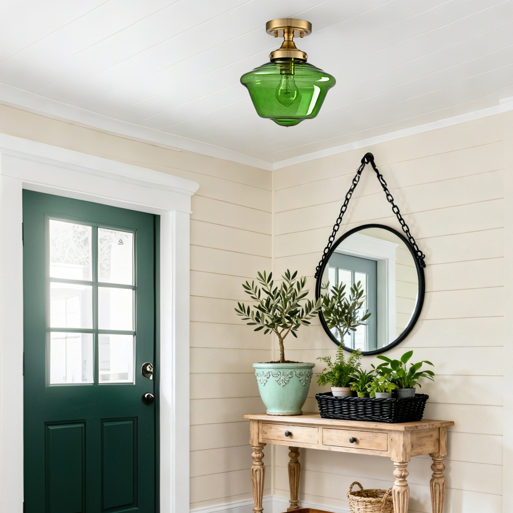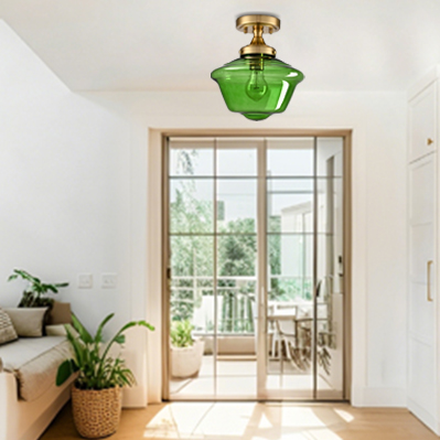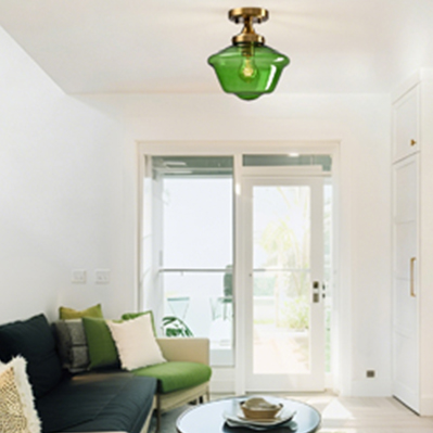 The semi flush mount ceiling light’s canopy and lamp holder showcase an electrophoretic gold finish, livening up your space with glitzy sparkle. Crafted of impurity-free hand-blown glass, its schoolhouse-inspired lampshade flaunts a green finish. Its mix of finishes encompasses both a dash of drama and a ton of eye appeal, yet maintains a touch of modernity. Its green lampshade gives your home a snappy look and a glamorous, refreshing vibe. Being a beautifully-detailed glasswork, it looks like a special bell shade with soft curves. It generates an elegant look that will impress. Its gold finish contrasts with the green glass shade and adds alluring visual interest to the living area.