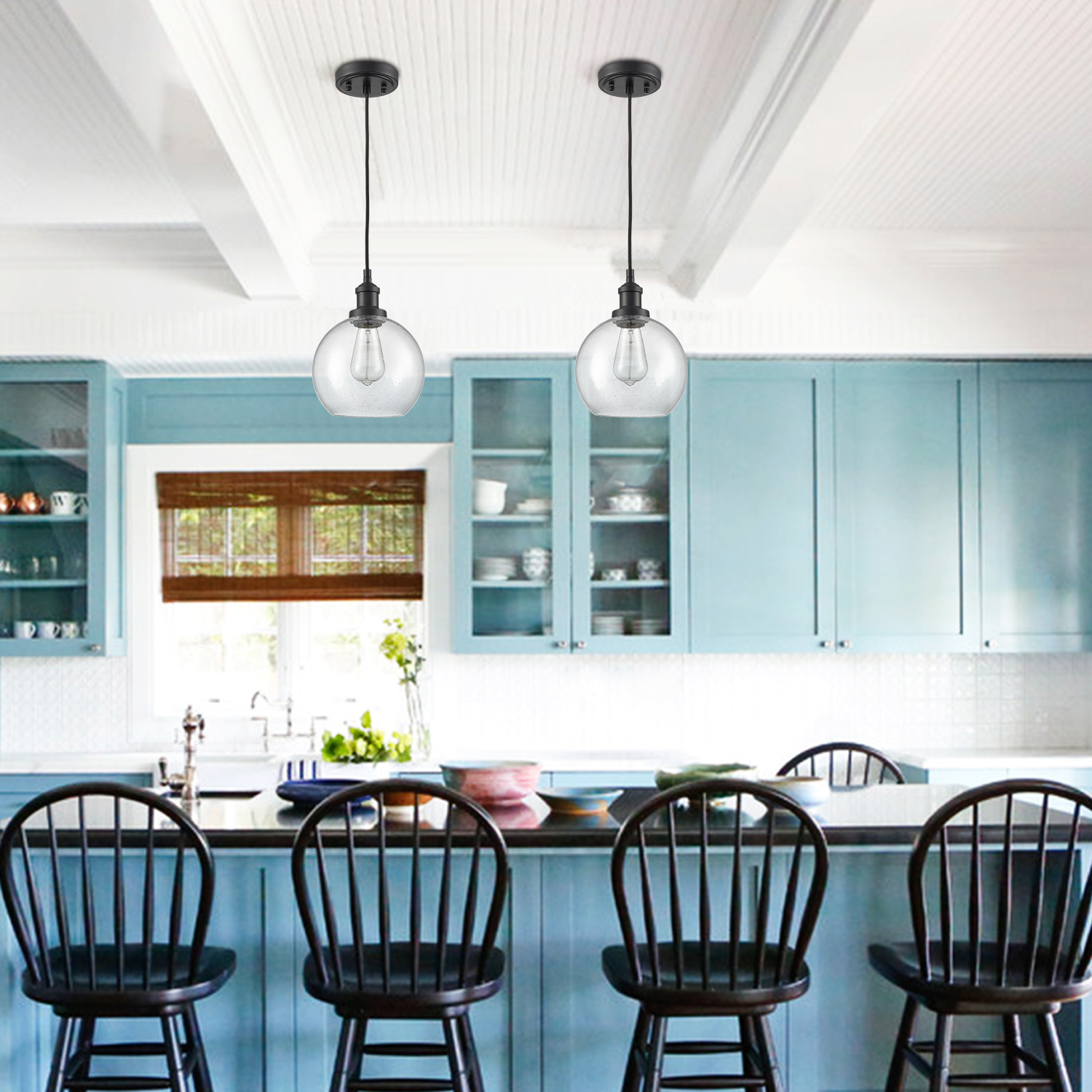 The seeded glass globe pendant light’s canopy, hanging cord, and lamp holder sport an elegant semi-gloss black finish, bringing a dash of drama to your interior. Crafted of impurity-free hand-blown seeded glass, its globe shade delivers a dream-like vibe and showcases the beauty of geometry. It is an awesome addition to your space with its modern sophistication. Add this stunning showpiece to your kitchen and dining room to complete your modern look. Its black finish contrasts the seeded glass shade and adds alluring visual interest to the space. It comes with a 47.2-inch adjustable black fabric cord.