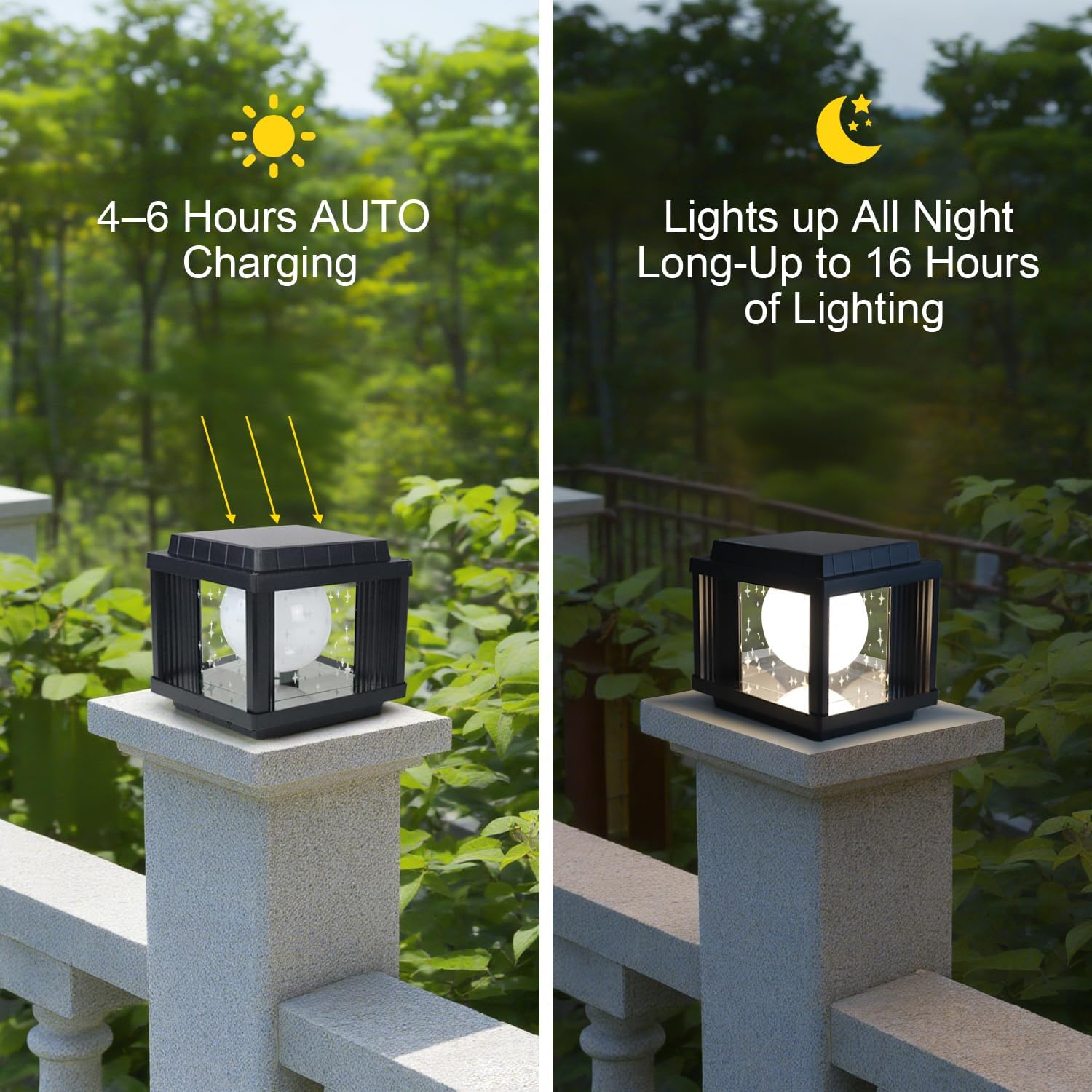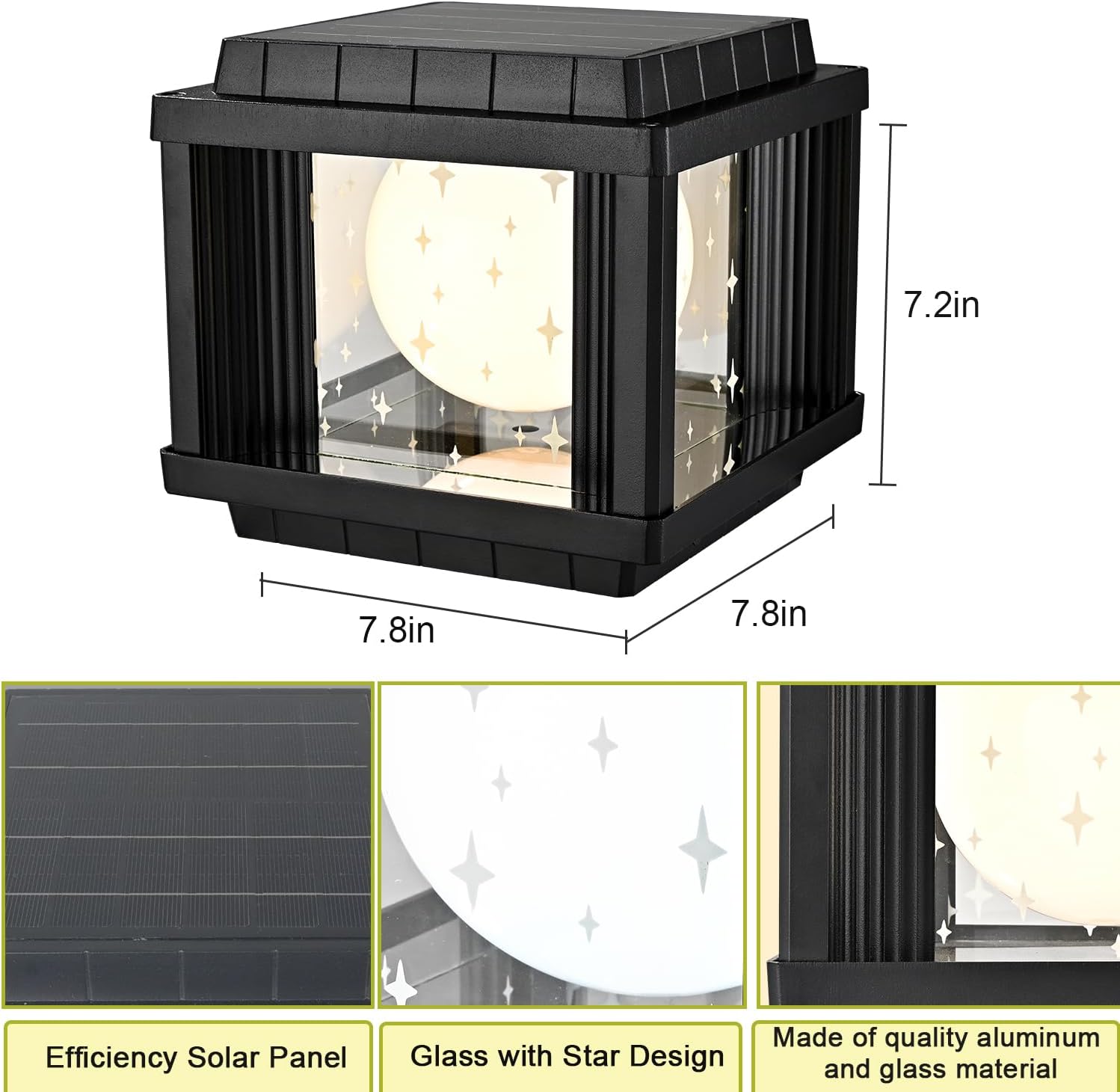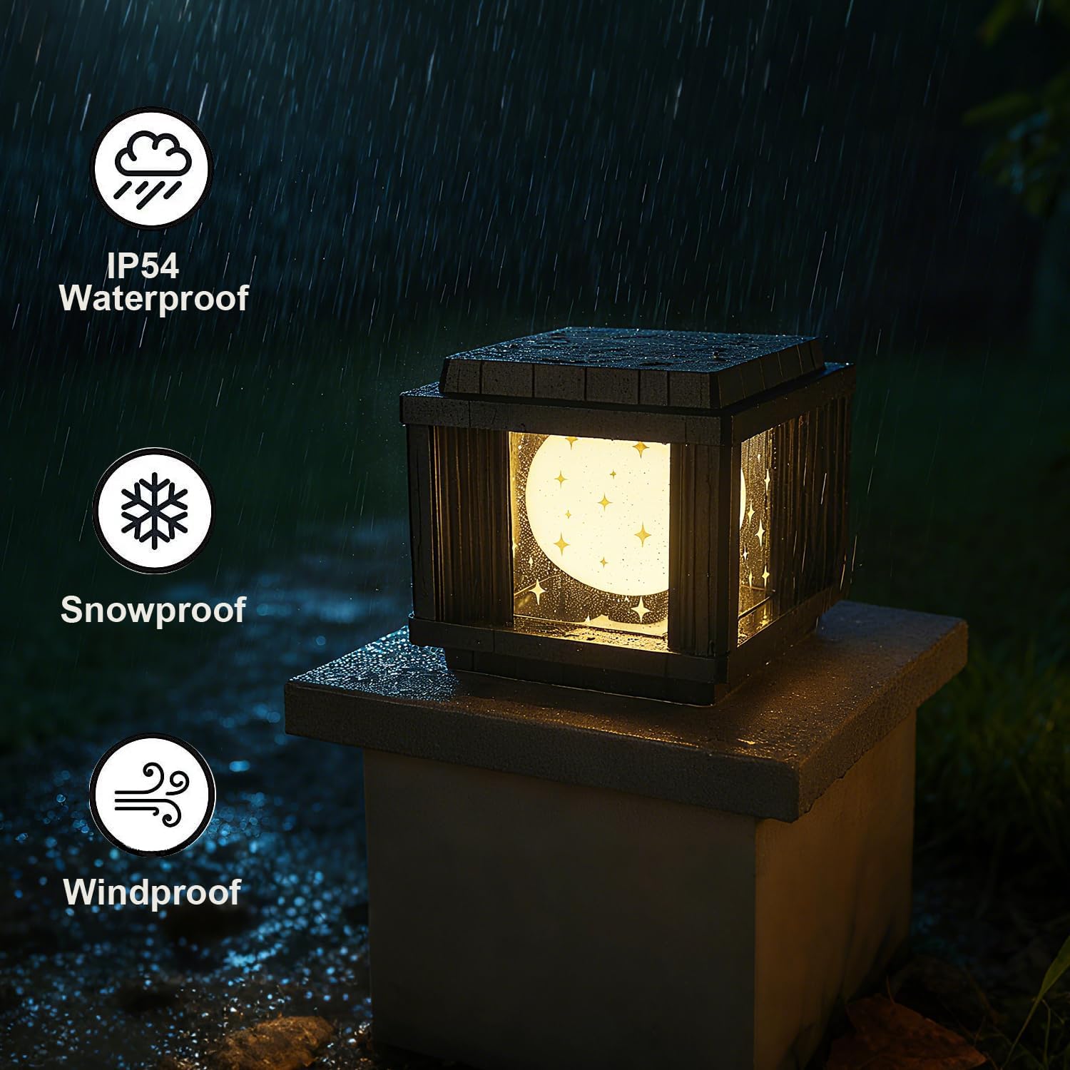 Flaunting a matte black finish, the solar post light perks up your alfresco space with a touch of urban sophistication. It flaunts a rectangular lampshade crafted of metal and tempered glass with a white PC globe inside the lamp body. The tempered glass panels show off star patterns and give your outdoor space a dose of whimsy and artistic charm. It is IP54 waterproof and perfect for outdoor use. Its celestial-inspired lampshade adds the right amount of splendor to the afresco space. The black finish contrasts with the white PC globe and adds alluring eye appeal to the space.