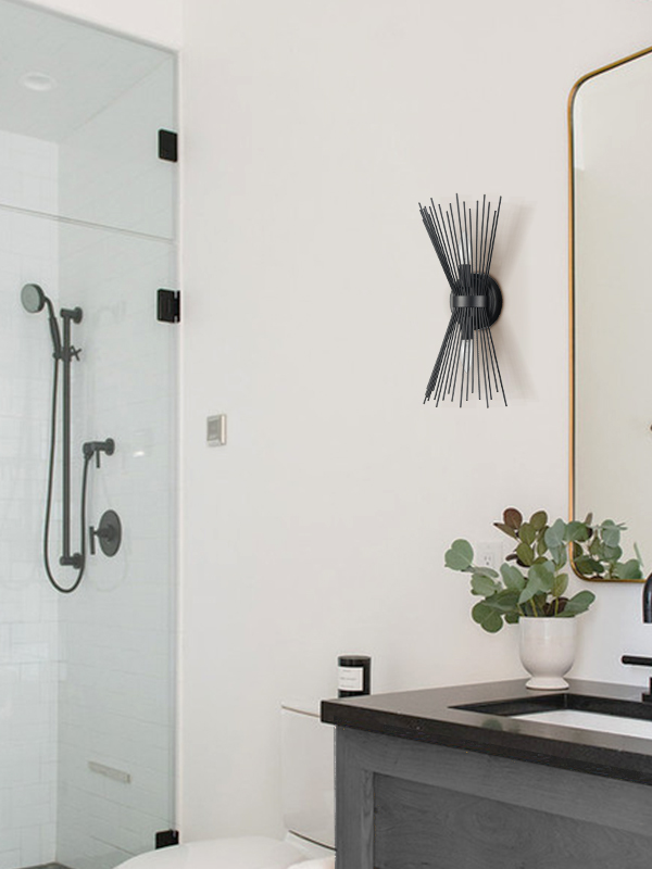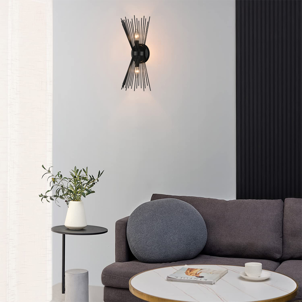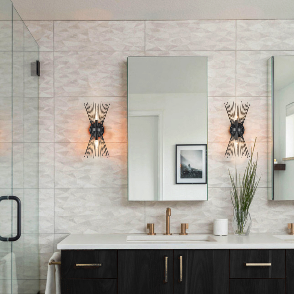 Featuring a mid-century modern style, the industrial starburst wall sconce is accented with a semigloss black finish, livening up your interior with a ton of texture. A myriad of metal rods extending upward and downward constitutes an eye-catching starburst pattern and encircle two exposed bulbs in the middle. Its celestial inspired design adds an element of surprise and whimsy to your living space. It serves as a nice work of art that decorates your blank wall and is a fantastic addition to your home with its stunning design. It can be a new showpiece for your bathroom, bedroom, entryway, foyer, and hallway.