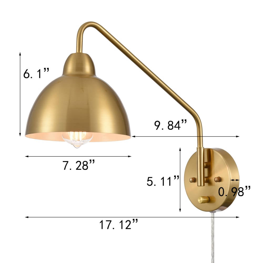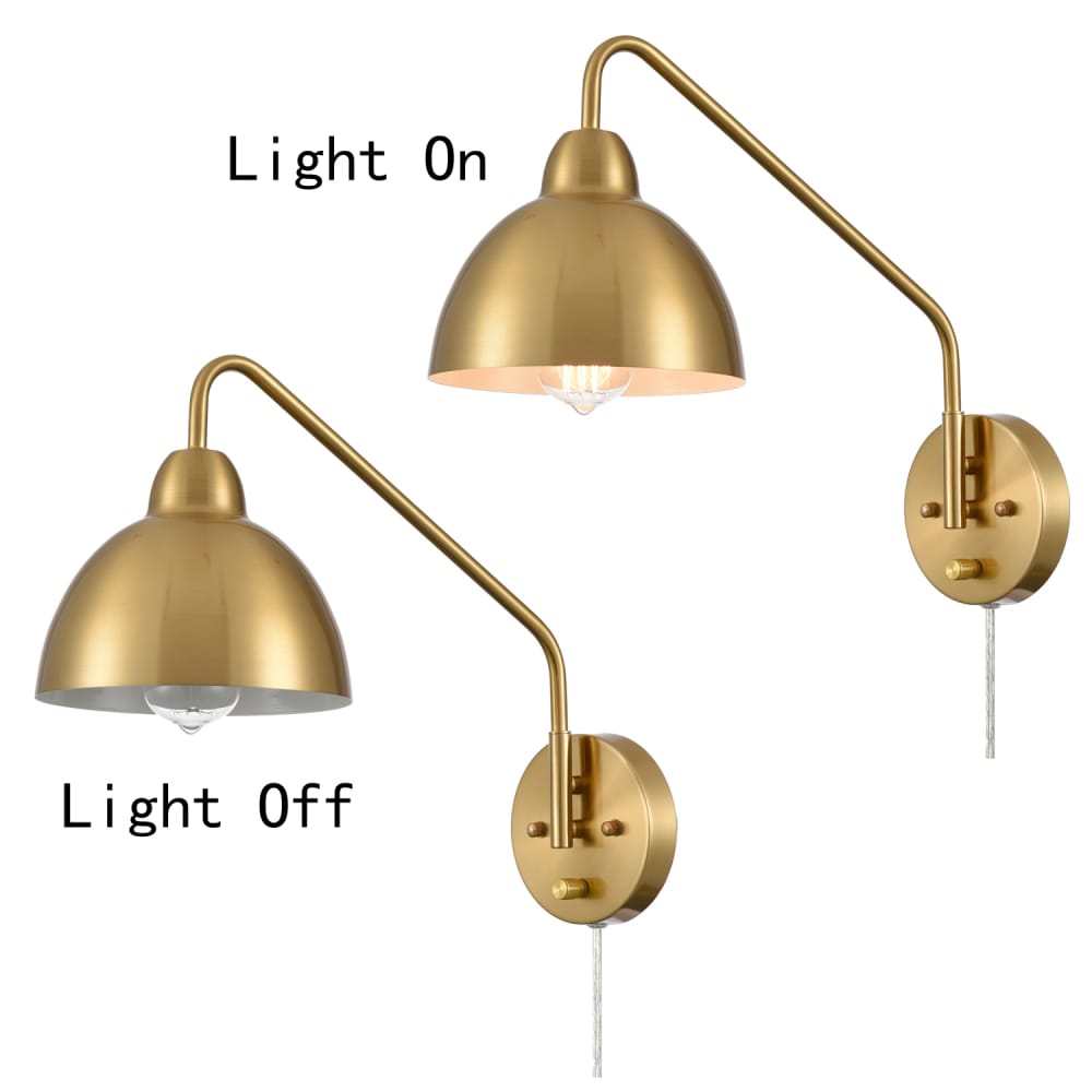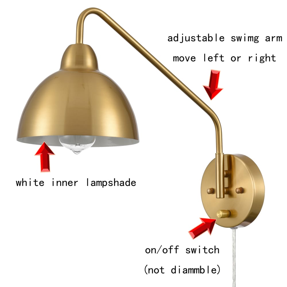 The swing arm wall sconces’ outer surface of dome shades, swing arms and canopies are finished in an electrophoretic brass finish, sprucing up your home interior with a glint of glamour. The inner surface of the dome shades is dressed in a white finish. Their beautiful dual finish makes a modern yet classic statement in your living space. The switch on their canopy is just an on/off switch without a dimming function. Their swing arms are adjustable to pivot 360 degrees horizontally. They can be used to provide both function and style in bedroom, dining room, foyer, kitchen, living room, reading room, and study room. They come with 70.86-inch power cords.