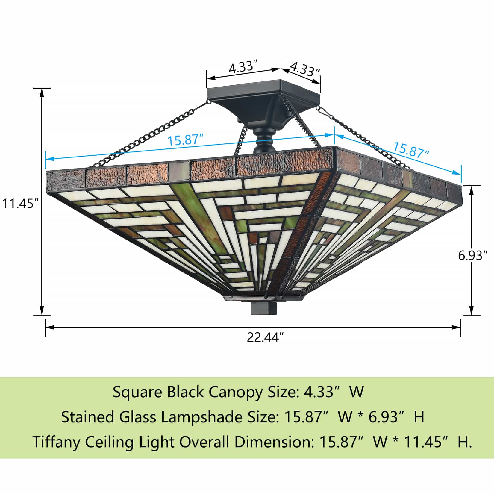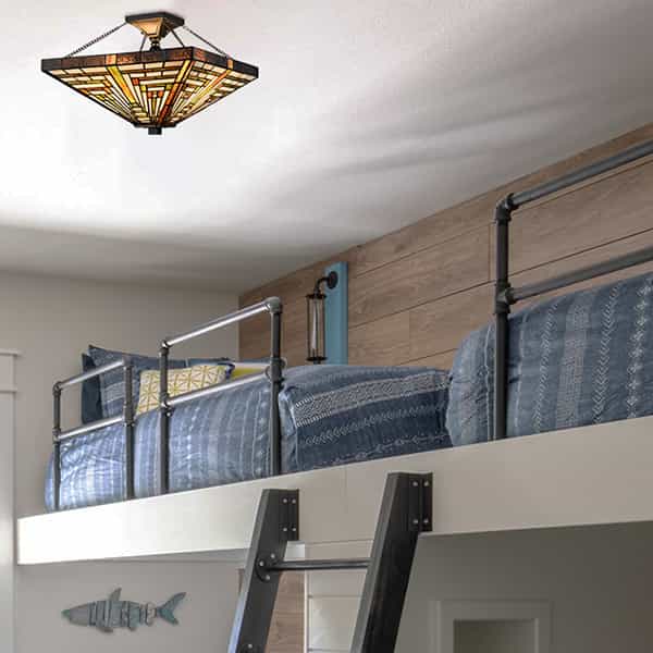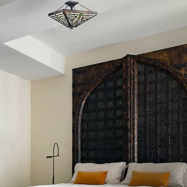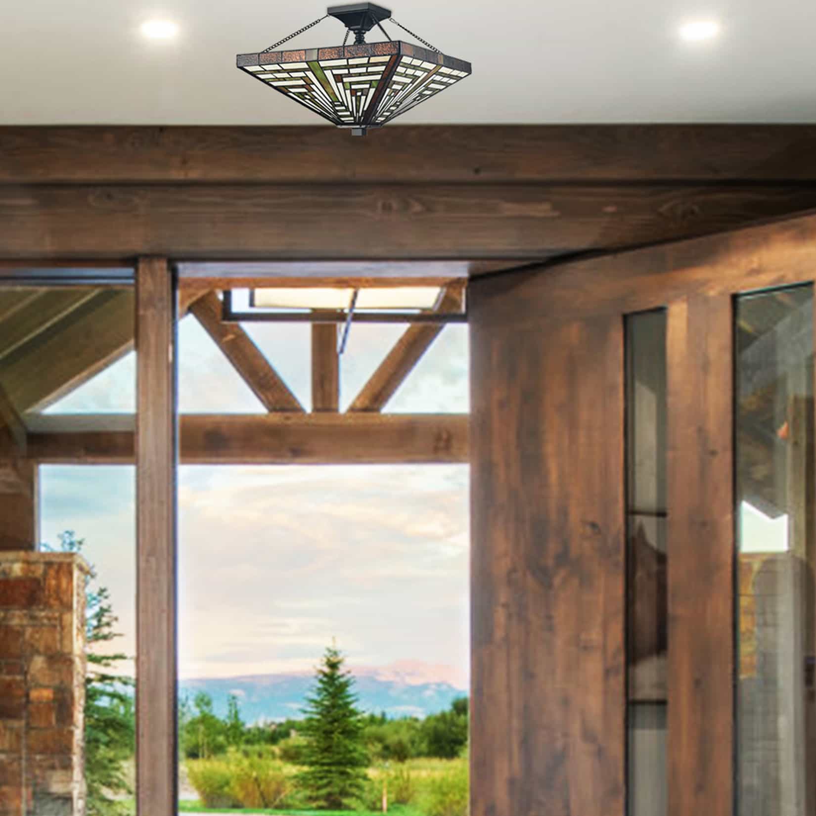 The Tiffany semi flush mount light sports a black finish, giving your living space a touch of urban sophistication. Featuring the copper foil technique, it is crafted of impurity-free hand-blown stained glass. The expertly handcrafted glass shade shows off the craftsman and mission style. The dark-colored detailing on the glass contrasts the brisk colors, which enhances the piece's visual depth and beauty even further. It is held aloft from the canopy by a couple of black chains for a refined touch. Its arms, lamp holders, and bulbs offer a unique three-way swirl design to add alluring visual interest to the space. Its quadrangular silhouette brings a touch of geometry.