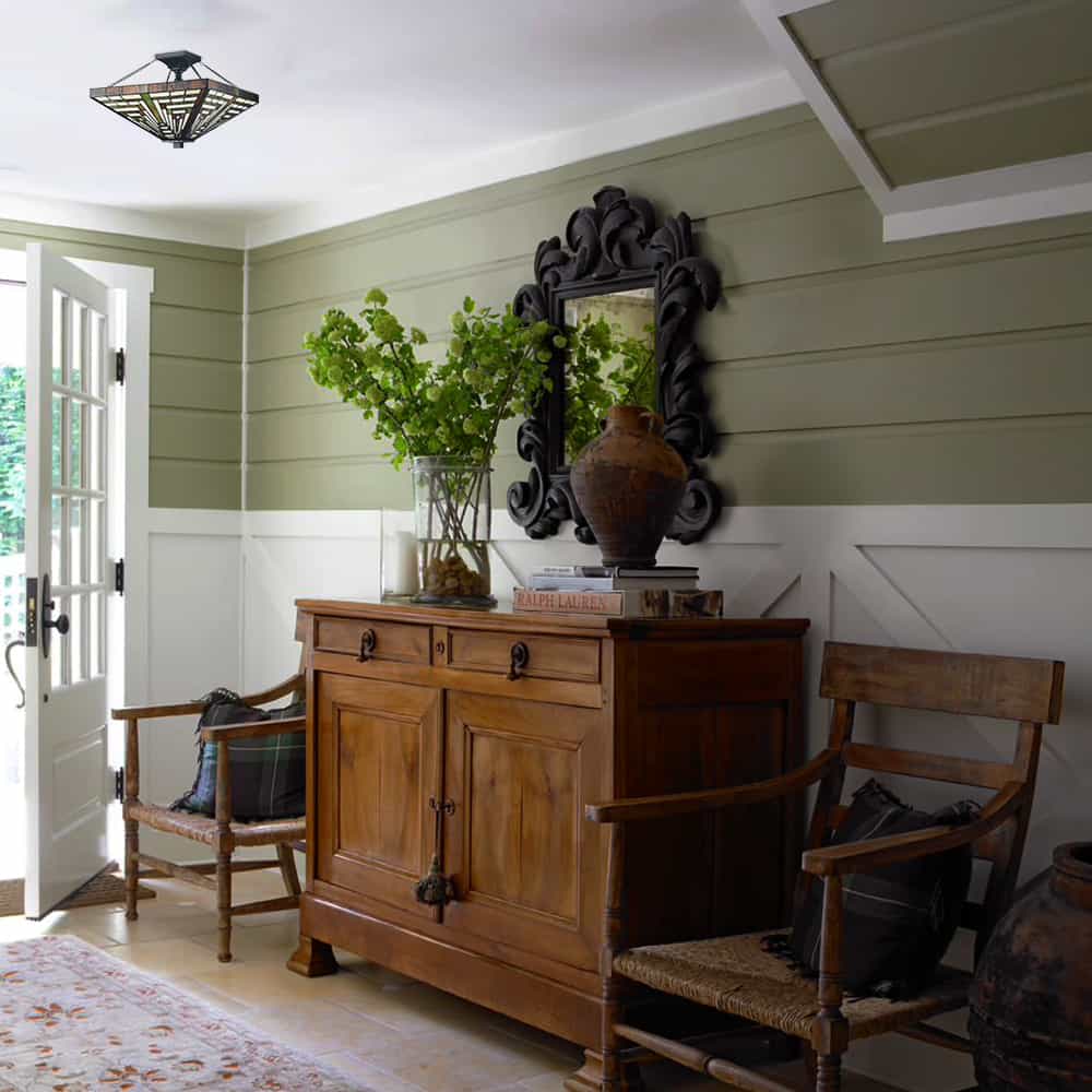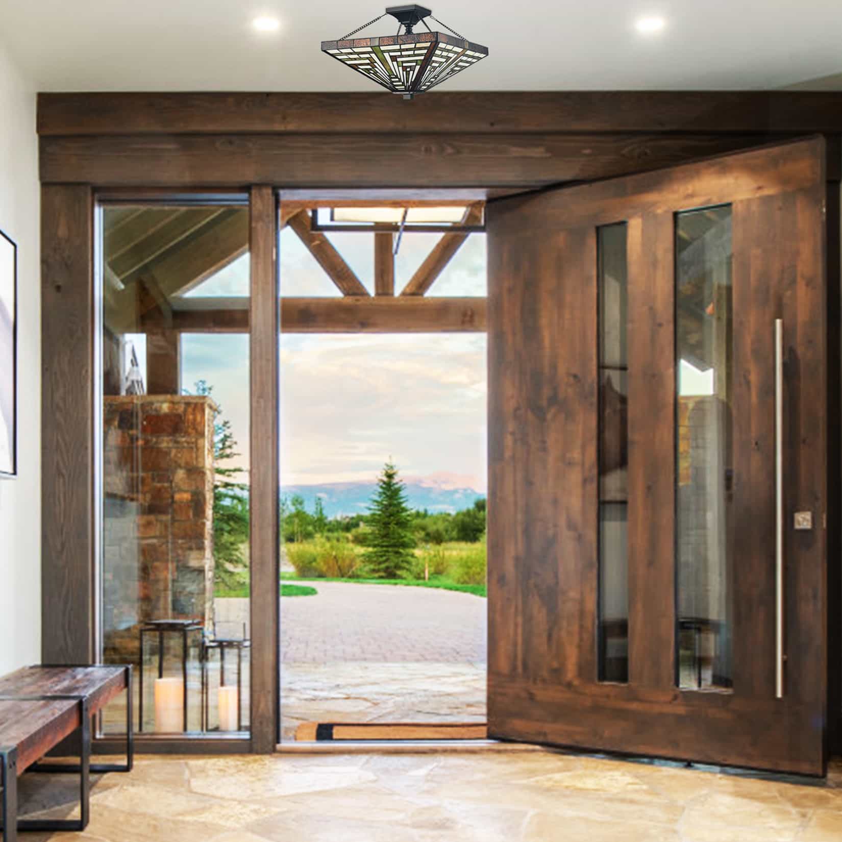 We were looking for a Tiffany glass style semi-flush mount light in this size but were having difficulty finding one with a large shade like this one. It looks nice in the entryway of our new house. I only wish the area beneath the finial was more decorative. This area is shown in the close up phot I posted. Overall I am happy with it.