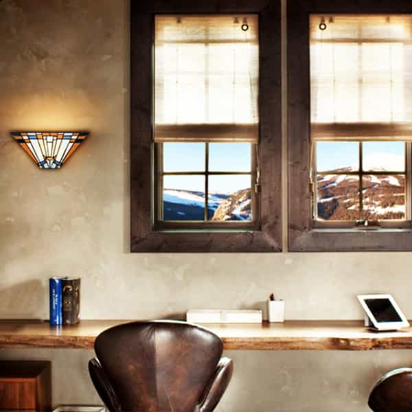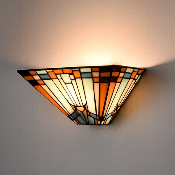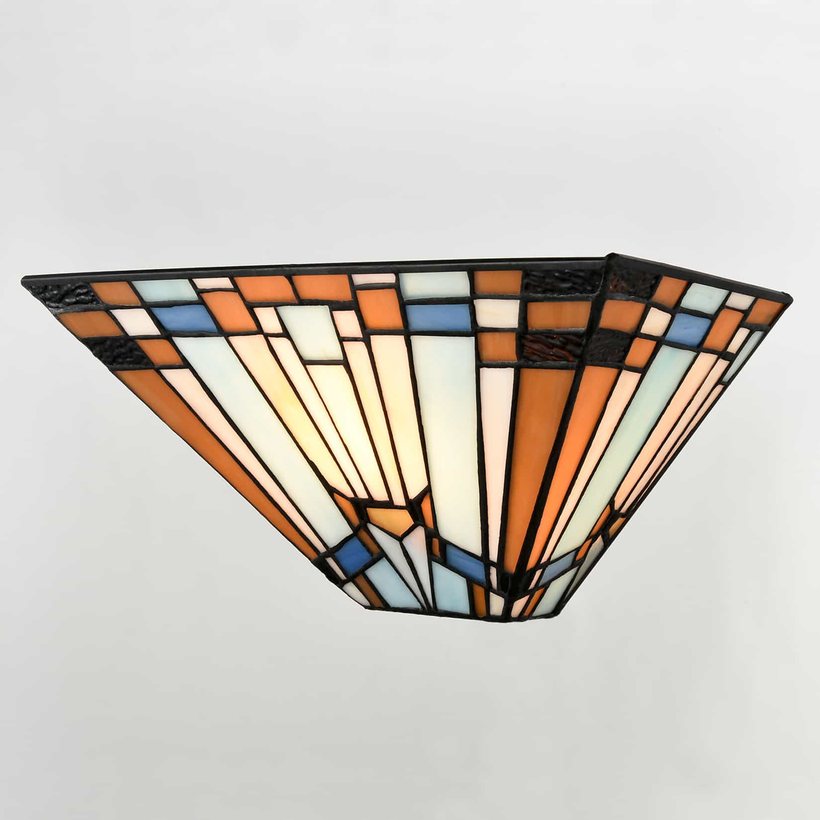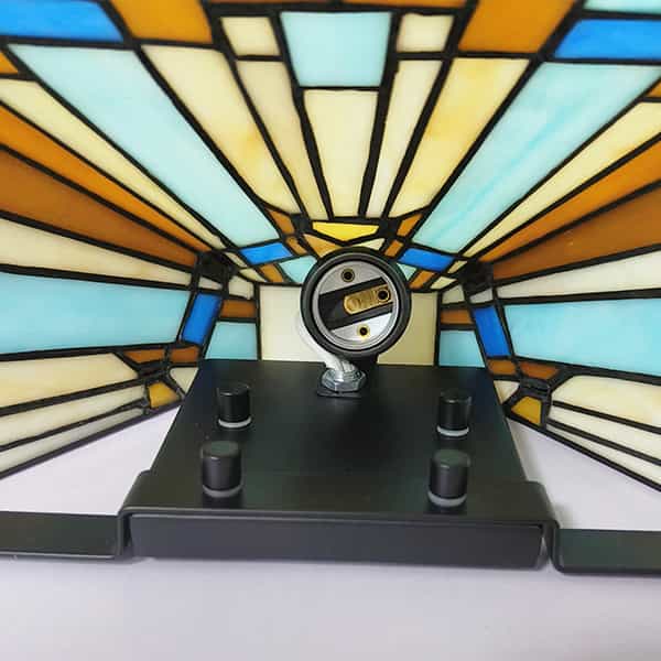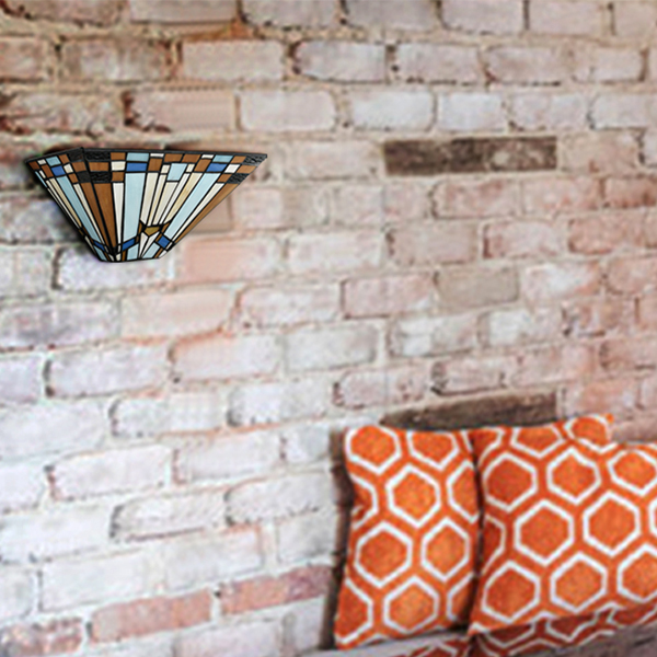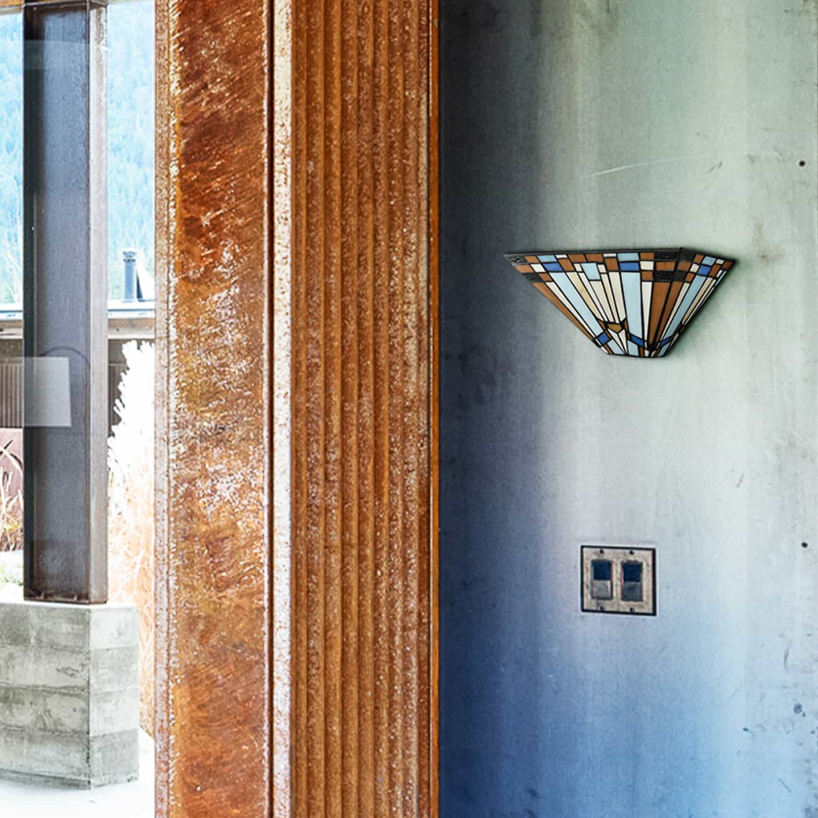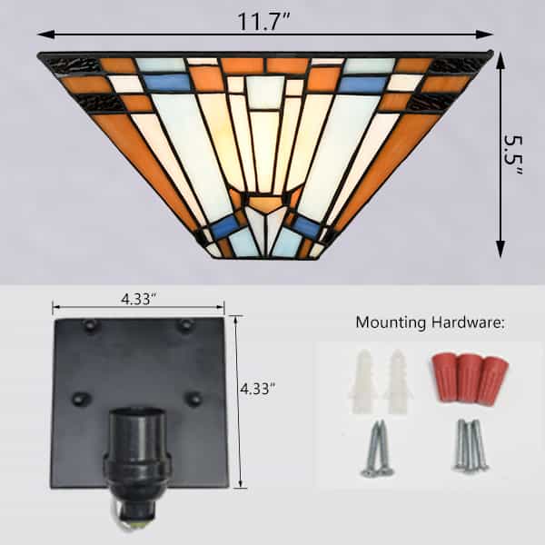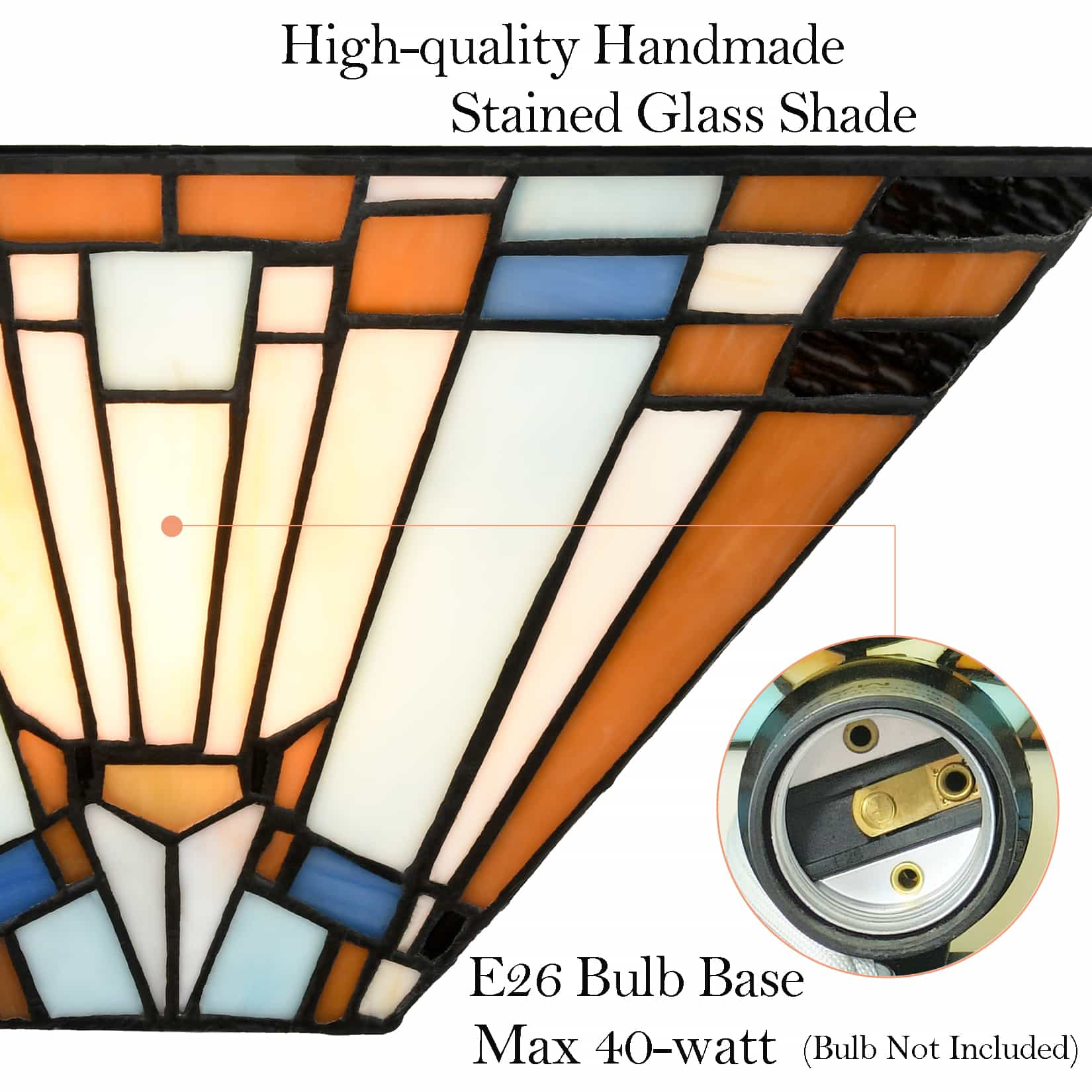The stained glass wall sconce's canopy and lamp holder sport a black finish, livening up your interior with a touch of modern sophistication. It contains a number of hand-cut pieces of stained glass, each wrapped in fine copper foil. It shows off the art nouveau-inspired patterns and the craftsman and mission style. Incorporating both artistic charm and rich colors, it adds an instant touch of style and drama to any room. It allows the light to gently filter through the stained glass shade and casts intriguing light effects and shades. The dark-colored detailing on the glass shade contrasts the brisk colors, which adds a ton of eye appeal to the interior. Its three-sided silhouette brings both stunning decorative elements and a touch of geometry.