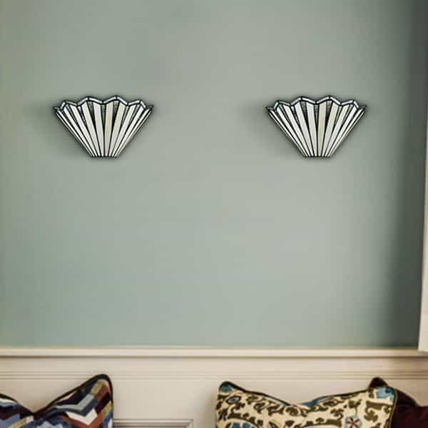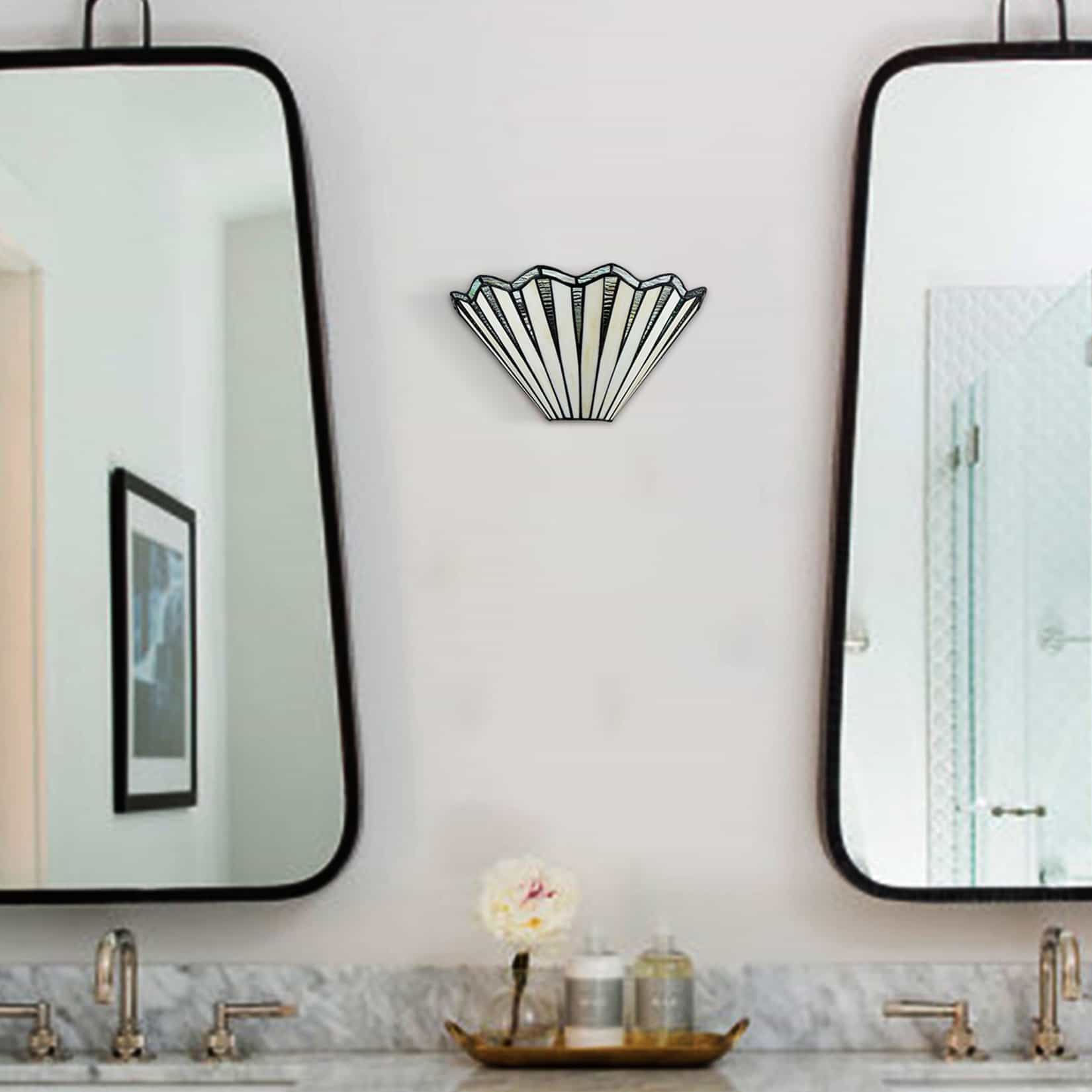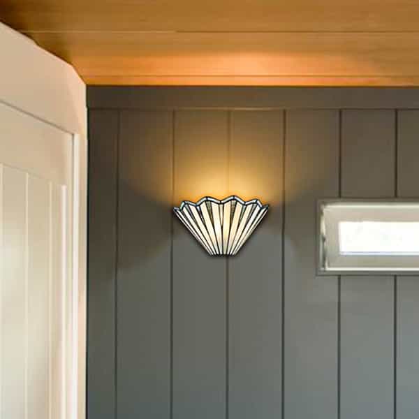 The Tiffany sconce's canopy and lamp holder sports a black finish, livening up your interior with a touch of modern sophistication. It contains a number of hand-cut pieces of stained glass, each wrapped in fine copper foil. It is exquisitely crafted using high-quality materials and exceptional workmanship. It offers a sense of movement to the interior with the wavy accent on the top of the lampshade. Its dark-colored detailing on the glass shade contrasts the brisk colors, which adds a ton of eye appeal and enhances the piece's visual depth and beauty even further. It allows the light to gently filter through the glass shade and casts intriguing light effects. Its rounded silhouette brings both stunning decorative elements and a touch of geometry.