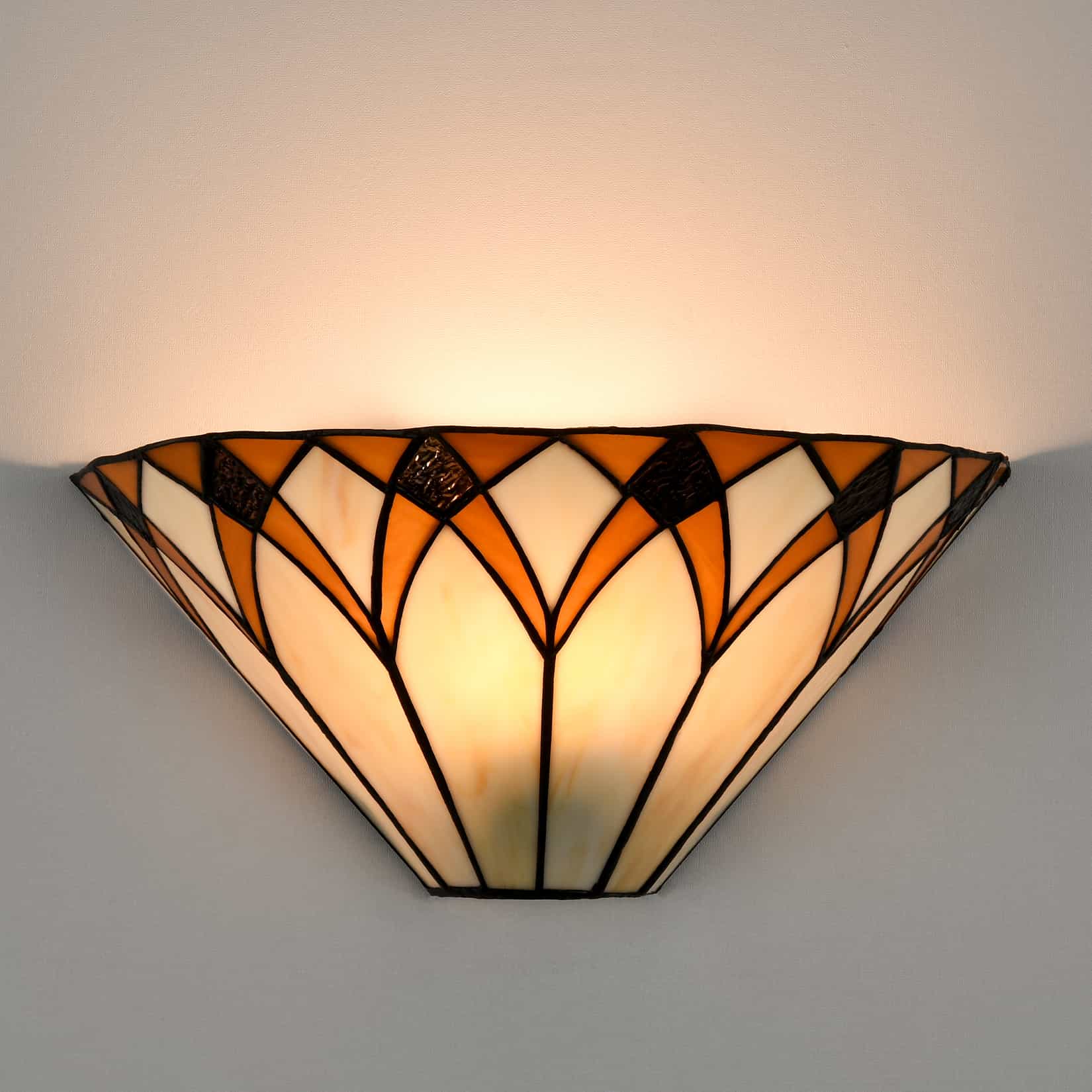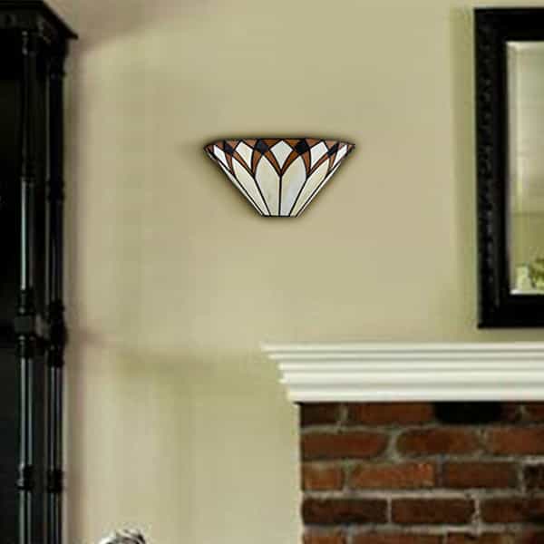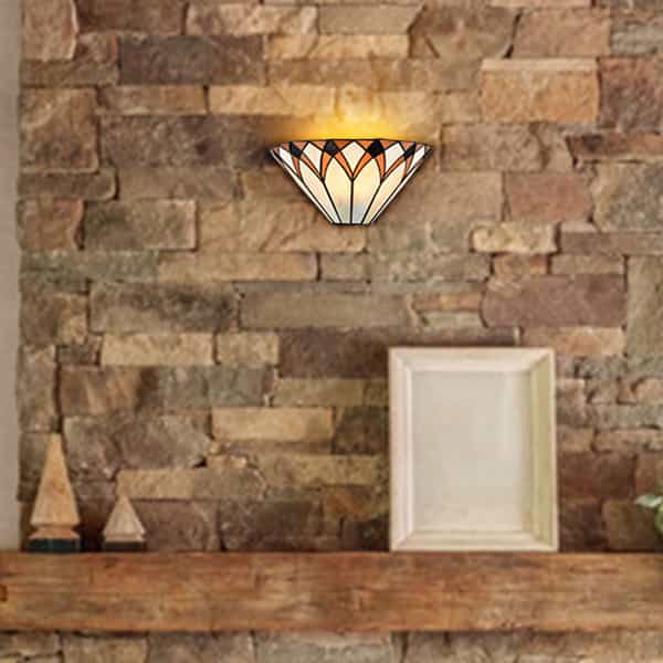 The Tiffany wall sconce's canopy and lamp holder sport a black finish, livening up your interior with a touch of modern sophistication. It contains a number of hand-cut pieces of stained glass, each wrapped in fine copper foil. It is exquisitely crafted using high-quality materials and exceptional workmanship. It shows off the art nouveau-inspired patterns and the craftsman and mission style. Its dark-colored detailing on the glass shade contrasts the brisk colors, which adds a ton of eye appeal and enhances the piece's visual depth and beauty even further. It allows the light to gently filter through the glass shade and casts intriguing light effects. Its rounded silhouette brings both stunning decorative elements and a touch of geometry.