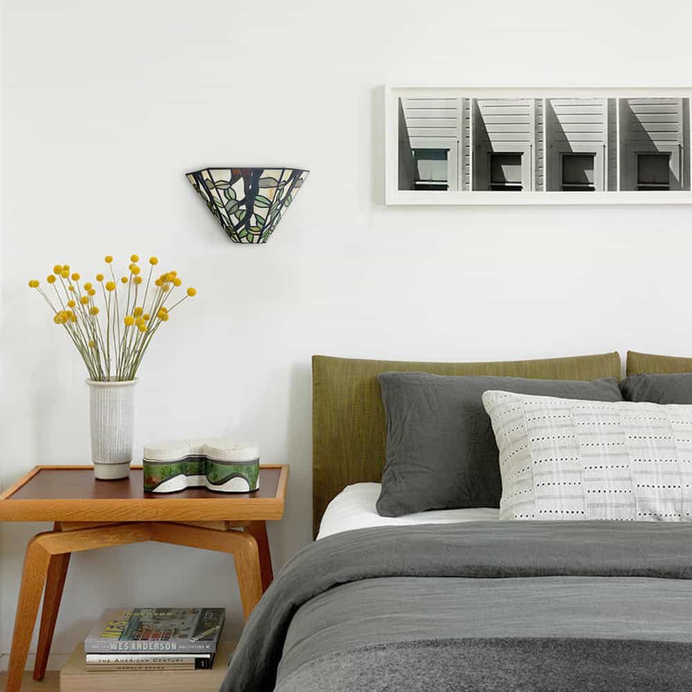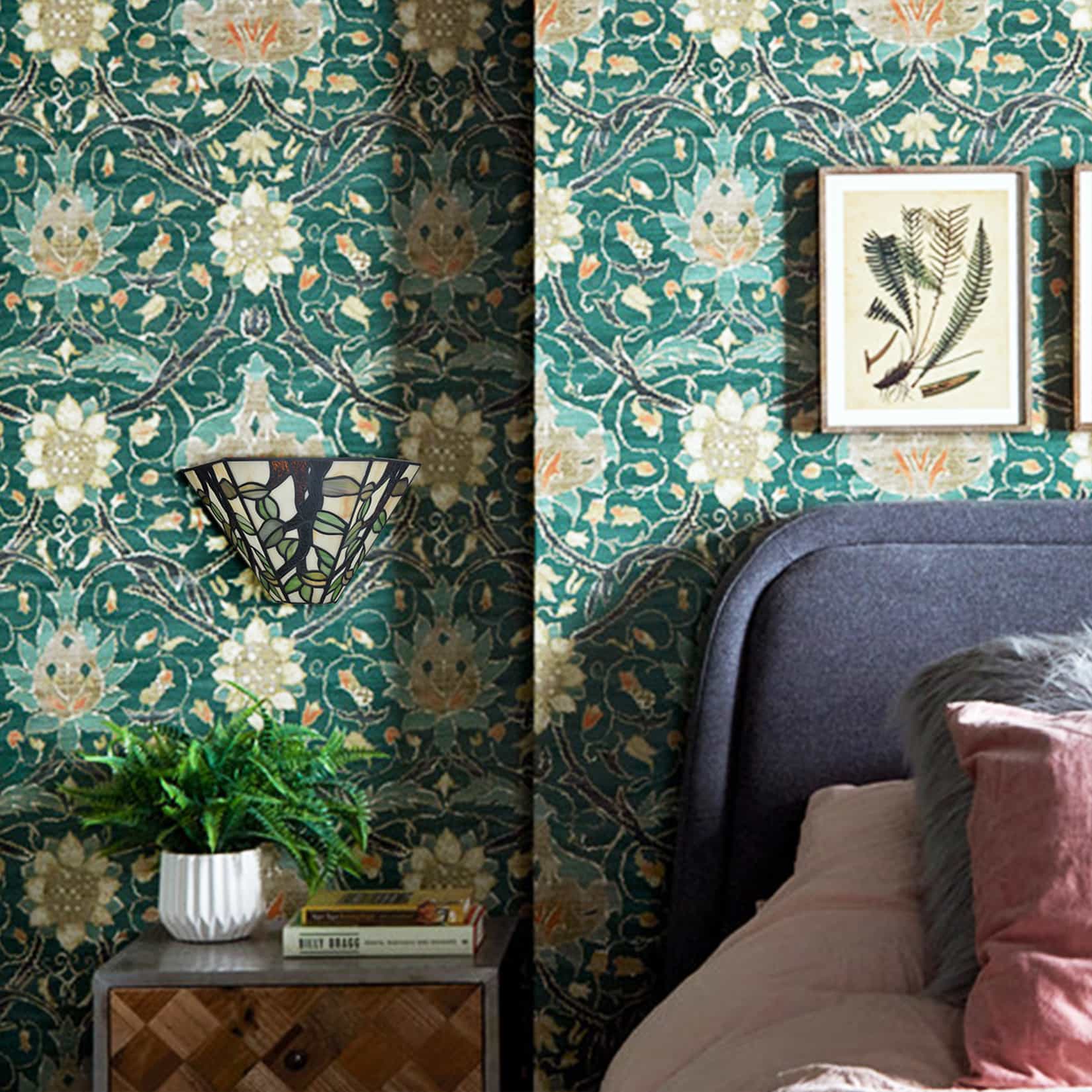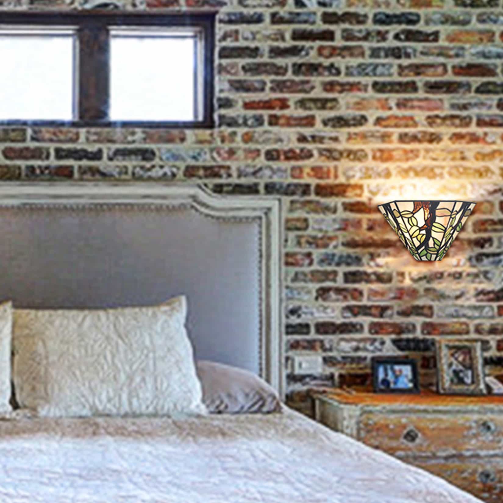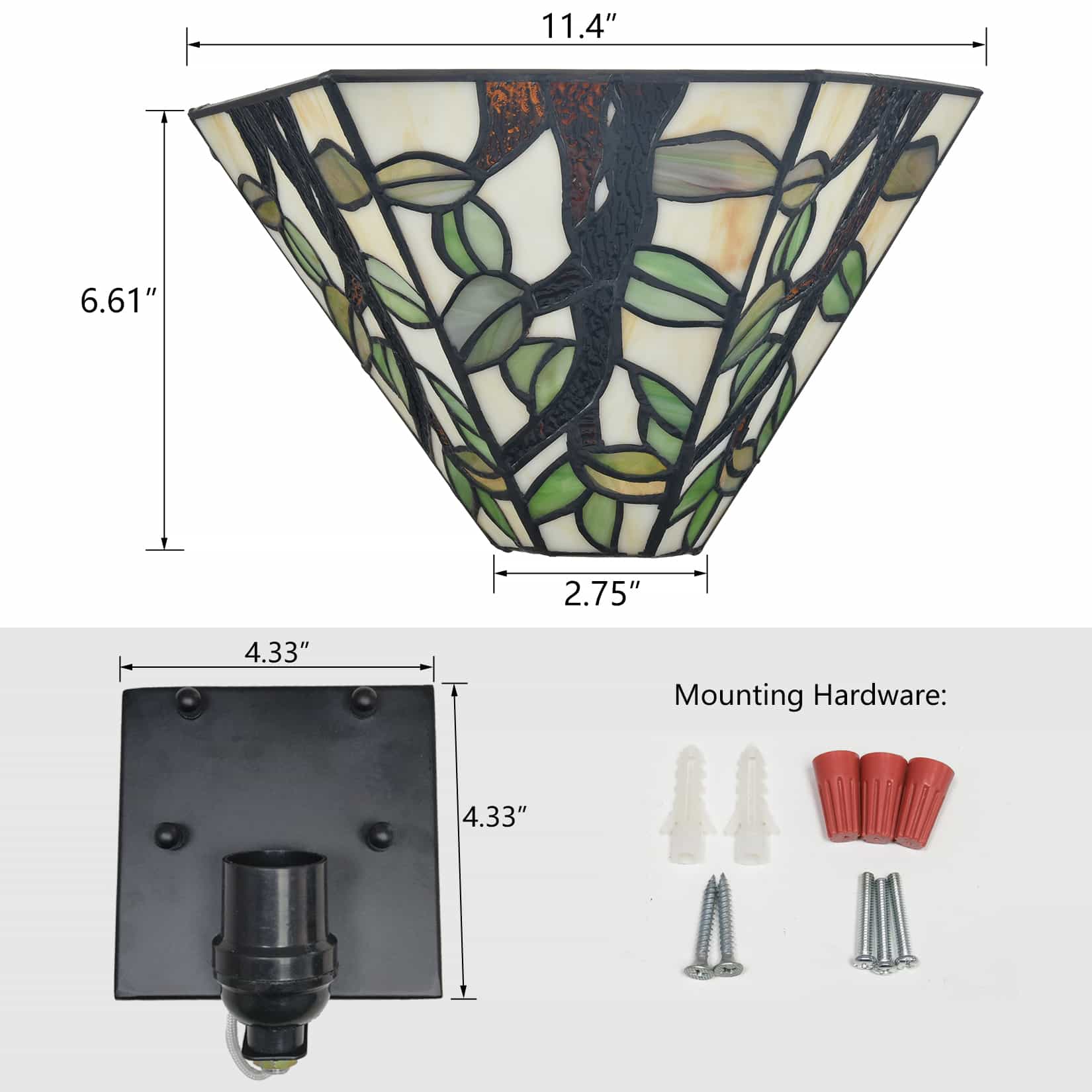 The Tiffany wall sconce's canopy and lamp holder sport a semigloss black finish, giving your living space a touch of urban sophistication. Featuring the copper foil technique, it is crafted of impurity-free hand-blown stained glass. The expertly handcrafted glass shade shows off the art nouveau-inspired patterns and the craftsman and mission style. The dark-colored detailing on the glass shade contrasts the brisk colors, which adds a ton of eye appeal and enhances the piece's visual depth and beauty even further. Its three-sided silhouette brings both stunning decorative detail and a touch of geometry.