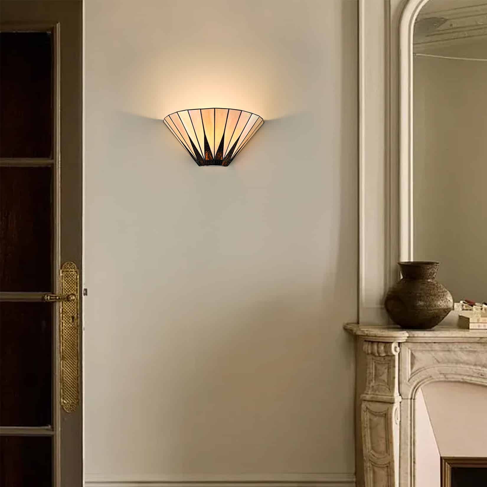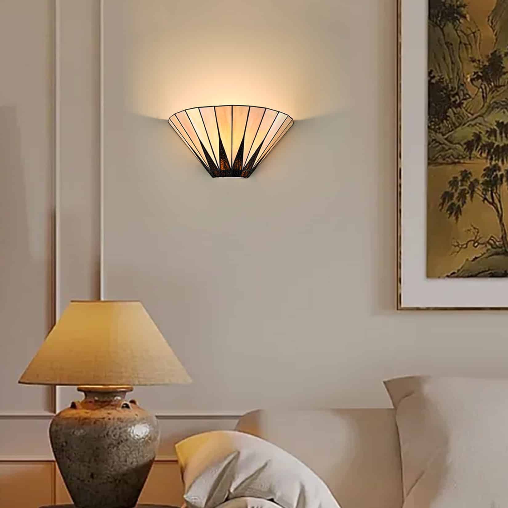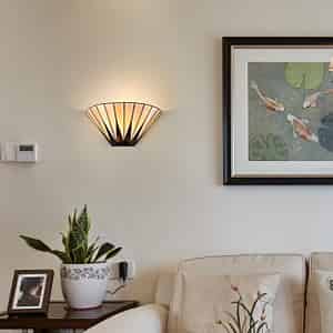 The Tiffany style wall sconce's canopy and lamp holder sport a black finish, livening up your interior with a touch of modern sophistication. It contains a number of hand-cut pieces of stained glass, each wrapped in fine copper foil. It is exquisitely crafted with high-quality materials and exceptional workmanship. It shows off the art nouveau-inspired patterns and mission style. Its dark-colored detailing on the glass shade contrasts the brisk colors, which adds a ton of eye appeal and enhances the piece's visual depth and beauty even further. It allows the light to gently filter through the stained glass shade and casts intriguing light effects. Its rounded silhouette brings stunning decorative elements and a touch of geometry.