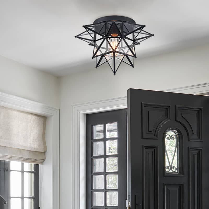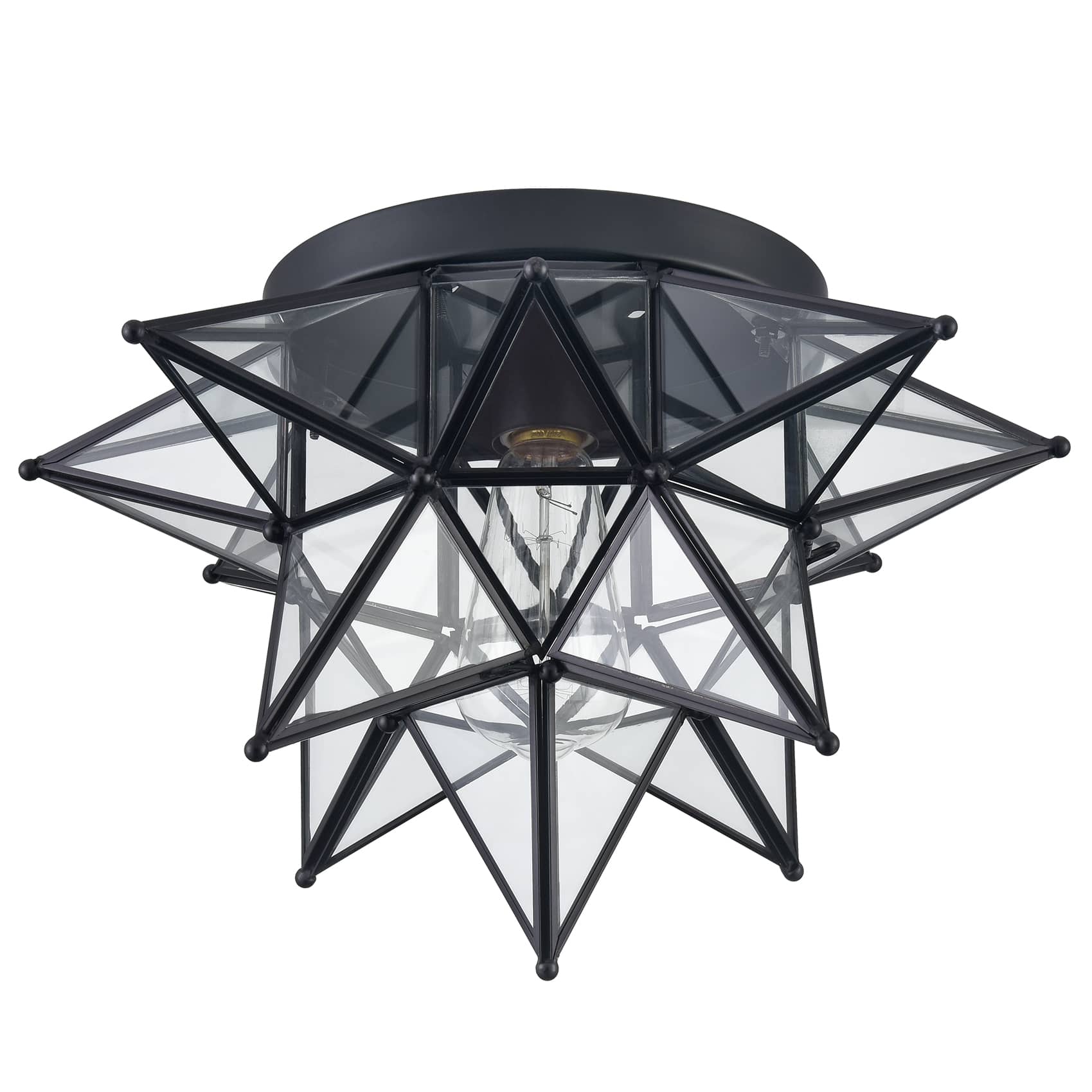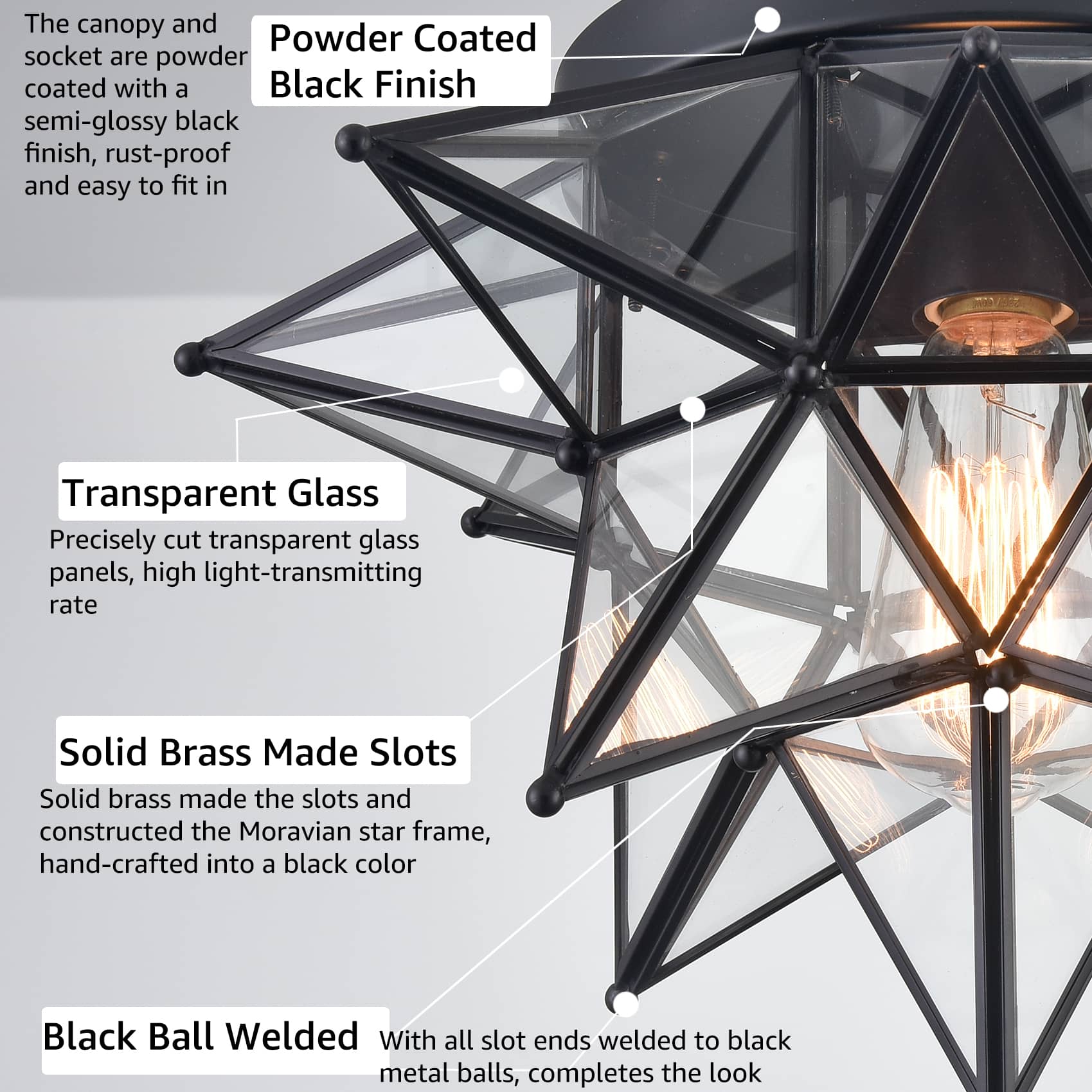 Crafted of impurity-free clear glass, the glass shade of the Moravian star flush mount ceiling light is exquisitely hand-welded and pairs nicely with the black edges featuring copper alloy covering. Showing off a rustproof semigloss black finish, it brings a dash of drama to your interior. Its stellated multi-point design adds an element of surprise and whimsy to your living space. A hinged access door can be opened for bulb replacement. The clear glass shade emits a welcoming and delicate glow to create a wonderful ambiance. Its glass shade contrasts the black finish and adds alluring visual interest to the living area.