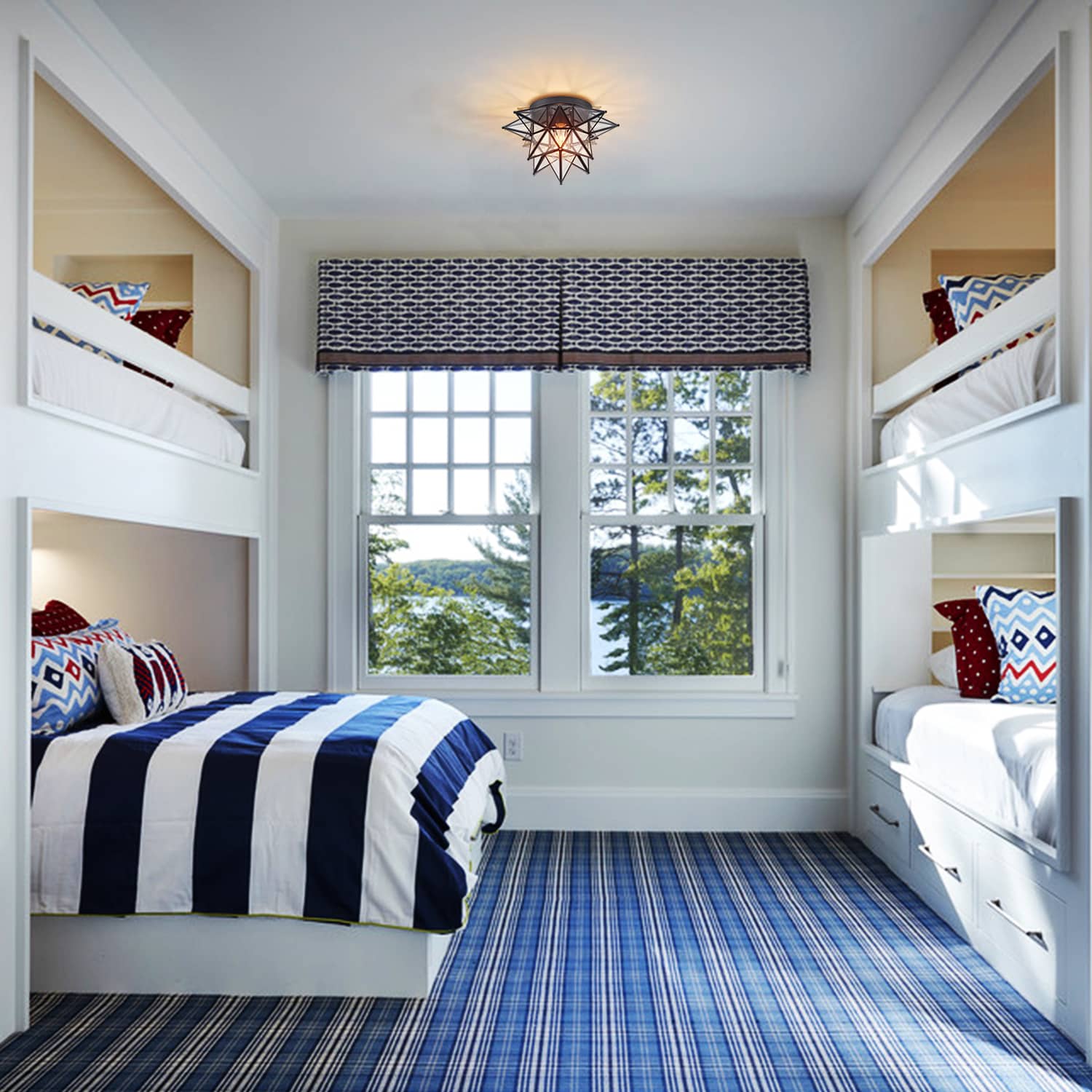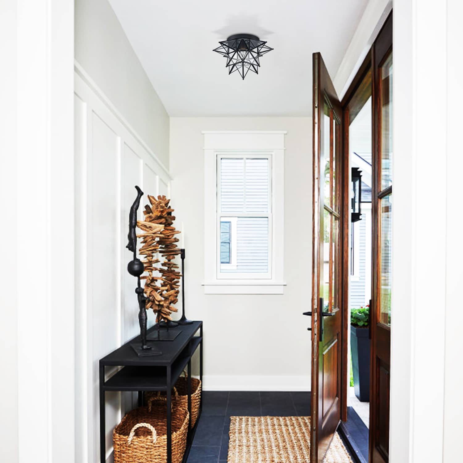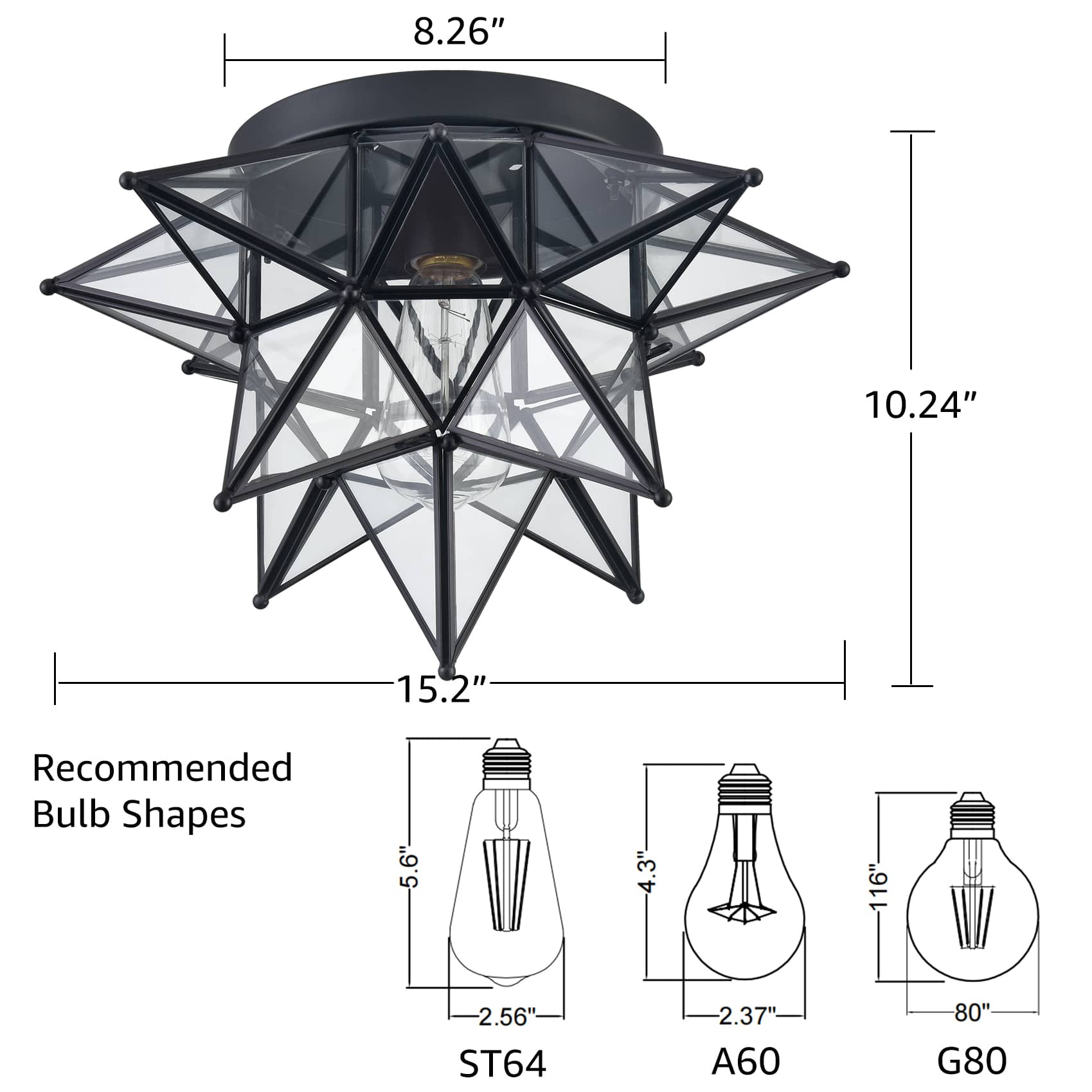 Crafted of impurity-free clear glass, the glass shade of the Moravian star flush mount ceiling light is exquisitely hand-welded and pairs nicely with the black edges featuring copper alloy covering. Showing off a rustproof semigloss black finish, it brings a dash of drama to your interior. Its stellated multi-point design adds an element of surprise and whimsy to your living space. A hinged access door can be opened for bulb replacement. The clear glass shade emits a welcoming and delicate glow to create a wonderful ambiance. Its glass shade contrasts the black finish and adds alluring visual interest to the living area.