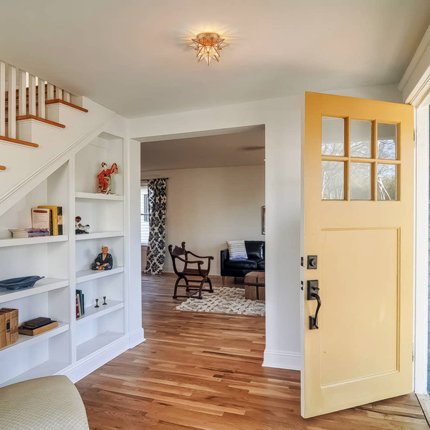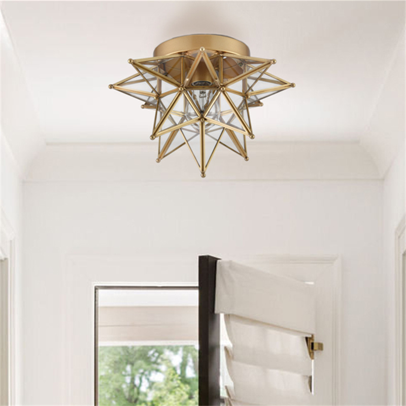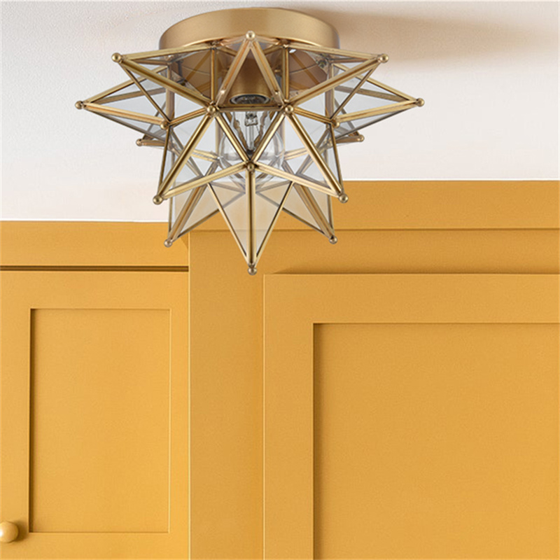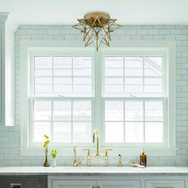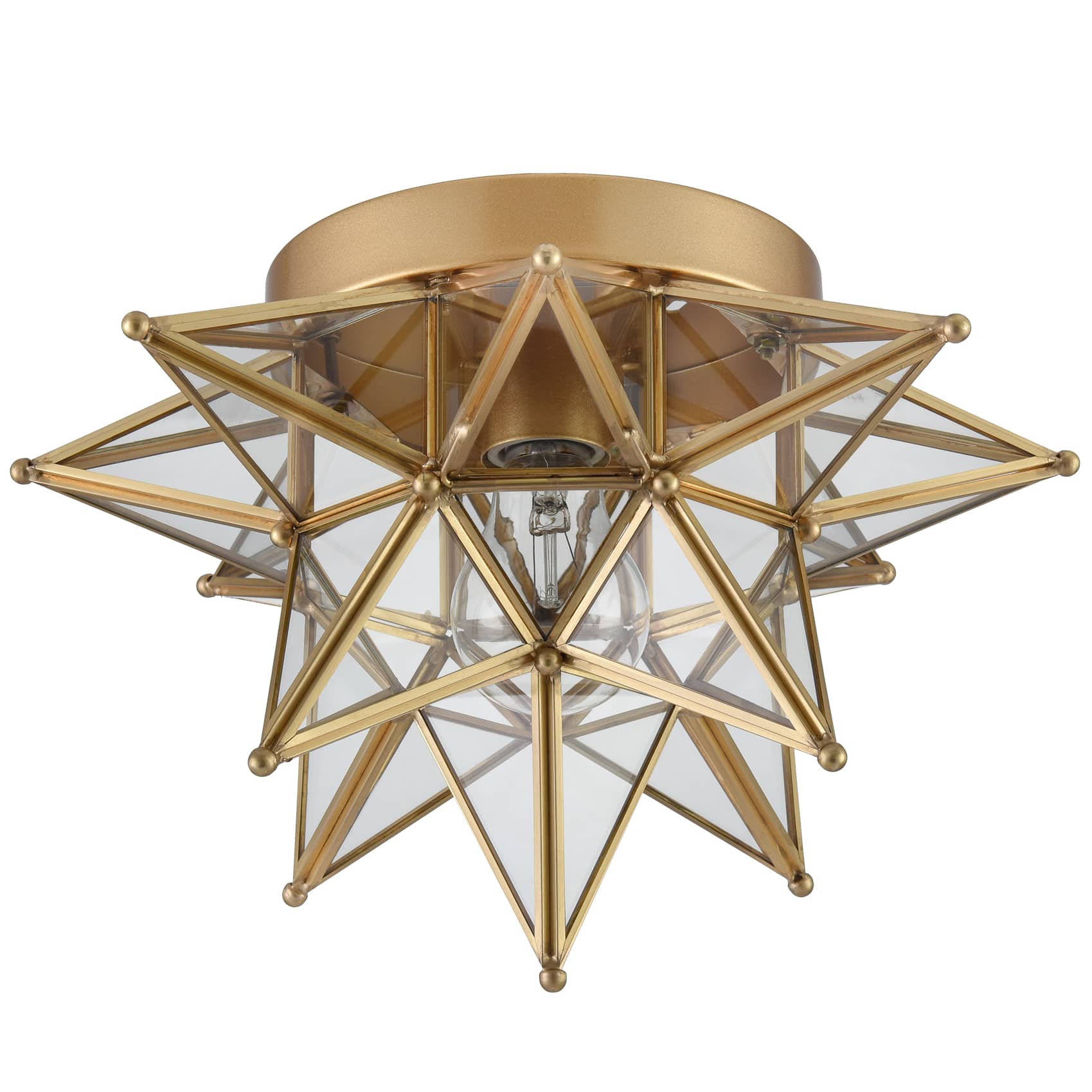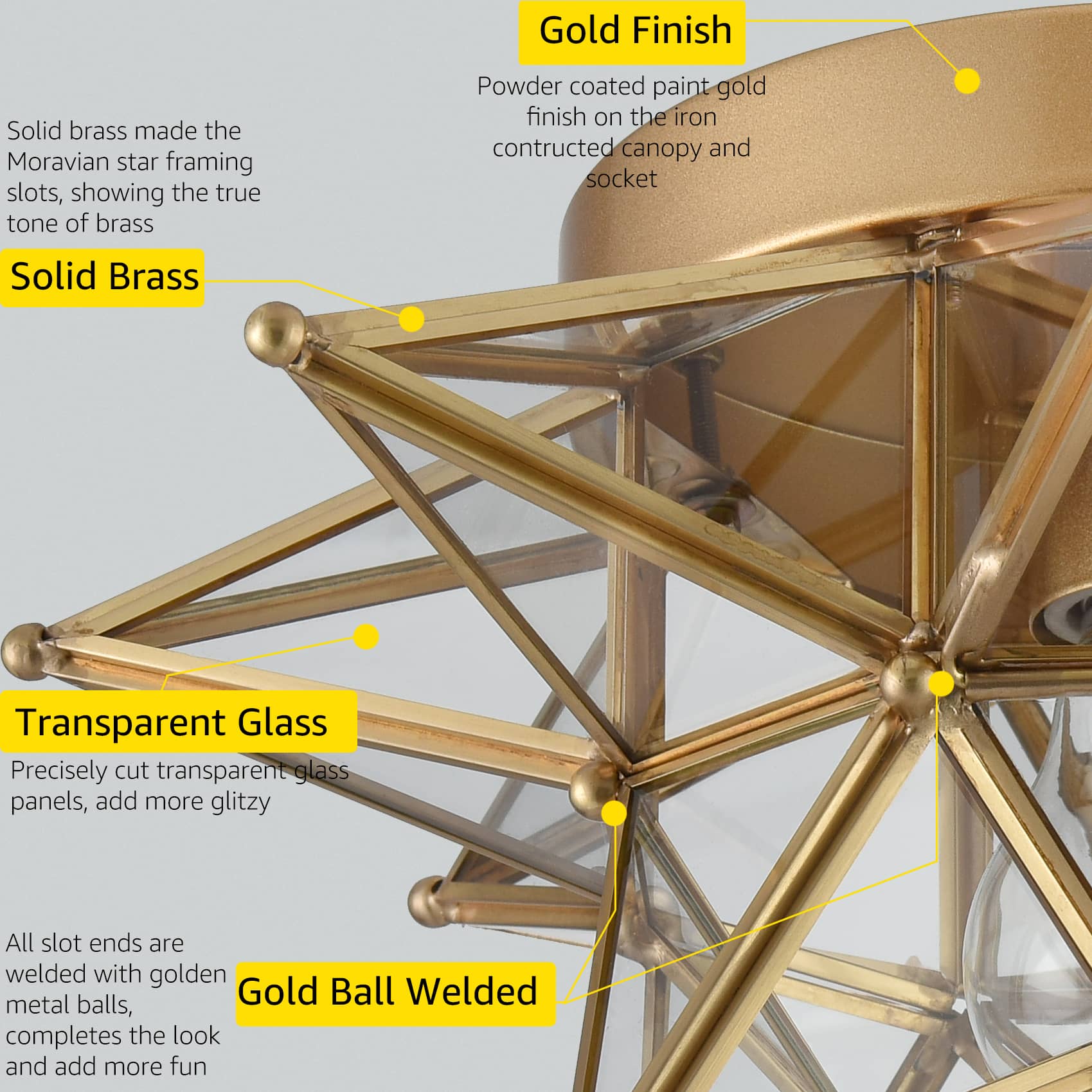 Crafted of impurity-free clear glass, the glass shade of the brass Moravian star ceiling light is exquisitely hand-welded and pairs nicely with the gold edges featuring copper alloy covering. Showing off a rustproof gold finish, it peps up your interior with a touch of sparkle. Its stellated multi-point design adds an element of surprise and whimsy to your living space. A hinged access door can be opened for bulb replacement. Its glass shade contrasts the brass finish and adds alluring visual interest to the living area.