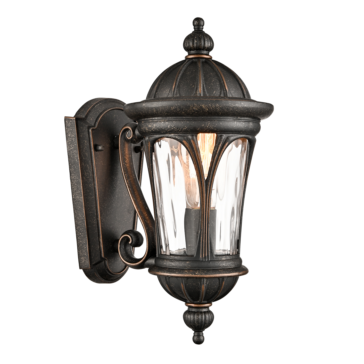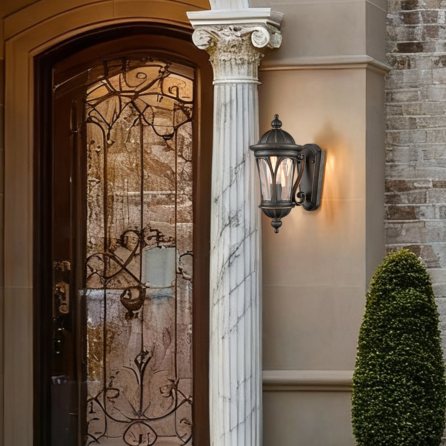 Flaunting a brownish black finish with a gold tinge, the outdoor wall light fixture lends a dash of drama to your alfresco space. Its cylindrical water ripple glass panels show off the beauty of geometry and provide a ton of eye appeal. The light fixture’s framing accents gracefully embrace its opaque, impurity-free, hand-blown glass panels, bringing stunning decorative detail to the outdoor space. Constructed of solid aluminum and glass, it is rust-proof and durable. Its elegantly curved arm adds the right amount of splendor to any space. Its brownish black finish sets it apart from the glass panels and showcases a higher level of sophistication.