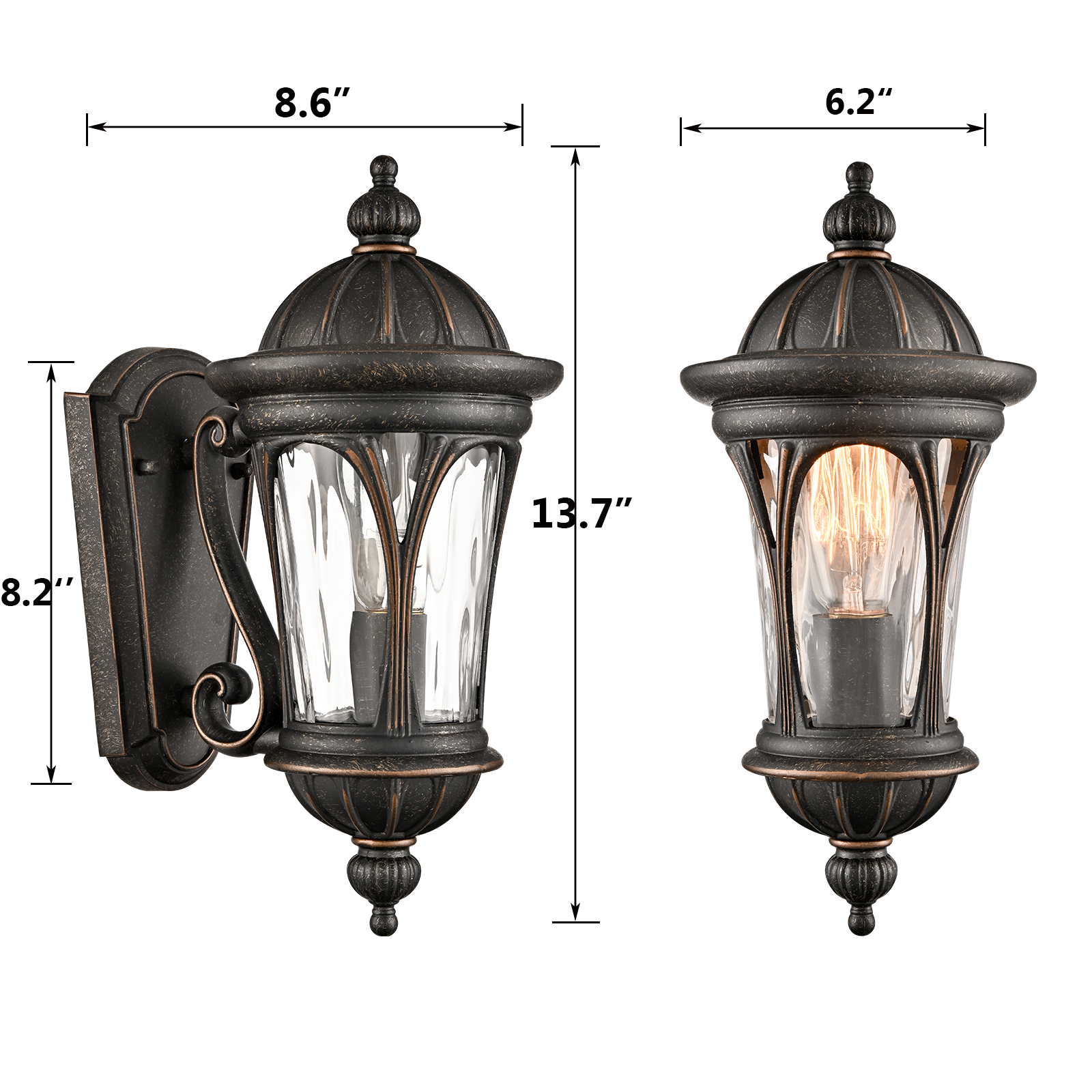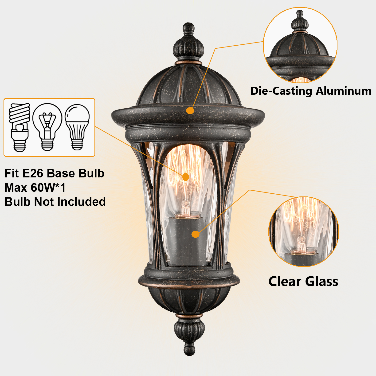 The outdoor wall light comes with 1 E26-base socket, which is compatible with a variety of bulb types: LED, INCANDESCENT, CFL.